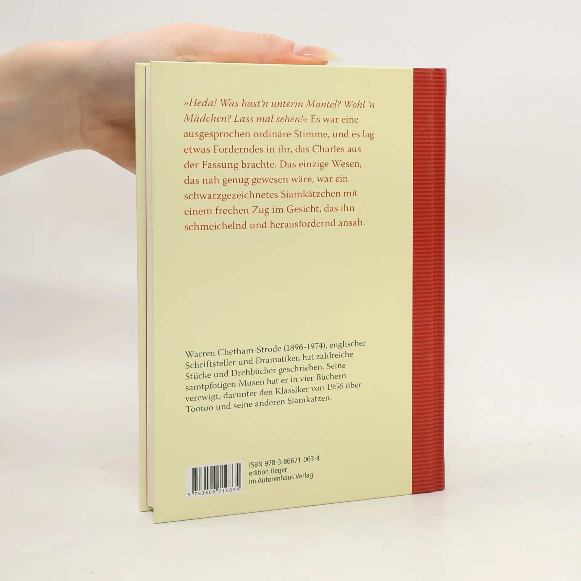 Der Schriftsteller Charles Warren fürchtet, den Verstand zu verlieren, nachdem ihn auf einer Katzenausstellung ein junger Siamkater angesprochen hat. Diese Begegnung führt zu einer Schreibblockade, und da er kein Manuskript mehr abliefert, wird das Geld knapp. Während er über sich nachdenkt, fragt er sich, ob er kurz vor dem Wahnsinn steht. In der Familie Warren leben bereits die distinguierten Siamherren Ting und Thai, die an ein geordnetes Leben gewöhnt sind. Doch die Ankunft der neuen Mitbewohner Tania und Tootoo bringt Unruhe. Tania, das hübsche Katzenmädchen, wird schnell akzeptiert, während Tootoo, der sich als edel ausgibt, jedoch mit einem ordinären Cockneydialekt spricht und sich unpassend verhält. Sein Macho-Verhalten steht im Kontrast zu Ting und Thai, die ihre Männlichkeit verloren haben. Mary, die Hausherrin, glaubt, die Katzensprache zu verstehen und hat eigene Pläne mit Tania und Tootoo. Während Tanias Rolligkeit öffnet sie zufällig das Gitter zu ihrer Isolierzelle im Gartenhaus. Tootoo bedankt sich ironisch bei Mary, was die humorvolle Note des Romans unterstreicht, in dem Katzen sprechen und Menschen glauben, sie zu verstehen.