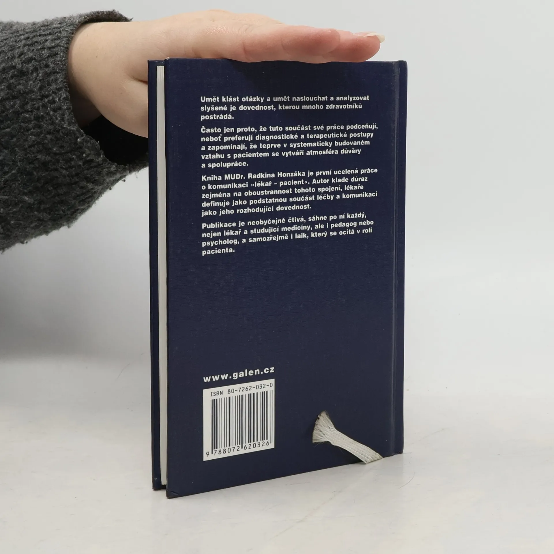 Umět klást otázky a umět naslouchat a analyzovat slyšené je dovednost, kterou mnoho zdravotníků postrádá. Často jen proto, že tuto součást své práce podceňují, neboť preferují diagnostické a terapeutické postupy a zapomínají, že teprve v systematicky budovaném vztahu s pacientem se vytváří atmosféra důvěry a spolupráce. Kniha MUDr. Radkina Honzáka, která v roce 1999 obdržela Cenu Nadace Janssen-Cilag, je první ucelená práce o komunikaci lékař - pacient. Autor klade důraz zejména na oboustrannost tohoto spojení, lékaře definuje jako podstatnou součást léčby a komunikaci jako jeho rozhodující dovednost. Publikace je neobyčejně čtivá, sáhne po ní každý, nejen lékař a studující medicíny, ale i pedagog nebo psycholog, a samozřejmě i laik, který se ocitá v roli pacienta.