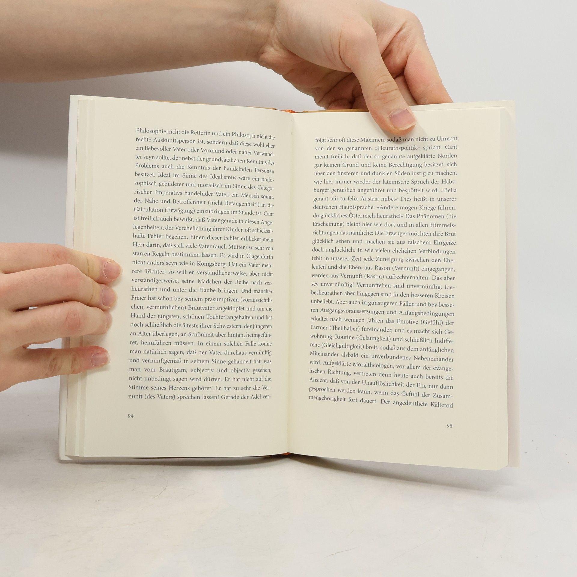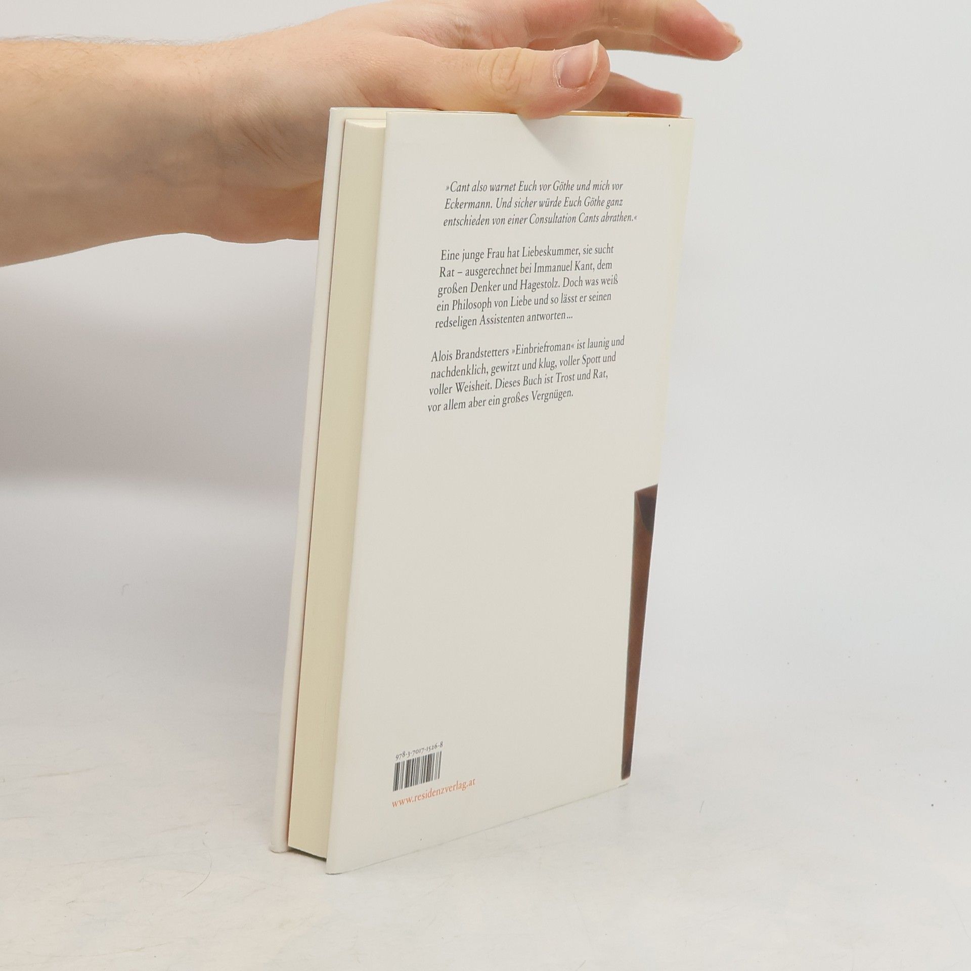 Im August 1791 schreibt Maria von Herbert aus Klagenfurt einen Brief an Immanuel Kant nach Königsberg. Sie bittet den alternden Junggesellen inständig um Trost und Rat – sie hat Liebeskummer. Das ist historisch belegt. Kants junger, redseliger Assistent antwortet ihr im Auftrag des großen Meisters und er geht dabei freilich vor allem auf Probleme ein, die die junge Frau gar nicht plagen. Das ist brandstetterisch belegt. Aus der „Menschenkunde in pragmatischer Hinsicht“ sinniert er über allerlei Sonderbares, Absonderliches und Kurioses. Etwa über die Frage, ob man Kant bewundern kann, wenn man Goethe bewundert (und umgekehrt). Oder die Vorstellungen des Philosophen vom „schönen Geschlecht“, das ihm wohl gefällt, das ihn aber nicht weiter interessiert. Und nicht zuletzt über die Frage, die zumindest uns alle betrifft: Wie werde ich meinen Liebeskummer los? Alois Brandstetters „Einbriefroman“ ist launig und nachdenklich, gewitzt und klug, voller Spott und voller Weisheit. Dieses Buch ist Trost und Rat, vor allem aber ein großes Vergnügen.