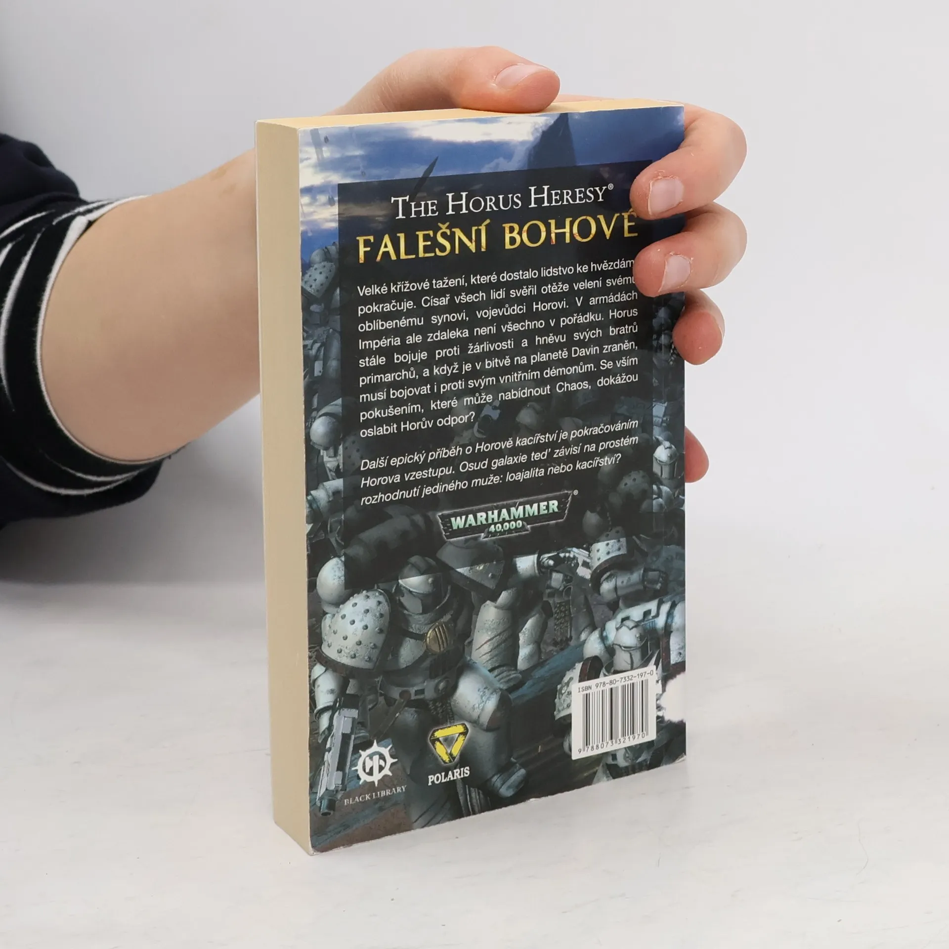Román Falešní bohové pojednává o Horově pádu. V komplikovaném spiknutí zosnovaném přívrženci Chaosu je Horus na měsíci planety Davin zraněn cizáckou, Chaosem otrávenou zbraní. Jeho poručíci jej v zoufalé snaze o jeho záchranu odnesou do chrámu na Davinu. Chrám je však tajně zasvěcen Chaosu a jeho služebníci se postarají, aby se Horus zdánlivě vyléčil, ve skutečnosti však jen ještě více podlehne zhoubnému působení své rány. Nakonec se postaví proti svému „otci", Císaři. Horovo odpadlictví pak spustí sled událostí, které změní galaxii navždy.