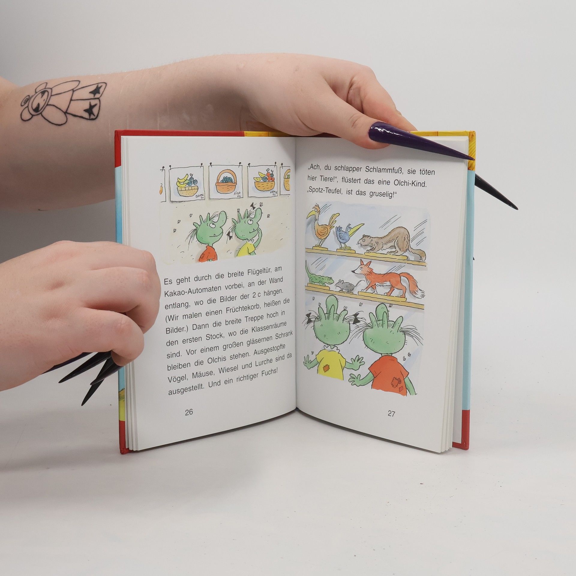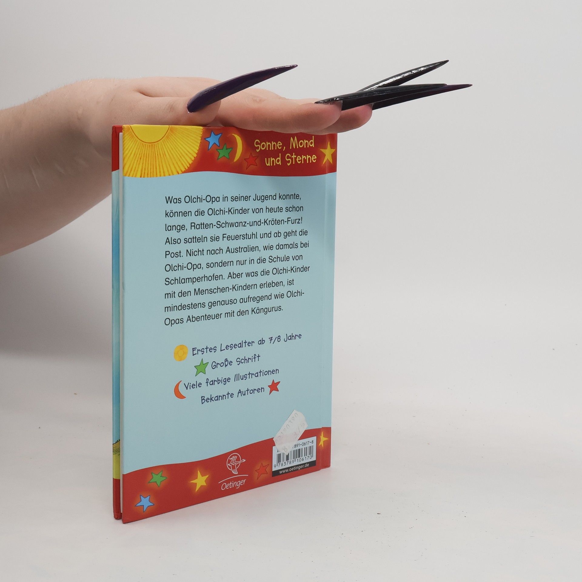 Was Olchi-Opa in seiner Jugend konnte, können Olchi-Kinder von heute schon lange, Ratten-Schwanz-und-Kröten-Furz! Also satteln sie den Reisedrachen und ab geht die Post. Nich nach Australien, wie damals bei Olchi-Opa, sondern nur in die Grundschule von Schlamperhofen. Aber was die Olchi-Kinder da mit den Menschen-Kindern erleben - und die Menschen-Kindern mit den Olchi-Kindern - , ist mindestens genauso aufregend wie Olchi-Opas Abenteuer mit den Kängurus.
