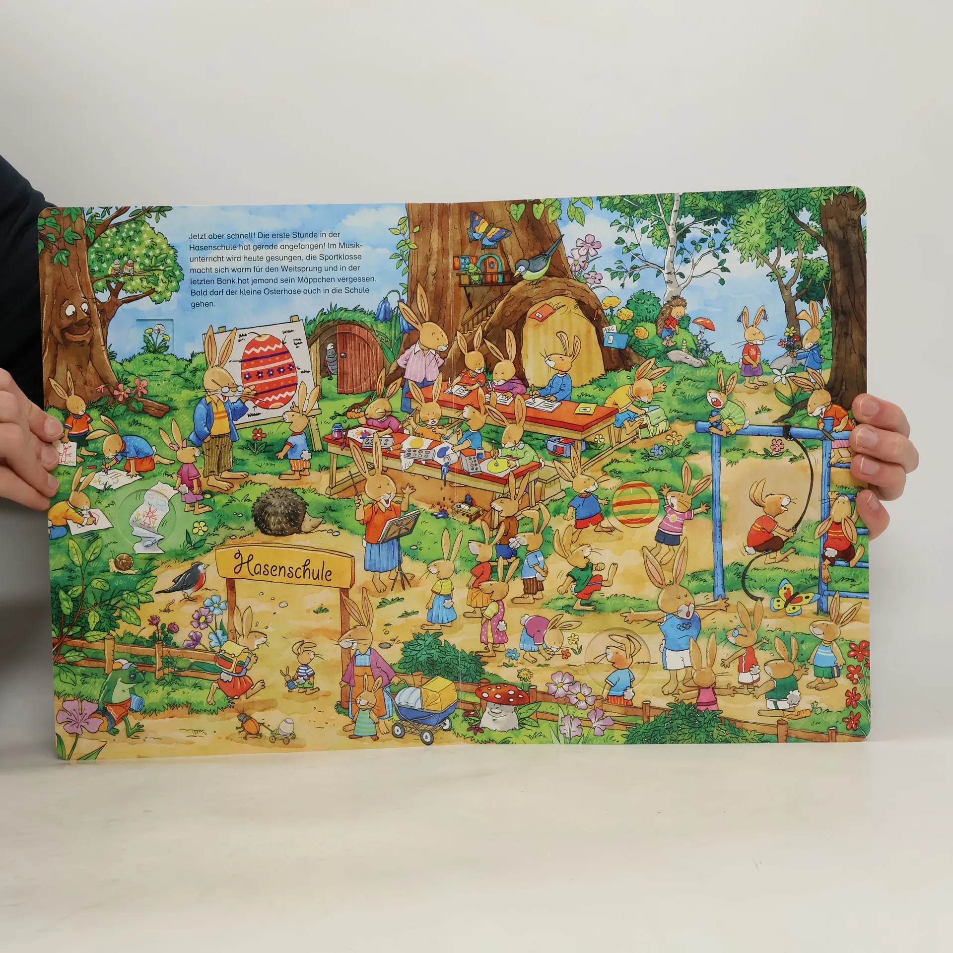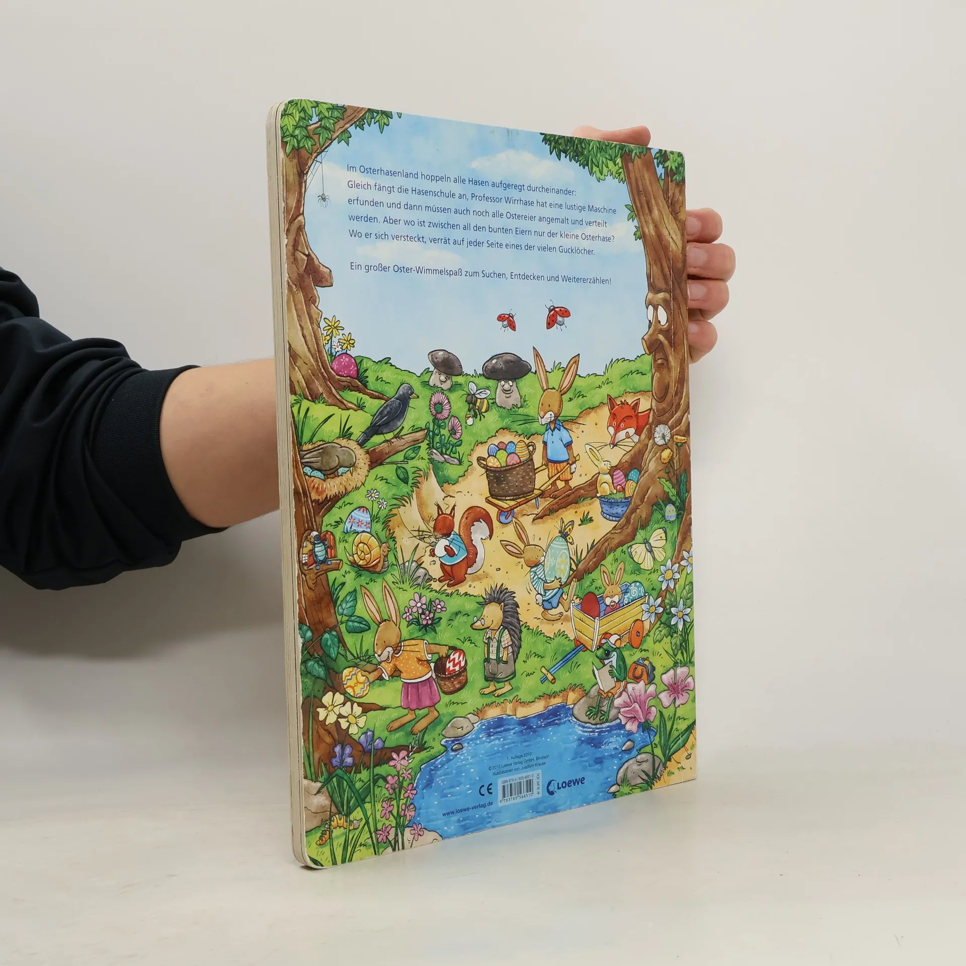 Im Osterhasenland hoppeln alle Hasen aufgeregt durcheinander: Gleich fängt die Hasenschule an, Professor Wirrhase hat eine lustige Maschine erfunden und dann müssen auch noch alle Ostereier angemalt und verteilt werden. Aber wo ist zwischen all den bunten Eiern nur der kleine Osterhase? – Wo er sich versteckt, verrät auf jeder Seite eines der vielen Gucklöcher. Ein großer Oster-Wimmelspaß zum Suchen, Entdecken und Weitererzählen!