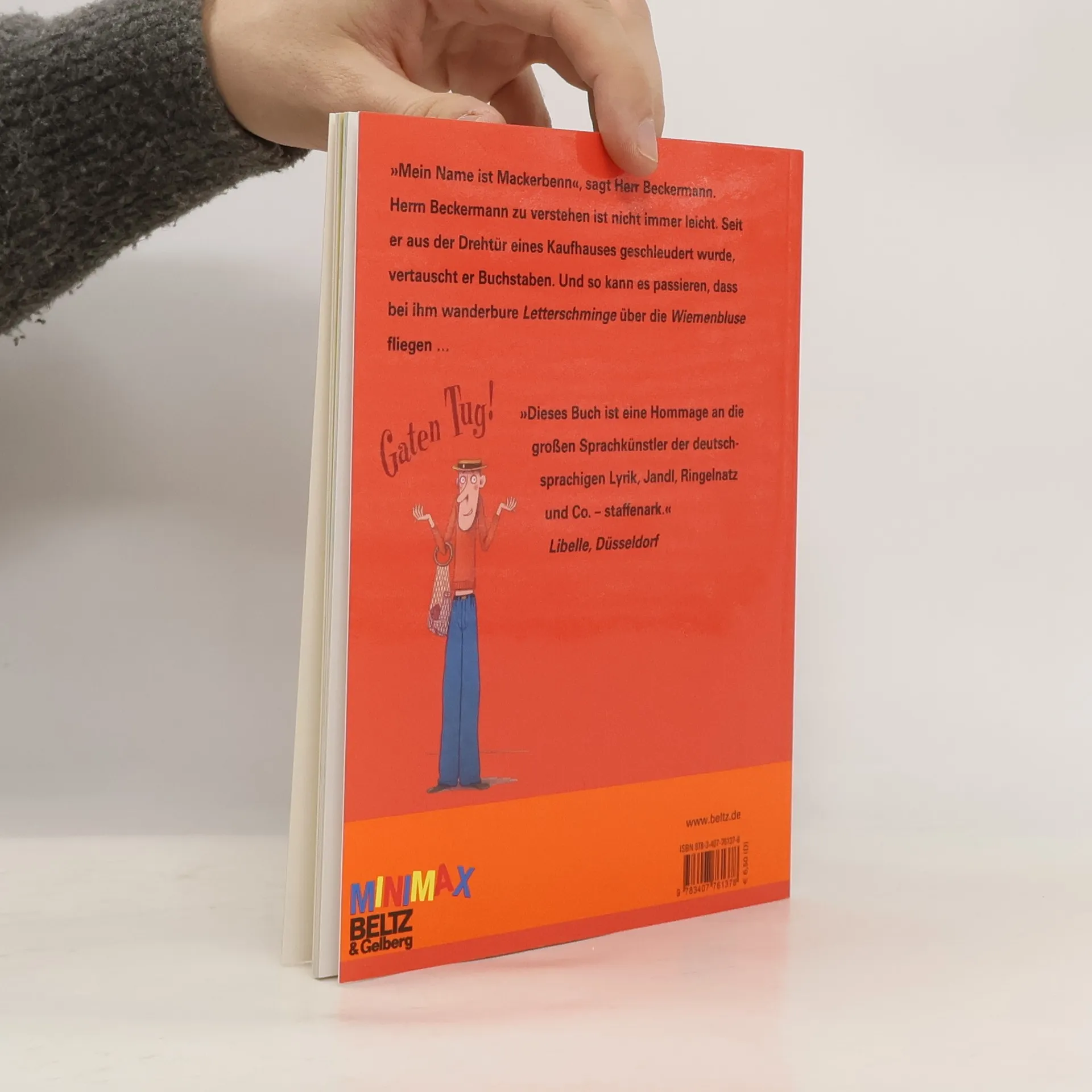 »Uns machte es nichts aus, dass Herr Beckermann die Buchstaben verwechselte. Einmal beugte er sich mit einem Taschentuch zu mir hinunter und sagte: ›Komm, lass dir mal die Puse natzen!‹ Na und?!« »Mein Name ist Mackerbenn«, sagt Herr Beckermann. Herrn Beckermann zu verstehen ist nicht immer leicht. Seit er aus der Drehtür eines Kaufhauses geschleudert wurde, vertauscht er Buchstaben. Und so kann es passieren, dass bei ihm wanderbure Letterschminge über die Wiemenbluse fliegen …