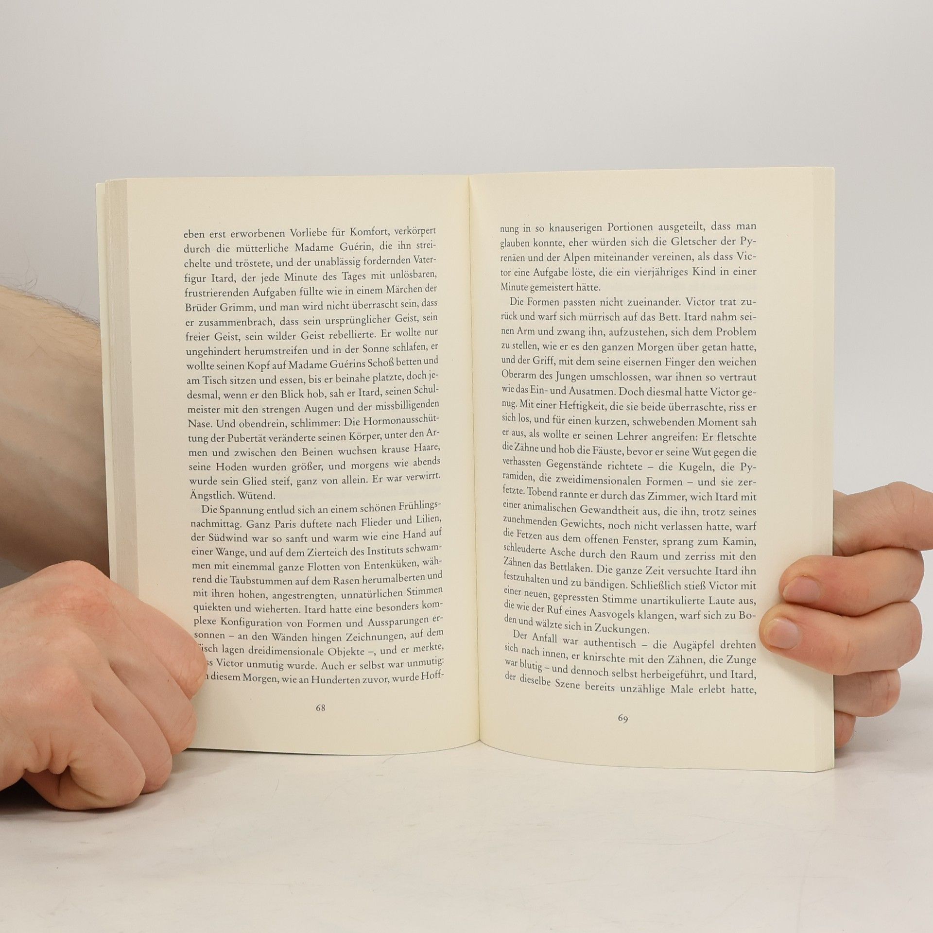 Über das Wolfskind Victor Im Herbst des Jahres 1797, die Jahre der Revolution und des Terrors sind vorbei, stößt der Schmied des Ortes im Wald von Aveyron auf ein nacktes, seltsame Laute ausstoßendes Wesen, die Haut schwarz vor Schmutz, das Haar zottelig. Ein Mensch, ein Tier? Ein Knabe. Die Männer vom Dorf fangen ihn ein, bringen ihn in die Hauptstadt, nach Paris. Man führt ihn bei Hofe vor, er bekommt ein Zimmer in der Taubstummenanstalt und einen Namen. Schließlich wird Victor, das Wolfskind, der Obhut eines jungen Arztes übergeben. Victor wird ihm zu Ruhm verhelfen, aber trotz all seiner Bemühungen wird der Arzt scheitern ...
