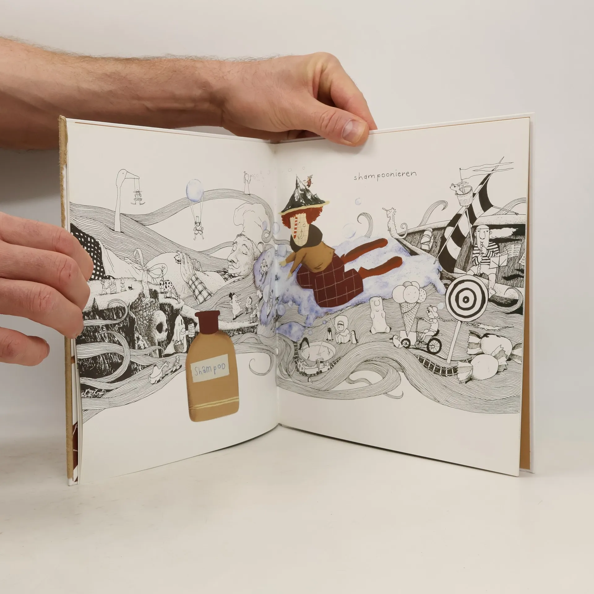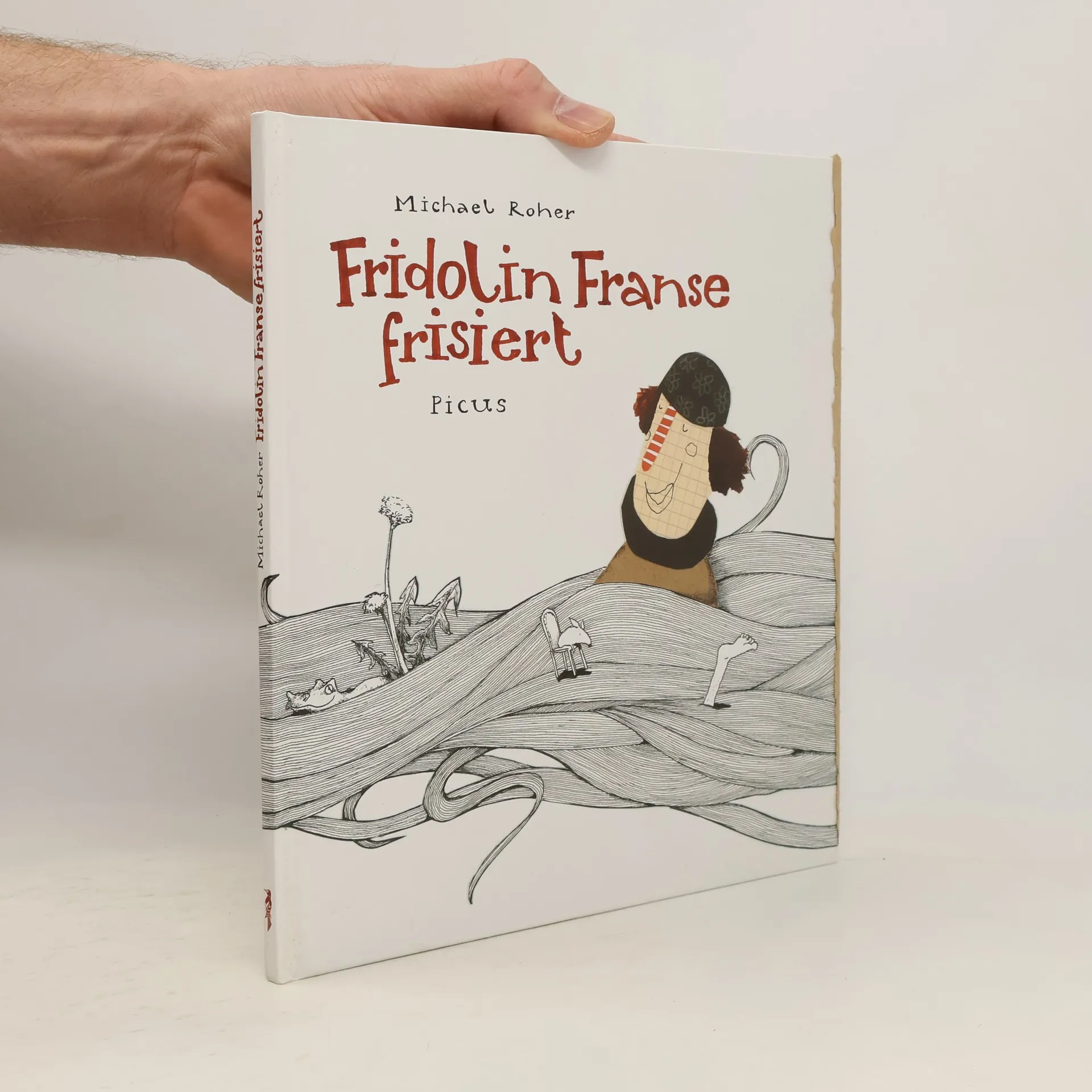 In der Frisierstube Fridolin Franse steht nur ein kleiner Schemel. Und Fridolin. Den bittet eine Frau mit langen Haaren um eine Fantasiefrisur, und die soll sie auch bekommen! Zehn Schritte braucht es vom glatten Haar zur gewünschten Frisur: Kämmen, waschen, shampoonieren, spülen, schneiden, färben, einwirken lassen, auswaschen, eindrehen und föhnen. Doch das eigentliche Geschehen ist in dem nicht enden wollenden Haar zu bestaunen, das von der einen zur nächsten Seite reicht. Dort wimmelt es nur so von zahllosen liebevollen Details und lustigen kleinen Szenen. In seinem beeindruckenden Erstlingswerk schafft Michael Roher auf wenigen Seiten ganze Welten, die sich um das Thema Frisörbesuch und weit darüber hinaus kringeln und kräuseln. Die schwarz-weißen Tuschearbeiten, kombiniert mit bunten Collagen des Haarkünstlers Fridolin, lassen jede einzelne Seite zu einem Abenteuer werden, auf das sich nicht nur die Kleinen begeistert einlassen werden.