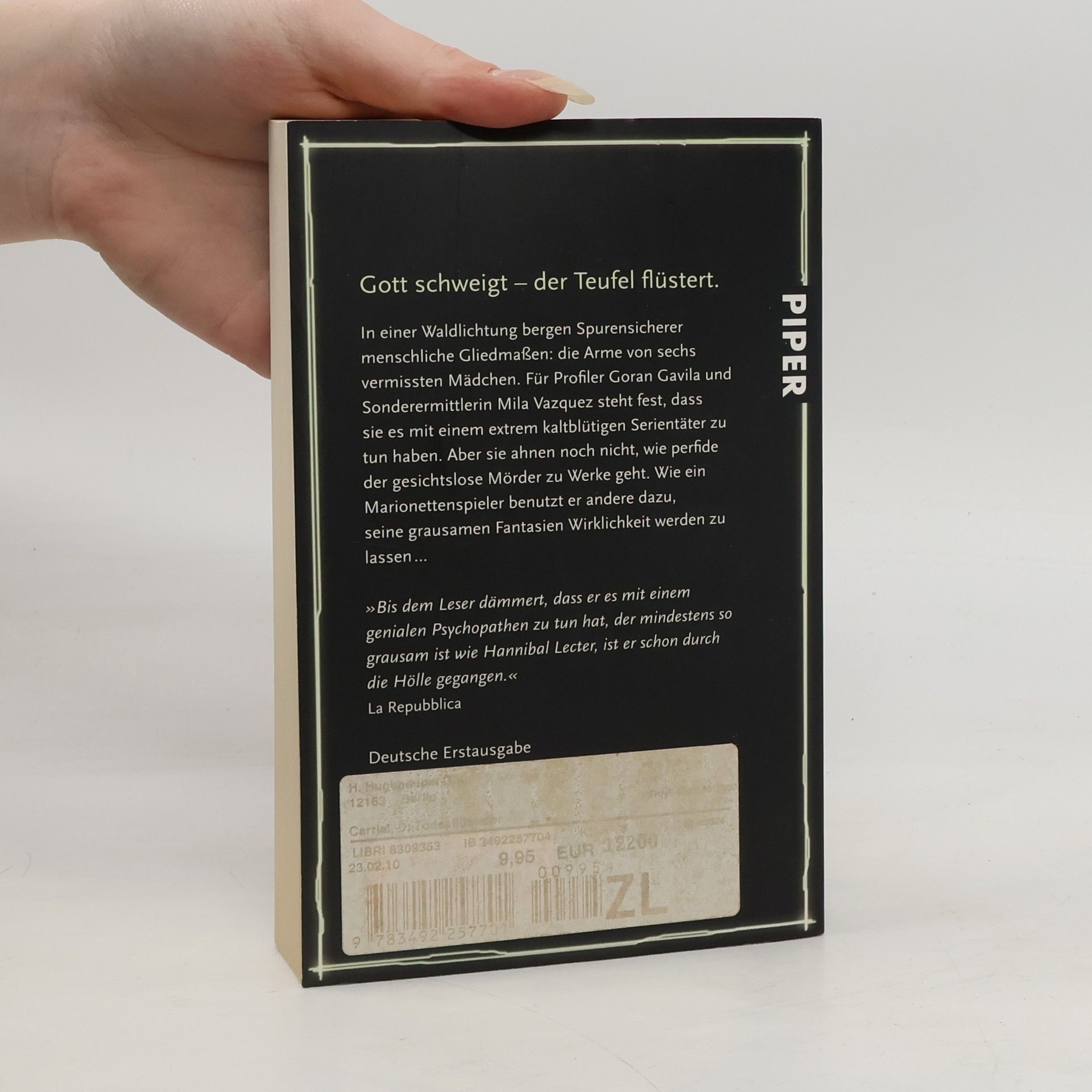 In einer Waldlichtung bergen Spurensicherer menschliche Gliedmaßen: die Arme von sechs vermissten Mädchen. Für Profiler Goran Gavila und Sonderermittlerin Mila Vazquez steht fest, dass sie es mit einem extrem kaltblütigen Serientäter zu tun haben. Aber sie ahnen noch nicht, wie perfide der gesichtslose Mörder zu Werke geht. Wie ein Marionettenspieler benutzt er andere dazu, seine grausamen Phantasien Wirklichkeit werden zu lassen. Und auch sie selbst sind längst Figuren eines beängstigenden Spiels geworden, in dem der Gesuchte allen seine makabren Regeln diktiert.