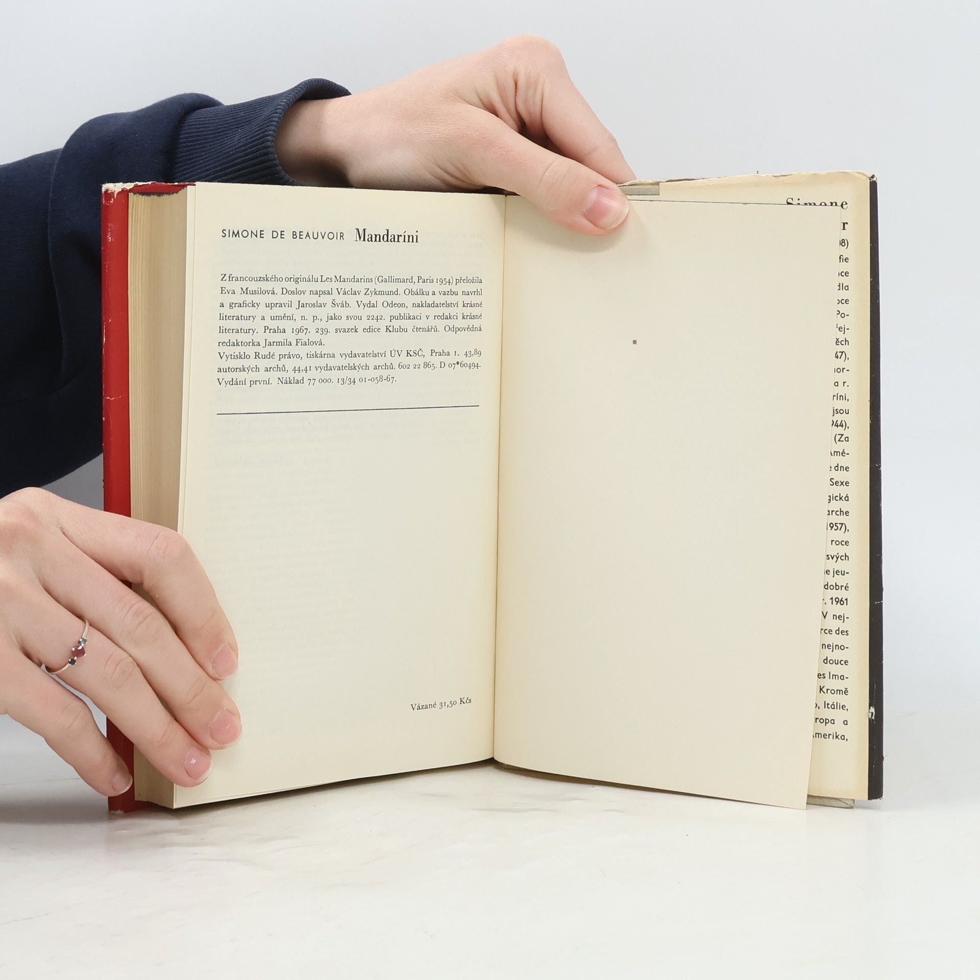 Román zachycující prostředí levicových intelektuálů v letech padesátých ve Francii. Dvě z hlavních mužských postav zobrazují s jistou mírou transpozice Sartra a Camuse a jedna z postav ženských autorku samu. Autorka se zde na příbězích těchto postav a zejména na zmíněné postavě ženskézamýšlí nad postavením moderní ženy, nad její závislostí na muži a nad její potřebou oprostit se od tuhých společenských konvencí. Takto se dochází k tzv. "mandarínskému štěstí", které vede k rozporům a konfliktům.