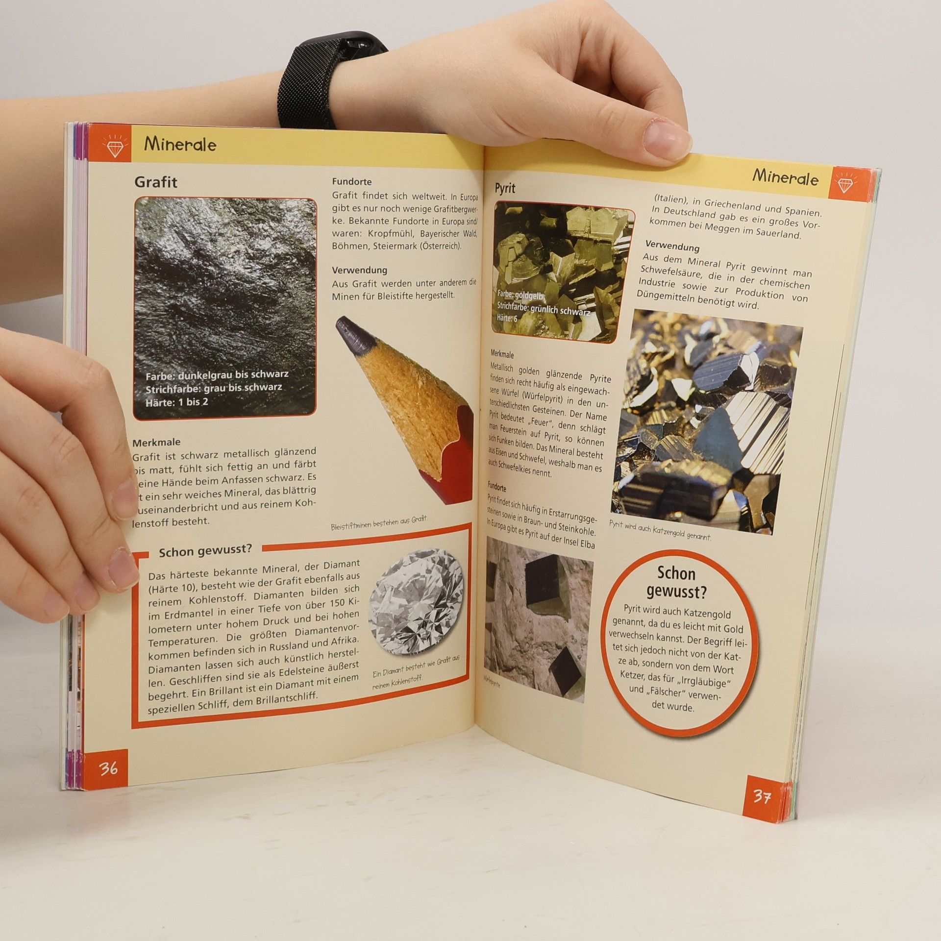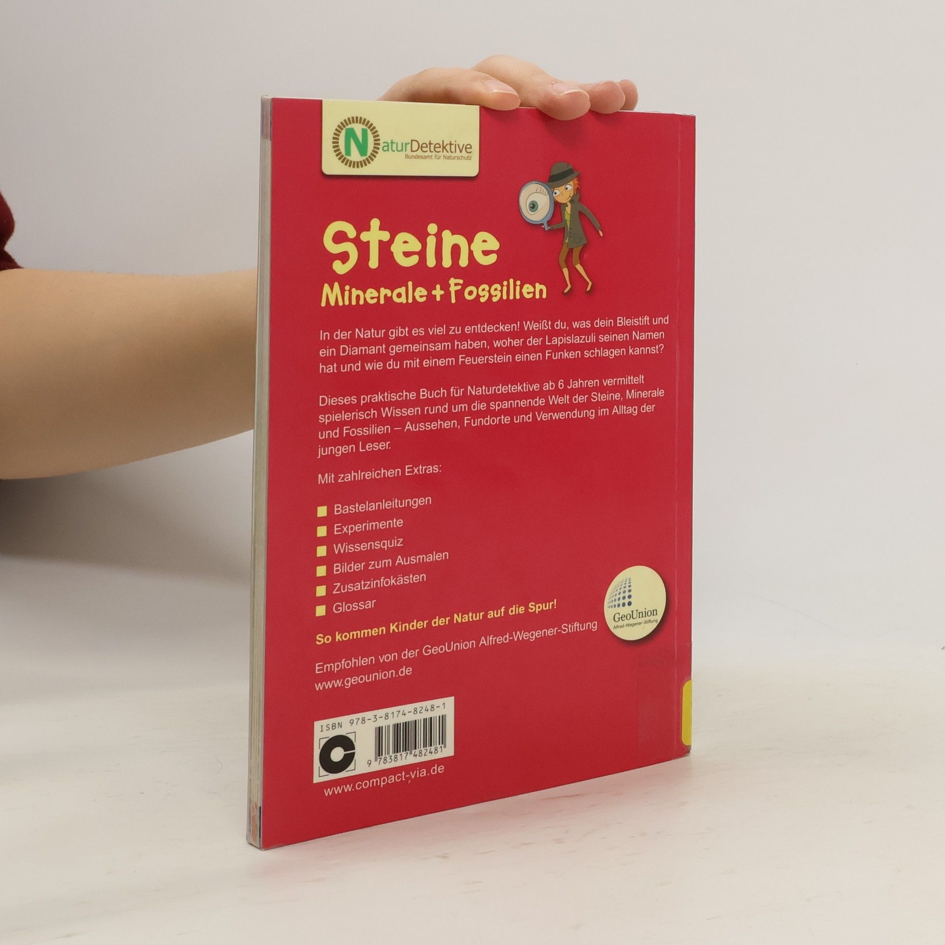 Der Band Steine, Minerale & Fossilien für Naturdetektive ab sechs Jahren vermittelt spielerisch Wissen rund um die heimische Welt der Steine und Versteinerungen und hilft beim Entdecken und Bestimmen in direkter Umgebung der Kinder. Was haben eigentlich ein Bleistift und ein Diamant gemeinsam, woher hat der Lapislazuli seinen Namen und wie kann man mit einem Feuerstein einen Funken schlagen? Neben der Wissensvermittlung sind in dem Buch zahlreiche Beschäftigungselemente wie ein Quiz, Ausmalbilder, etc. So kommen Kinder der Natur auf die Spur! - zahlreiche heimische Stein, Mineral- und Fossilienarten übersichtlich dargestellt - Aussehen, Fundorte und Verwendung der Steine - kurze, informative Texte und viele Bilder - Beschäftigungsseiten mit Bastelanleitungen, Experimenten, Wissensquiz und Bildern zum Ausmalen - umfangreiches Stichwortverzeichnis - geprüft und empfohlen von GeoUnion, Alfred-Wegener-Stiftung