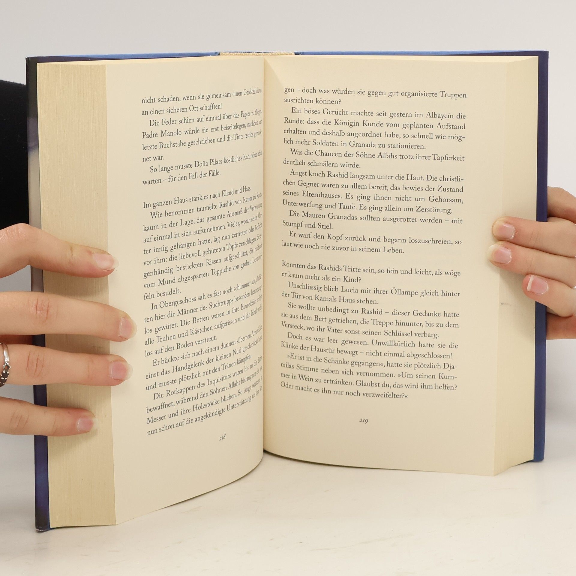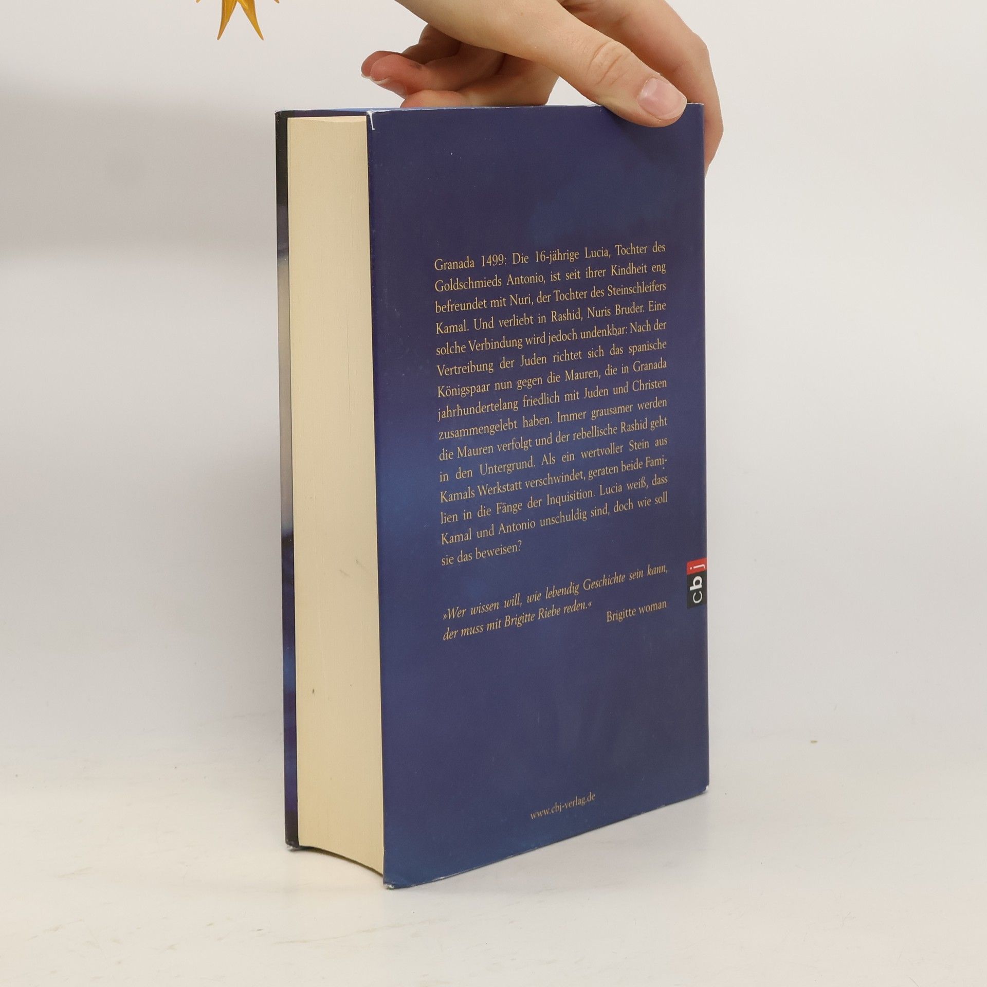 Packender Thriller und mitreißende Liebesgeschichte Granada 1499: Die 16-jährige Lucia, Tochter des Goldschmieds Antonio, ist seit ihrer Kindheit eng befreundet mit Nuri, der Tochter des Steinschleifers Kamal. Und verliebt in Rachid, Nuris Bruder. Eine solche Verbindung wird jedoch undenkbar: Nach der Vertreibung der Juden richtet sich das spanische Königspaar nun gegen die Mauren, die in Granada jahrhundertelang friedlich mit Juden und Christen zusammengelebt haben. Kamal gerät in die Fänge der Inquisition, die ihre Fühler auch nach Antonio ausstreckt. Lucia ist verzweifelt. Da tritt Miguel auf den Plan, ein junger Steinschleifer, der Lucias Gefühle heftig durcheinanderbringt …