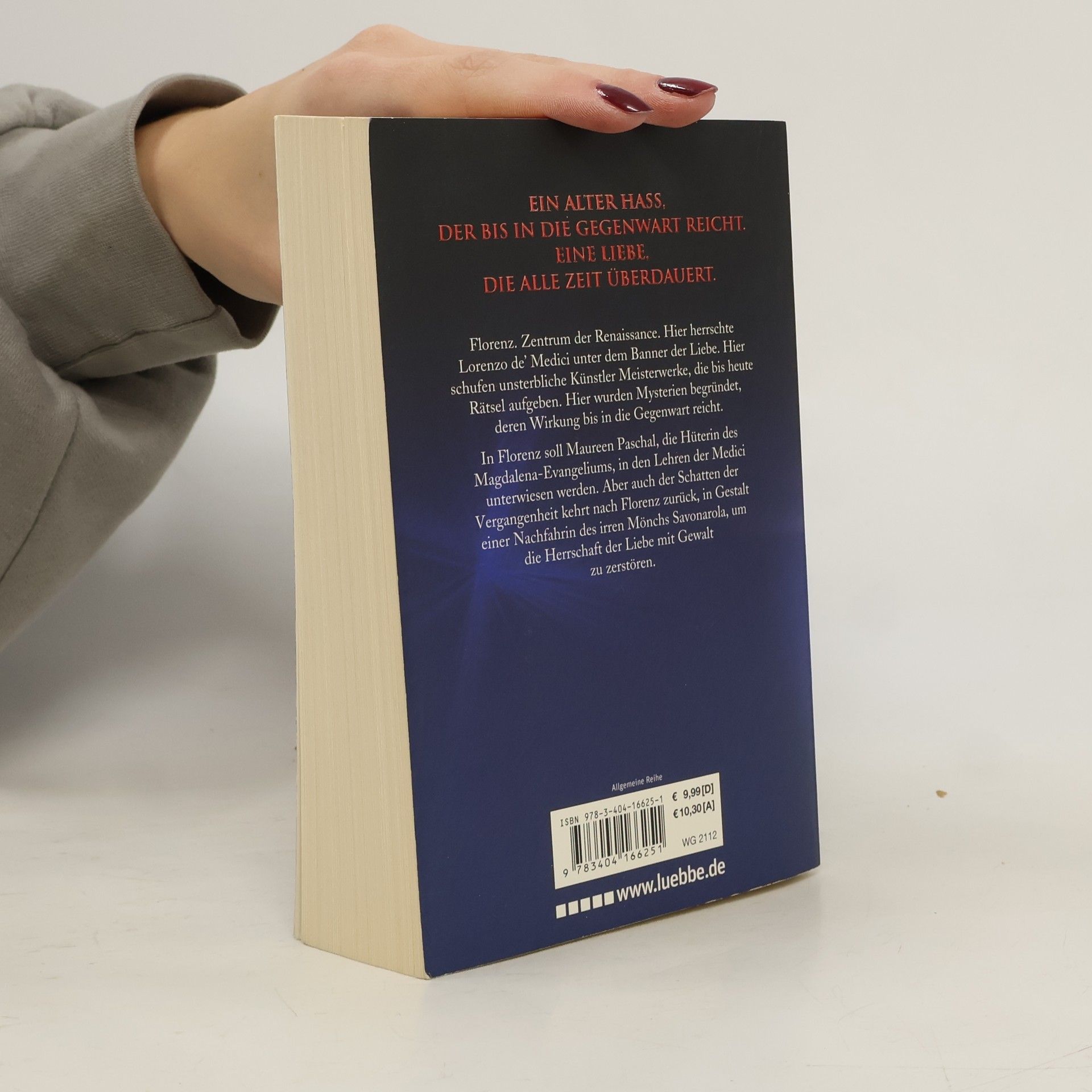 Florenz. Zentrum der Renaissance. Hier herrschte Lorenzo de' Medici unter dem Banner der Liebe. Hier schufen unsterbliche Künstler Meisterwerke, die bis heute Rätsel aufgeben. Hier wurden Mysterien begründet, deren Wirkung bis in die Gegenwart reicht. In Florenz soll Maureen Paschal, die Hüterin des Magdalena-Evangeliums, in den geheimen Lehren der Medici unterwiesen werden. Aber auch der Schatten der Vergangenheit kehrt nach Florenz zurück, um die Wiedergeburt des wahren Glaubens zu vereiteln – und sei es mit Gewalt.