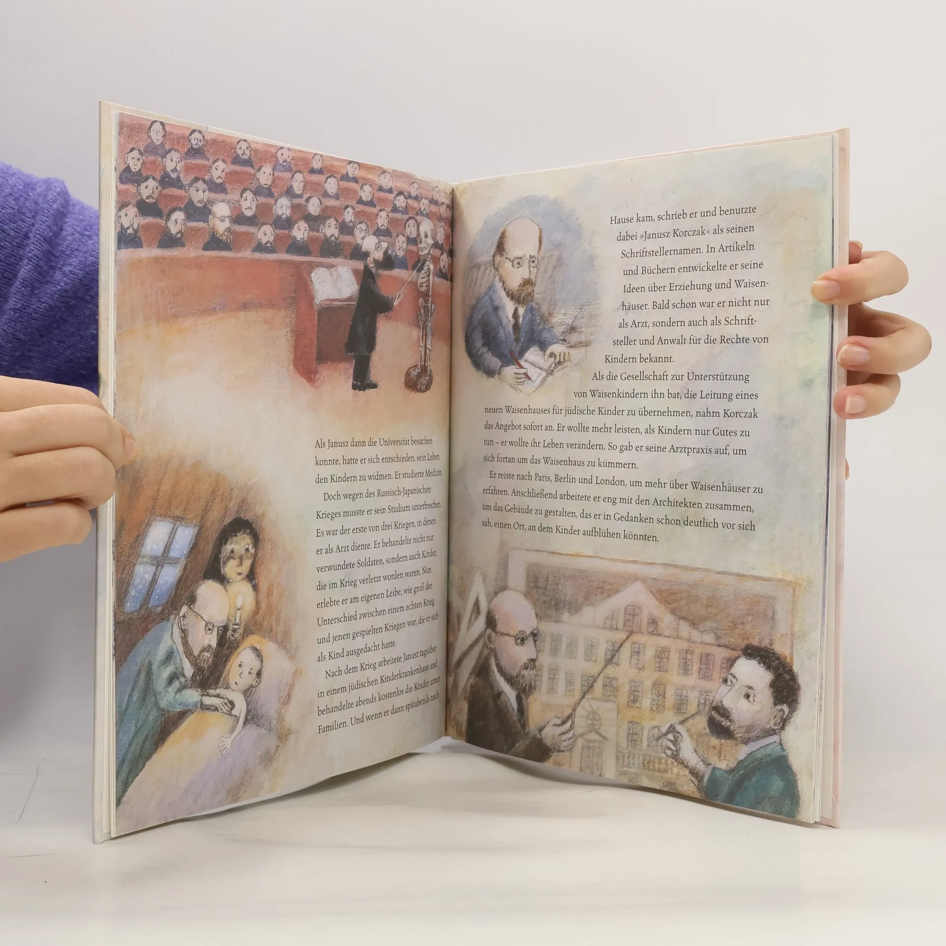 Schon früh entwickelte Janusz Korczak die Vision einer besseren Welt, in der Kinder nicht leiden müssen. Der polnische Pädagoge und Schriftsteller gründete Anfang des 20. Jahrhunderts ein Waisenhaus für arme und verwahrloste jüdische Kinder in Warschau. Davon überzeugt, dass Kinder in Selbstverwaltung leben könnten, ermutigte er seine Schützlinge dazu, ein Parlament zu wählen, ein Gericht zu halten und eine eigene Wochenzeitung herauszubringen. Die ergreifende Lebensgeschichte eines mutigen Mannes, der trotz der Todesgefahr seine Kinder in das Vernichtungslager Treblinka begleitete, hat Tomek Bogacki eindrucksvoll illustriert.