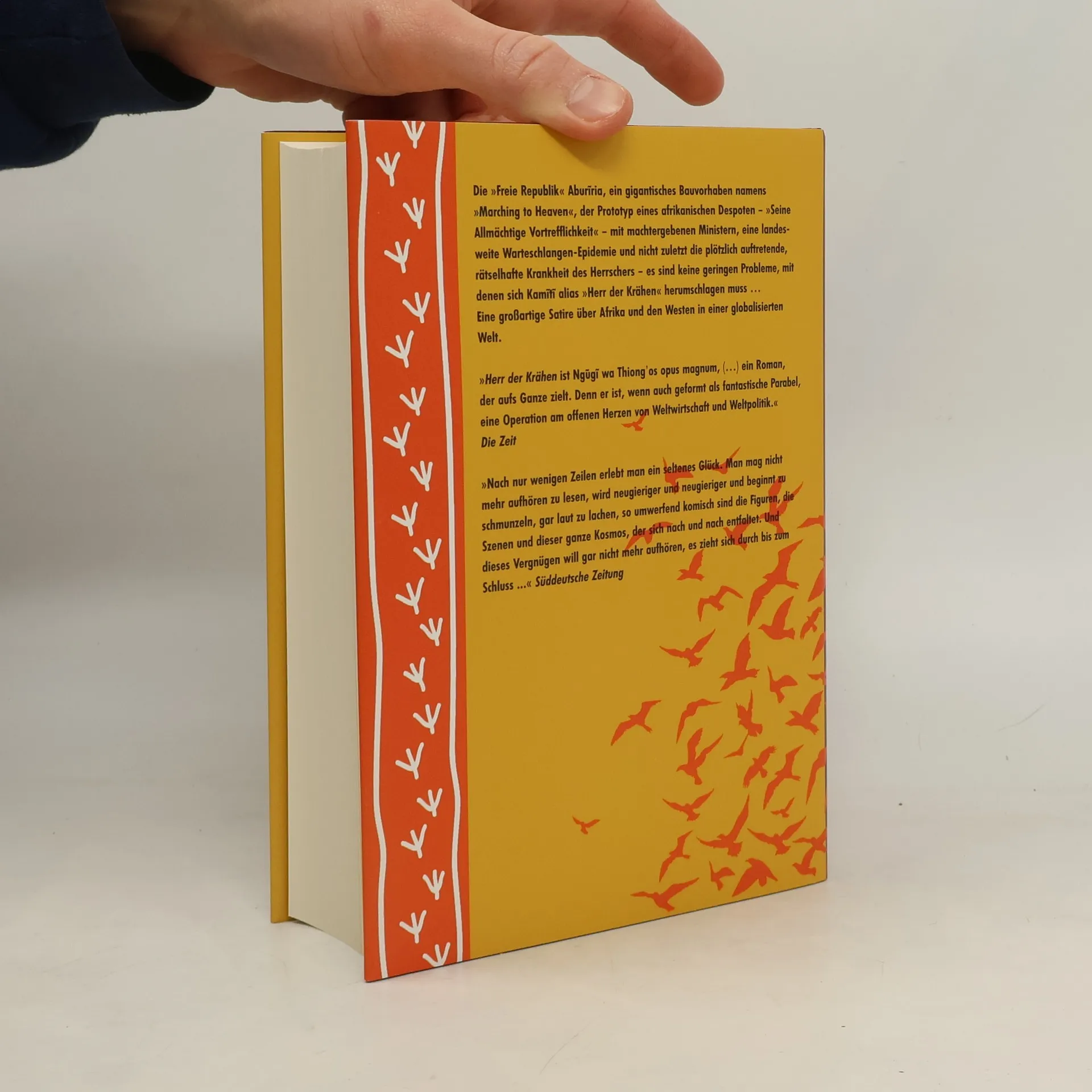 Der kenianische Schriftsteller Ngugi wa Thiongo zählt zu den wichtigsten Erzählern Afrikas. Sein Roman ›Herr der Krähen‹ ist der Afrikaroman des 21. Jahrhunderts, eine sehr amüsante Satire auf den Prototypen des afrikanischen Despoten. In Aburiria soll das »Marching to Heaven« entstehen, ein gigantisches Bauwerk, das Himmel und Erde verbindet. Der Herrscher von Aburiria will sich damit ein monumentales Denkmal setzen. Besonders seine Minister Machokali und Sikiokuu wollen vom Ruhm profitieren und buckeln darum umso ergebener. Als der Herrscher in die USA reist, um bei der Global Bank Geld für den Bau zu leihen, wird er von einer mysteriösen Krankheit überrascht, er bläht sich wie ein Ballon auf und hängt seither unter der Zimmerdecke. Kein Arzt kann ihm helfen, nur der ›Herr der Krähen‹, der über Zauberkräfte verfügt und als Heiler und Wahrsager zu Ruhm gelangt.