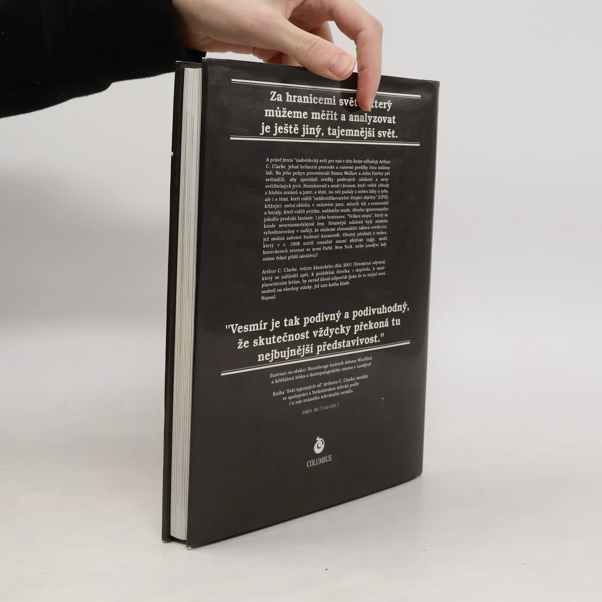 Knižní podoba světoznámého seriálu A. C. Clarka o záhadách. Za hranicemi světa, který můžeme měřit a analyzovat je ještě jiný, tajemnější svět. A právě tento nadvědecký svět pro nás v této knize odhaluje Arthur C. Clarke, jehož brilantní prorocké a varovné povídky čtou miliony lidí. Na jeho pokyn procestovali Simon Welfare a John Fairley 5 světadílů, aby zpovídali svědky podivných událostí a nevysvětlitelných jevů. Rozmlouvali s muži i ženami, kteří viděli obludy z hlubin oceánů a jezer, s těmi, na něž padaly z nebes žáby a ryby, ale i s těmi, kteří viděli neidentifikovatelné létající objekty (UFO), křižující noční oblohu v oslnivém jasu. Mluvili též s cestovateli a horaly, kteří viděli Yettiho, sněžného muže, dlouho ignorovaného jakožto produkt fantazie, i jeho bratrance, Bigfoota/Sasquatche, neboli Velkou stopu, který se krade severoamerickými lesy. Hrozivější události byly mimoto vyhodnocovány v naději, že můžeme shromáždit taková svědectví, jež možná zabrání budoucí katastrofě. Ohnivý předmět z nebes, který v roce 1908 zničil rozsáhlé území sibiřské tajgy, mohl koneckonců srovnat se zemí Paříž, New York nebo Londýn. Kdy máme čekat příští návštěvu? Arthur C. Clarke, tvůrce klasického díla 2001: Vesmírná Odysea, který se zahleděl zpět, k počátkům člověka, i dopředu, k meziplanetárním letům, by nerad dával odpovědi (jako že to stejně není možné) na všechny otázky, jež tato kniha klade. Napsal: "Vesmír je tak podivný a podivuhodný, že vždycky překoná tu nejbujnější představivost." (zdroj: kniha Svět tajemných sil A. C. Clarka)