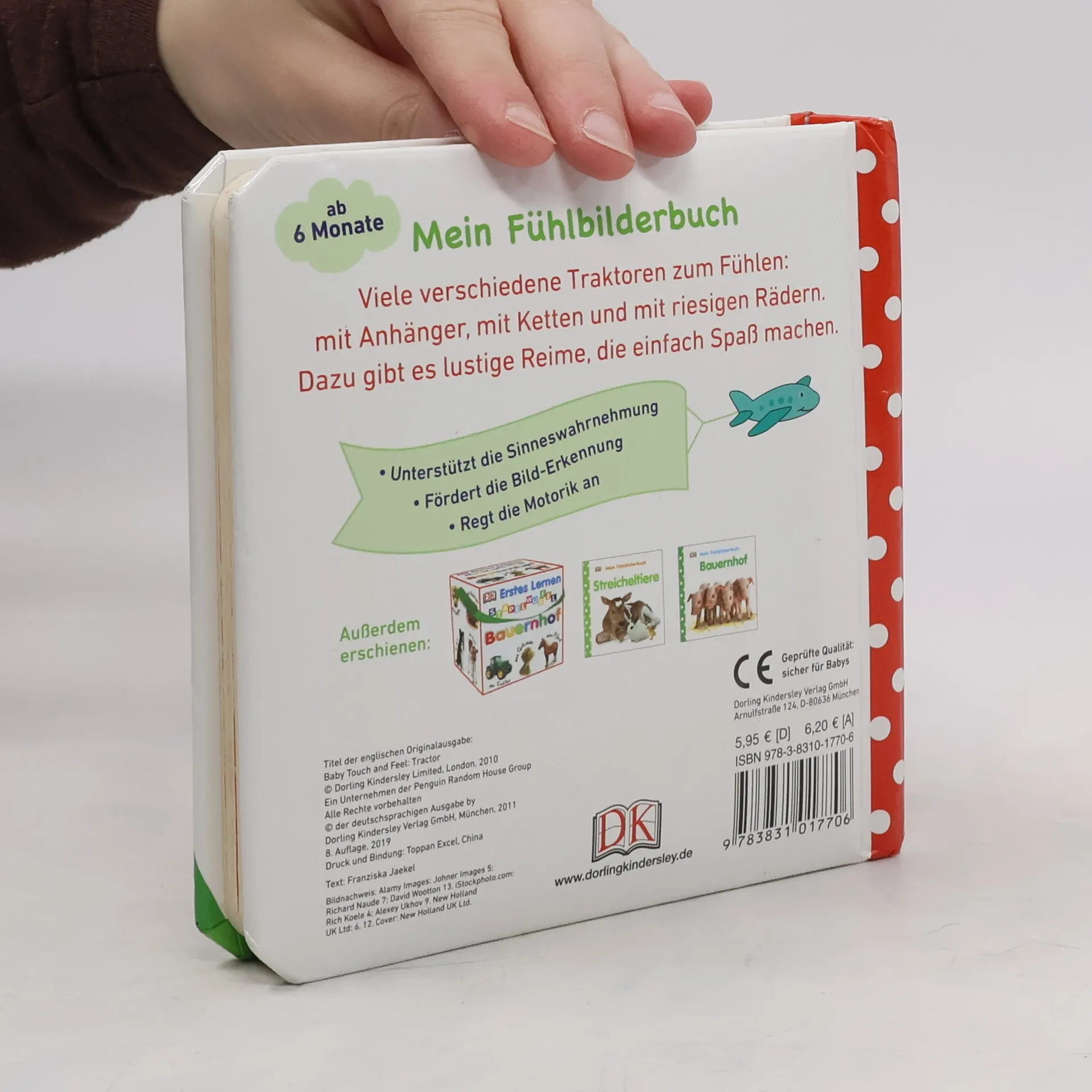 DK Fühlbilderbücher gehören zu den erfolgreichsten Kleinkinderbüchern! Denn die bewährte Kombination aus Sehen und Fühlen begeistert Kleinkinder und macht es ihnen leichter, Dinge zu verstehen. Ob nun die glänzende Motorhaube und die Reifen eines Traktors, die stacheligen Gräser eines Heuballens oder der grobkörnige Sand, der von einem Lader aufgesammelt wird - dieses einzigartige Buch garantiert ein spannendes Fühlerlebnis auf jeder Seite! Farbenfrohe und großformatige Fotos mit vielen verschiedenen Fühlmaterialien animieren Kinder zum Kennenlernen und Wiedererkennen der Farben, Formen und Gegenstände. Die bewährte Kombination aus Sehen und Fühlen macht es ihnen leichter, Dinge zu verstehen und sie sich einzuprägen. So können Kleinkinder ihre Umwelt mit allen Sinnen begreifen. Der wattierte Einband und das kleine handliche Format eignen sich besonders gut für Babyhände! Ab 6 Monaten