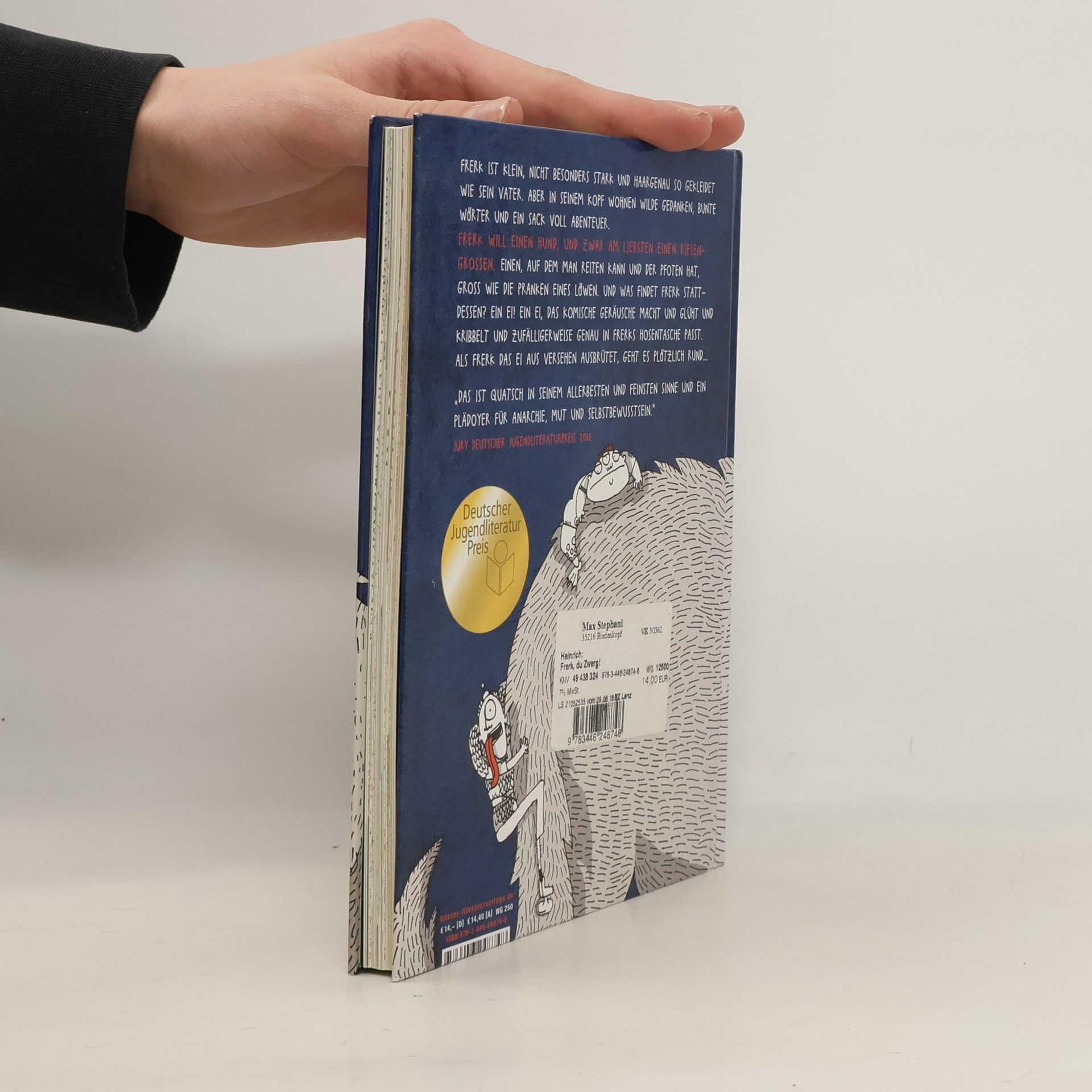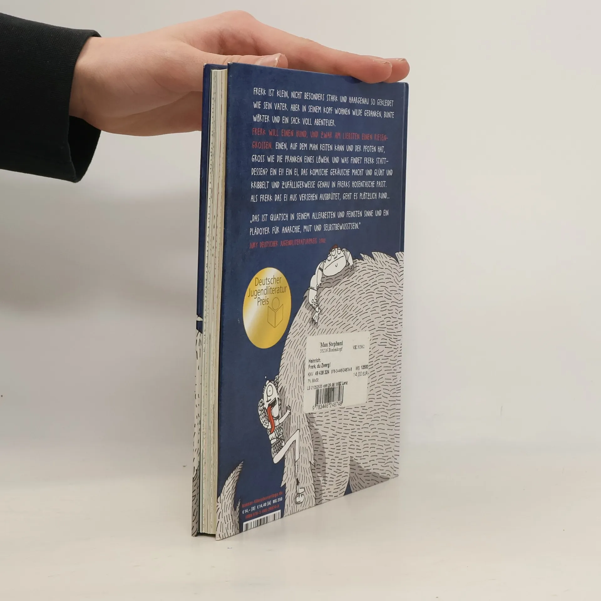 Frerk ist klein, nicht besonders stark und haargenau so gekleidet wie sein Vater. Aber in seinem Kopf wohnen wilde Gedanken und bunte Wörter. Frerk will einen Hund, und zwar am liebsten einen riesengroßen. Einen, auf dem man reiten kann und der Pfoten hat, groß wie die Pranken eines Löwen. Und was findet er stattdessen? Ein Ei! Ein Ei, das komische Geräusche macht und zufälligerweise genau in Frerks Hosentasche passt. Als Frerk das Ei aus Versehen ausbrütet, geht es plötzlich rund ...