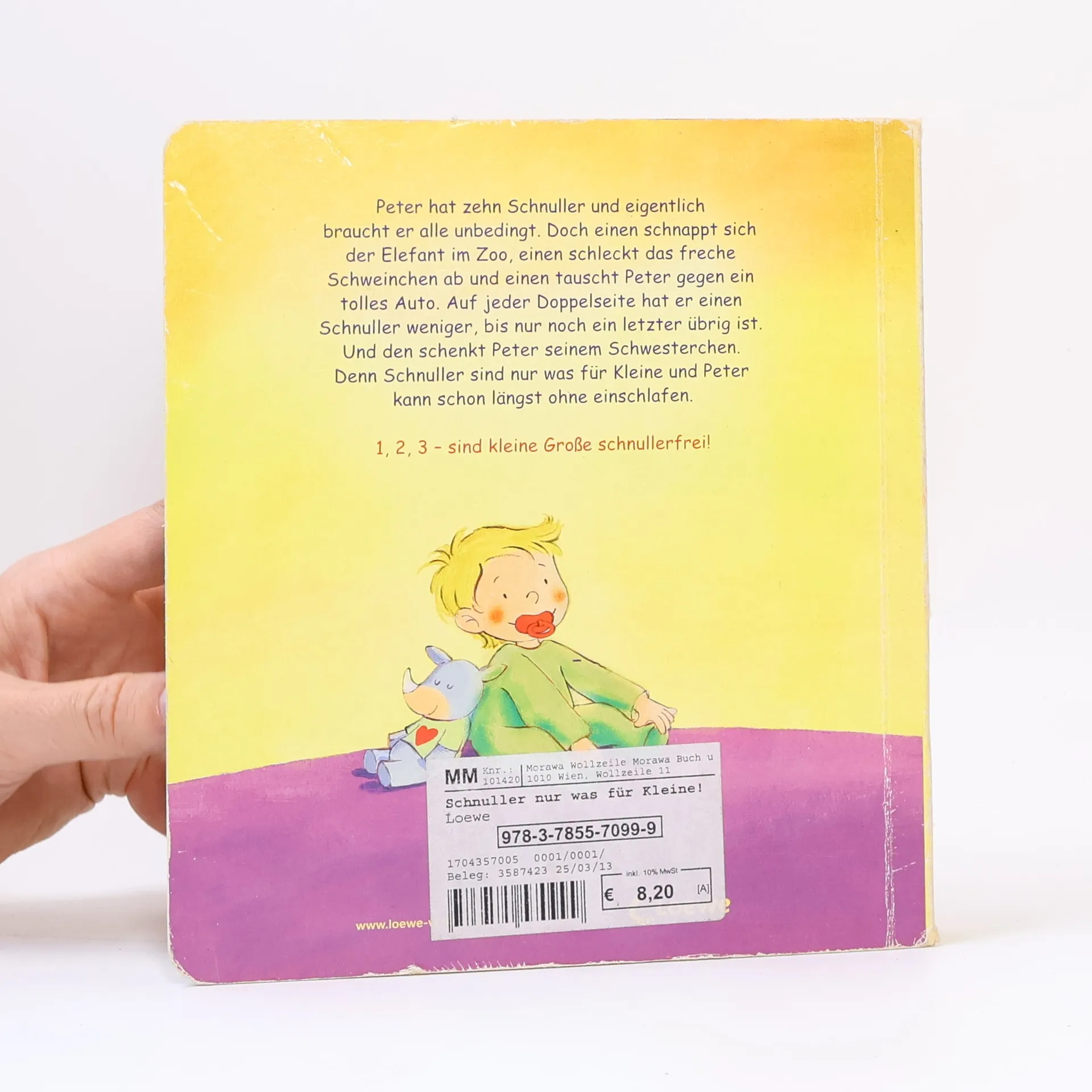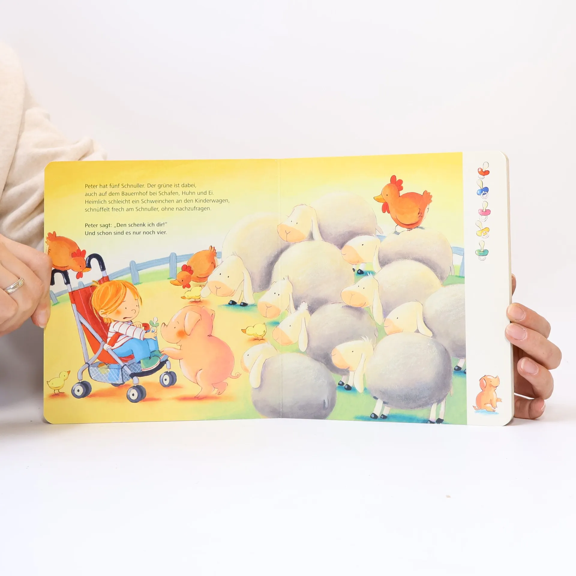 Peter hat zehn Schnuller und eigentlich braucht er alle unbedingt. Doch einen schnappt sich der Elefant im Zoo, einen schleckt das freche Schweinchen ab und einen tauscht Peter gegen ein tolles Auto. Auf jeder Doppelseite hat er einen Schnuller weniger, bis nur noch ein letzter übrig ist. Und den schenkt Peter seinem Schwesterchen. Denn Schnuller sind nur was für Kleine und Peter kann schon längst ohne einschlafen . 1, 2, 3 – sind kleine Große schnullerfrei !