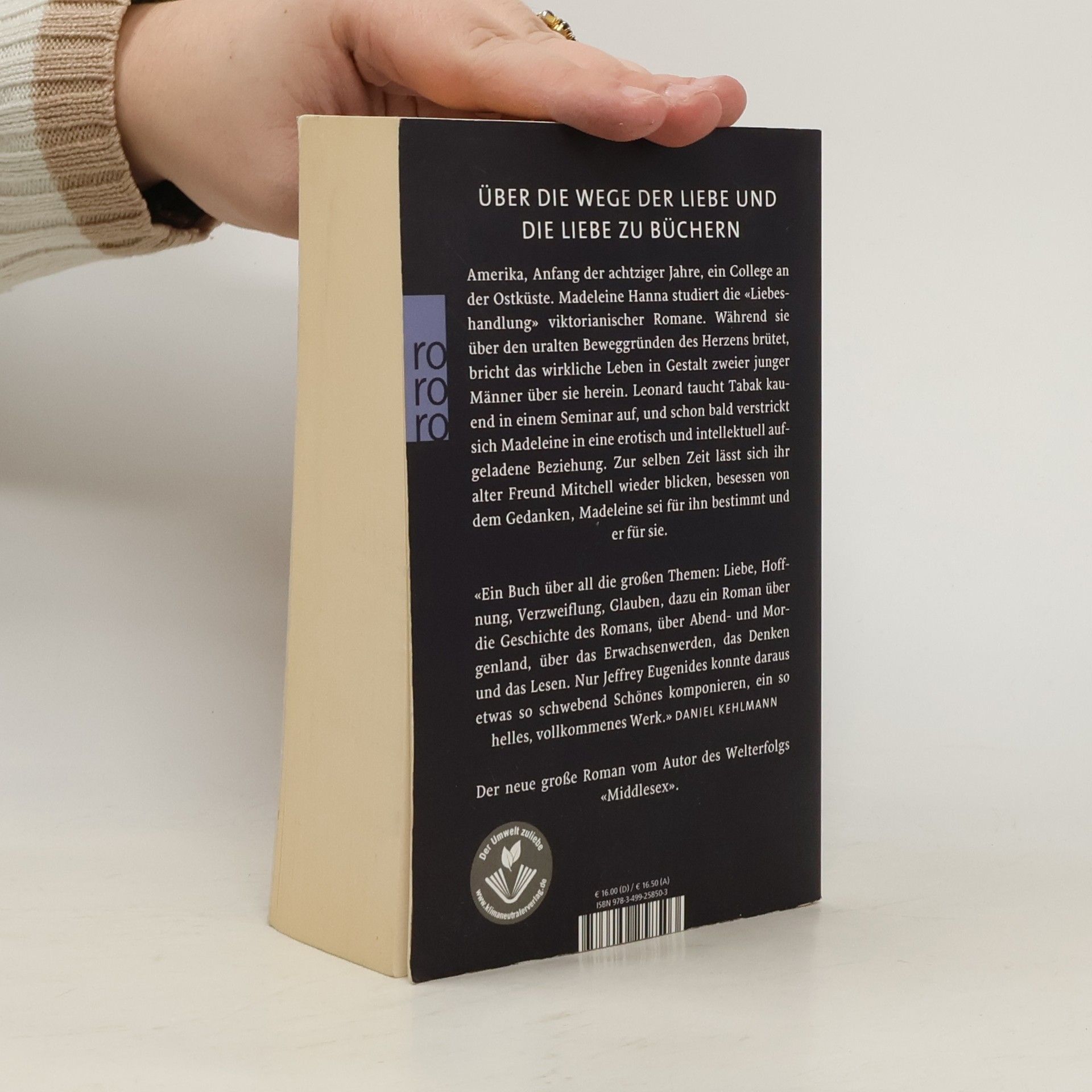 Über die Wege der Liebe und die Liebe zu Büchern.Amerika, Anfang der achtziger Jahre, ein College an der Ostküste. Madeleine Hanna studiert die «Liebeshandlung» viktorianischer Romane. Während sie über den uralten Beweggründen des Herzens brütet, bricht das wirkliche Leben in Gestalt zweier junger Männer über sie herein. Leonard taucht Tabak kauend in einem Seminar auf, und schon bald verstrickt sich Madeleine in eine erotisch und intellektuell aufgeladene Beziehung. Zur selben Zeit lässt sich ihr alter Freund Mitchell wieder blicken, besessen von dem Gedanken, Madeleine sei für ihn bestimmt und er für sie. «Ein Buch über all die großen Themen: Liebe, Hoffnung, Verzweiflung, Glauben, dazu ein Roman über die Geschichte des Romans, über Abend- und Morgenland, über das Erwachsenwerden, das Denken und das Lesen. Nur Jeffrey Eugenides konnte daraus etwas so schwebend Schönes komponieren, ein so helles, vollkommenes Werk.» (Daniel Kehlmann)Der neue große Roman vom Autor des Welterfolgs «Middlesex».