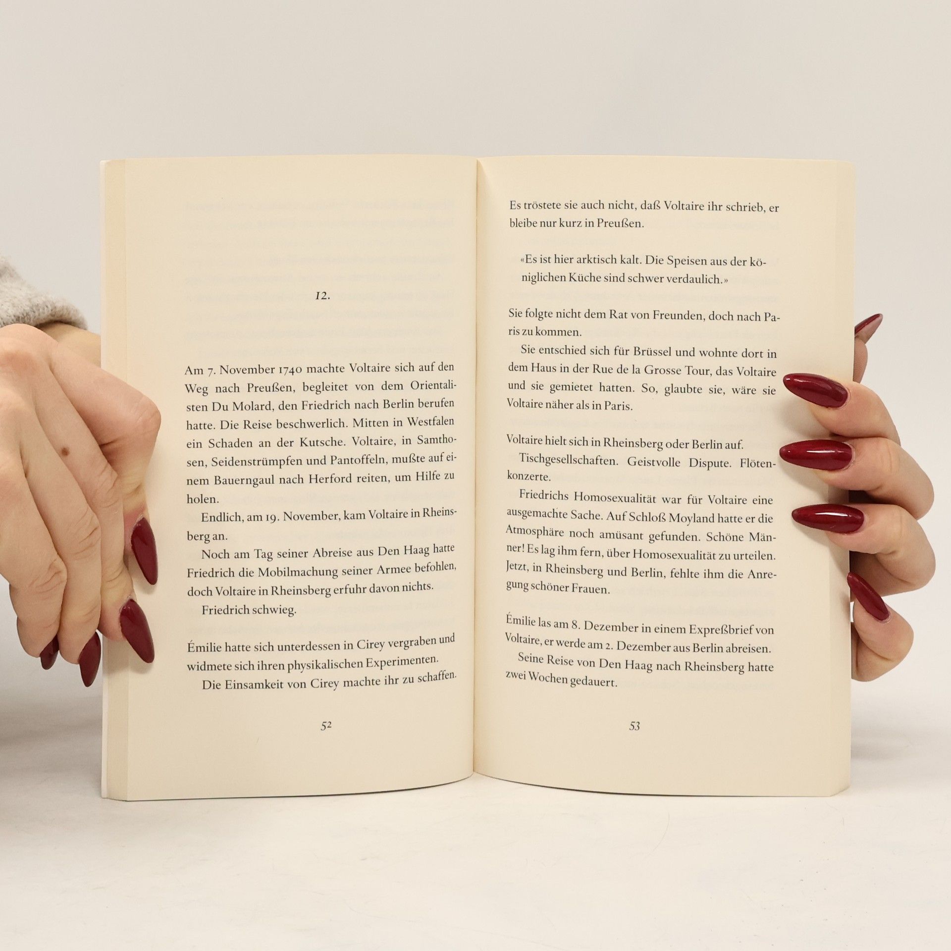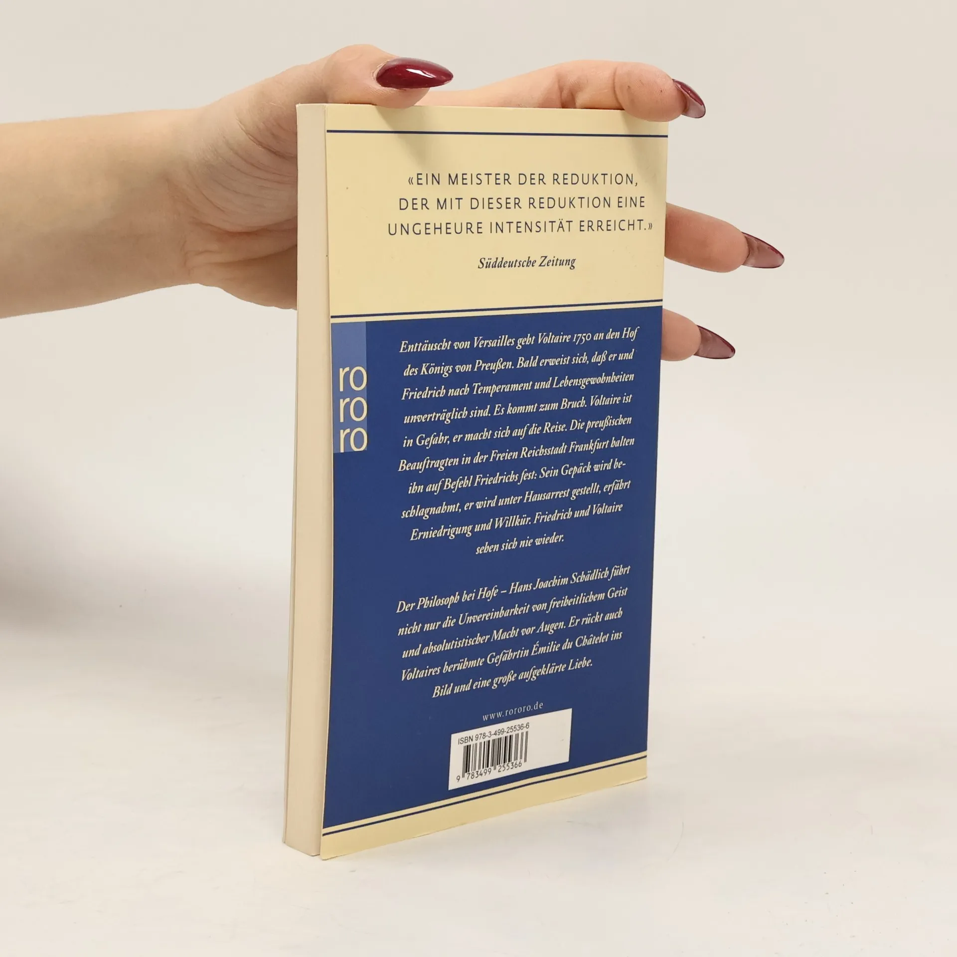 Enttäuscht vom Desinteresse des Versailler Hofes, erschüttert vom Tod seiner geliebten Émilie du Châtelet, gibt Voltaire 1750 dem Drängen des preußischen Königs nach: der 56-Jährige geht an den Hof des um achtzehn Jahre jüngeren Friedrich. Anders als Émilie hält er an der Wunschvorstellung fest, der König sei der 'Philosoph auf dem Thron'. Friedrich, der den berühmten Franzosen seit 1736 in Briefen umwirbt, verspricht sich von Voltaires Aufenthalt in Potsdam und Berlin nicht nur die Mehrung seines Ruhmes. Er hofft auf einen geistvollen Gesprächspartner - und auf einen Korrektor seiner eigenen poetischen und philosophischen Schriften. Bald erweist sich, dass Voltaire und Friedrich nach Temperament und Lebensgewohnheiten unverträglich sind. Es kommt zum Bruch. Voltaire ist in Gefahr, er will fort und macht sich auf die Reise. Die preußischen Residenten in der Freien Reichsstadt Frankfurt aber halten ihn auf Befehl Friedrichs fest: Er wird unter Hausarrest gestellt, sein Gepäck wird beschlagnahmt, er erfährt Erniedrigung und Willkür. Friedrich und Voltaire sehen sich nie wieder. Hans Joachim Schädlich führt mit äußerster Verknappung, jedoch historisch präzise, nicht nur die Unvereinbarkeit von freiheitlichem Geist und absolutistischer Macht vor Augen - er rückt auch Voltaires berühmte Gefährtin Émilie du Châtelet ins Bild und eine große aufgeklärte Liebe.