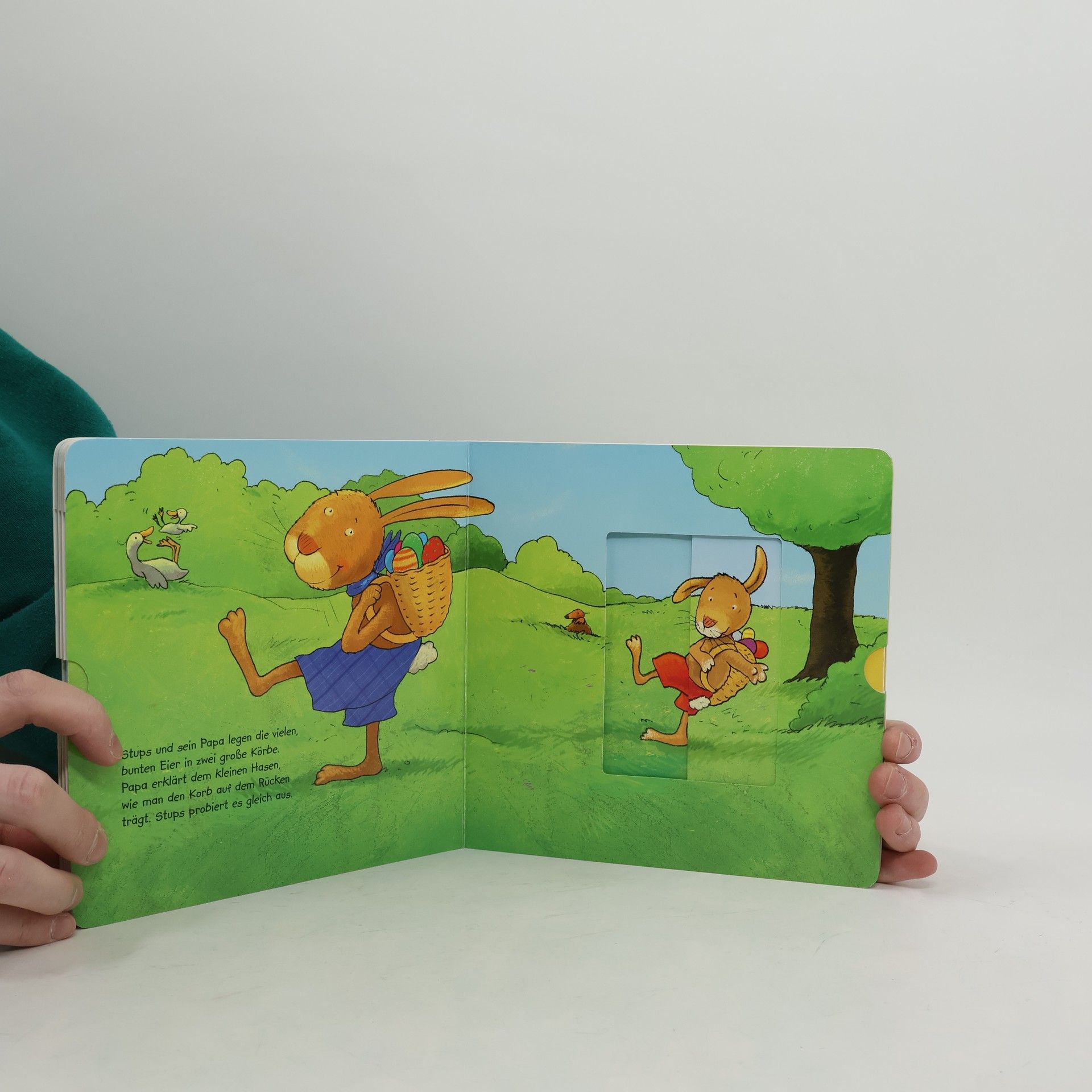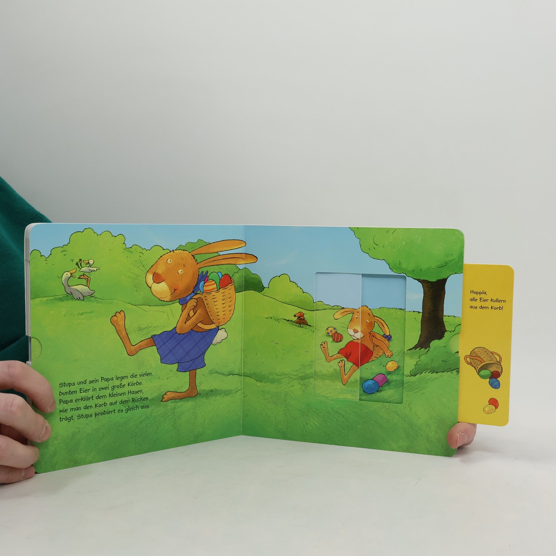 Der kleine Hase darf zum ersten Mal bei den Ostervorbereitungen mithelfen. Doch dabei geht noch einiges schief. Lustige Verwandlungsschieber zeigen die Missgeschicke des kleinen Osterhasen.