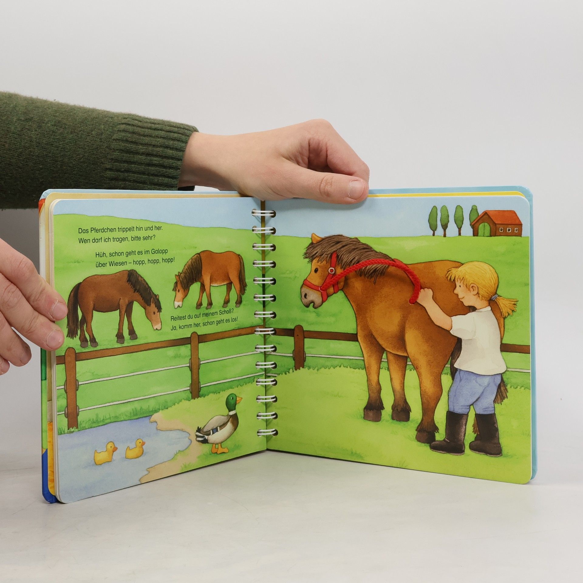 In diesem extra dicken Fühlbuch finden Babys ihre Lieblingstiere zum Streicheln und Anfassen. Der Esel hat ein weiches Fell. Die Küken haben flauschige Flügel. Und wie fühlt sich der Zügel des Pferdes an? Lustige Reime erzählen von den Tieren und regen Kinder ab 18 Monaten zum Fühlen und Streicheln an. Dank der Spiralbindung bleibt das Buch geöffnet liegen, so dass auch die ganz Kleinen einfach darin blättern können. Kinder entdecken die Welt mit allen Sinnen. Fühlbücher unterstützen die Entwicklung Ihres Kindes und fördern seine Neugier. In diesem Buch sind die ersten Lieblingstiere der Kleinen mit 9 großen und abwechslungsreichen Fühlteilen ausgestattet. So können Kinder weiches Fell streicheln, die grobe Struktur eines Sacks ertasten, mit dem Zügel eines Pferds spielen oder die Katze hinter dem Tischtuch entdecken. Die unterschiedlichen Strukturen regen die Neugier an und fördern die kognitive und motorische Entwicklung. Kurzen Reime lenken die Aufmerksamkeit des Kindes auf die Fühlelemente und wecken das Interesse an Sprache. Die hochwertigen Stoffteile sind sicher ins Buch eingearbeitet. So ist das Buch besonders langlebig.