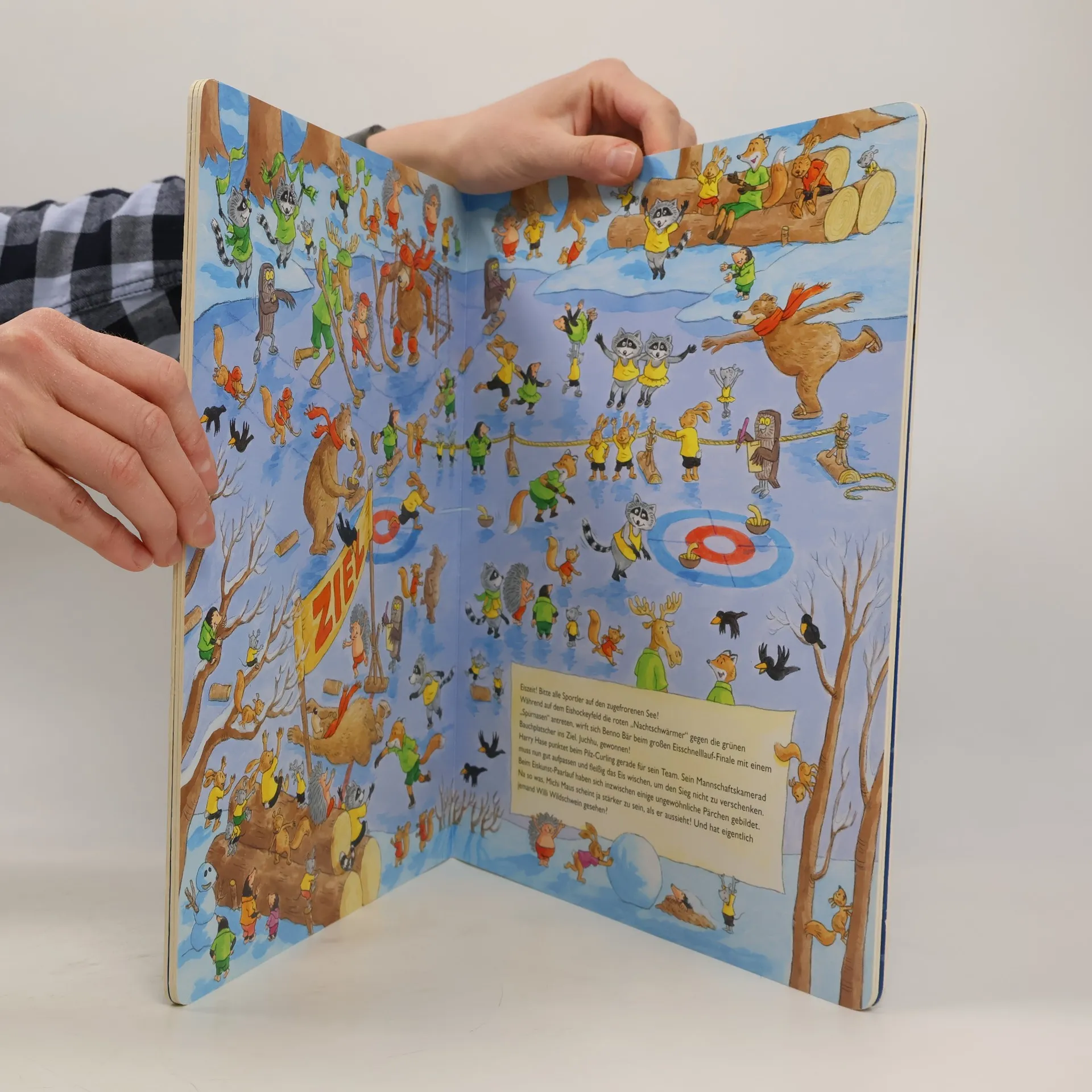 Wenn der erste Schnee gefallen ist, bereiten die Tiere des Waldes ihr liebstes Fest vor: die große Winterolympiade! Bären, Füchse, Mäuse & Co. treten in den unterschiedlichsten Wettkämpfen gegeneinander an. Wer wird wohl beim Eisschnelllauf die Nase vorne haben, welches ungleiche Paar kann den Eiskunst-Paarlauf für sich entscheiden und kann Team „Schlafmütze“ rechtzeitig zur großen Schneeballschlacht fit sein? Lustige Szenen mit liebevollen Details werden durch eine kleine Geschichte ergänzt. Das besondere Winter-Wimmelbuch Liebevoll und mit Witz illustriert XXL-Format