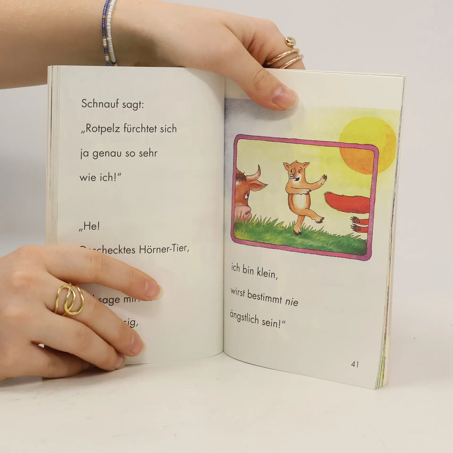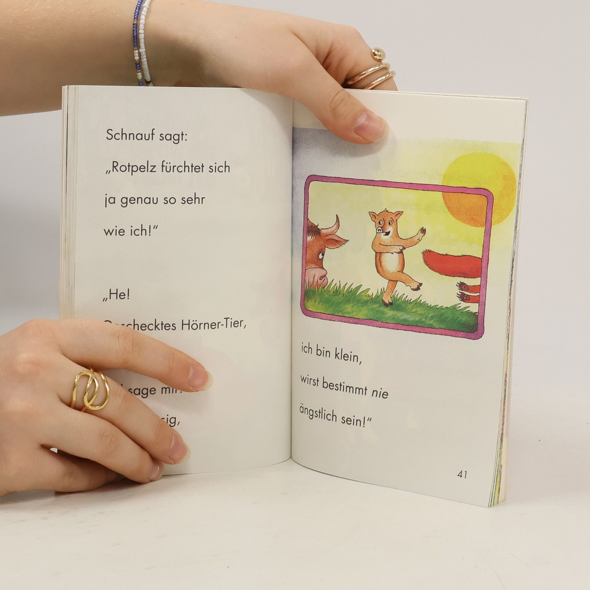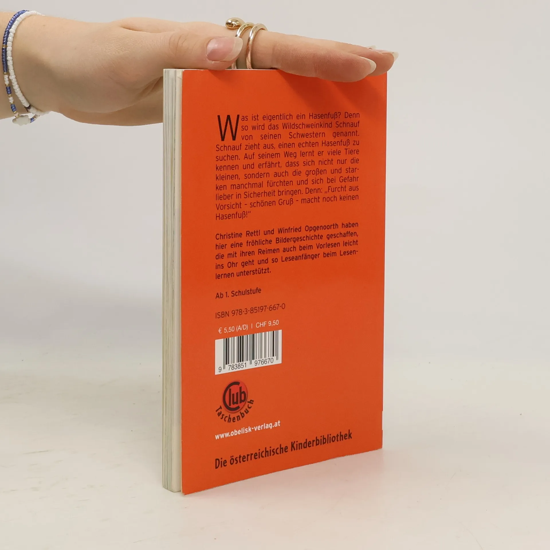 Was ist eigentlich ein Hasenfuß? Denn so wird das Wildschweinkind Schnauf von seinen Schwestern genannt. Schnauf will der Sache endlich auf den Grund gehen und zieht los, um einen echten Hasenfuß zu suchen. Auf seinem Weg lernt Schnauf viele andere Tiere kennen und staunt nicht schlecht, als er erfährt, dass sich nicht nur die kleinen, sondern auch die großen und starken unter ihnen manchmal fürchten – und sich bei Gefahr lieber in Sicherheit bringen. Denn: „Furcht aus Vorsicht – schönen Gruß – macht noch keinen Hasenfuß!“ Christine Rettl und Winfried Opgenoorth haben hier eine fröhliche Bildergeschichte geschaffen, die mit ihren Reimen auch beim Vorlesen leicht ins Ohr geht und so Leseanfänger beim Lesenlernen unterstützt.