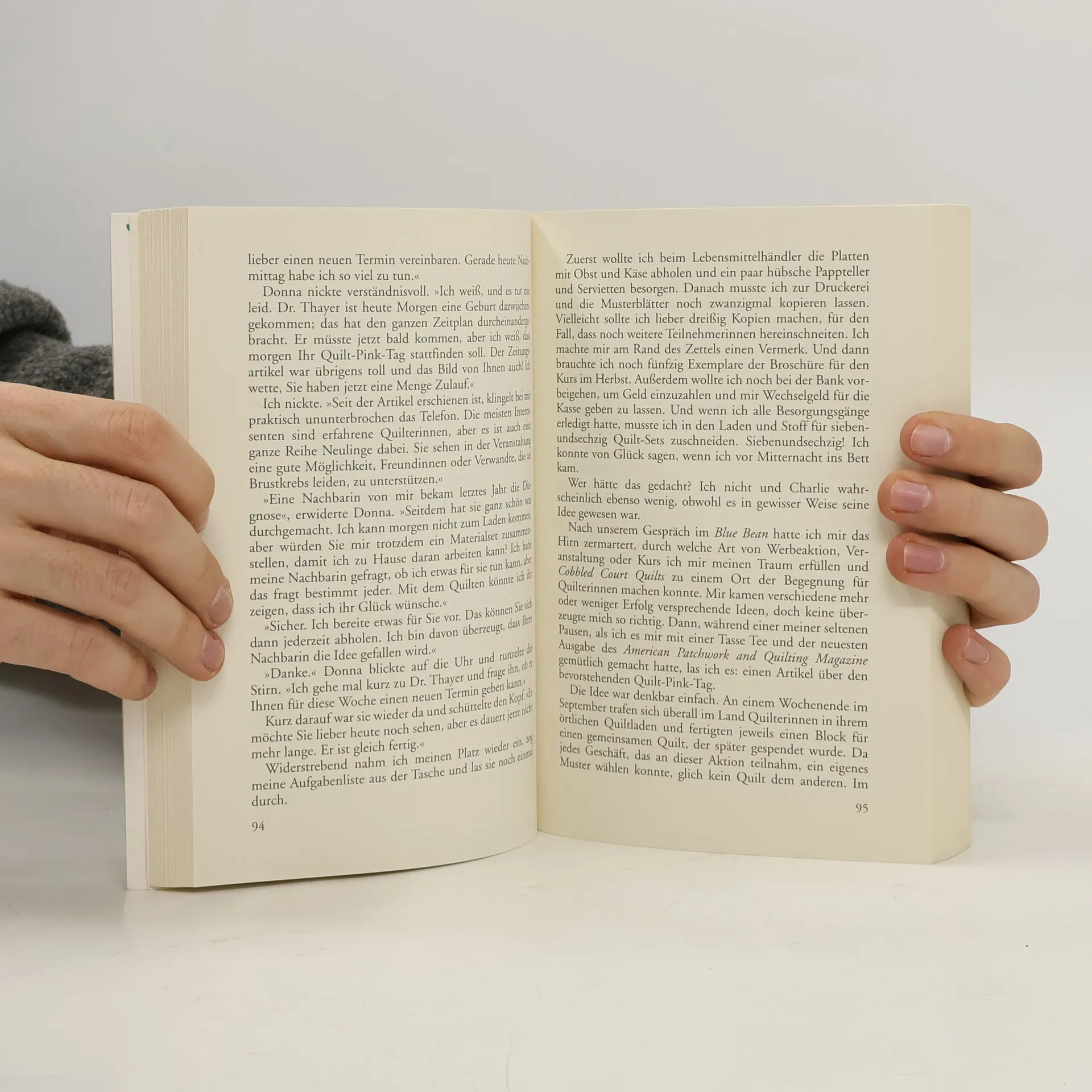 Die Scheidung von ihrem Mann war ein endloses Knäuel von Scherereien. Jetzt nimmt Evelyn den verloren geglaubten Faden ihres Lebens wieder auf: Mit ihrem eigenen Quilt-Laden macht sie sich selbstständig. Bald finden sich zu ihren Handarbeitskursen sehr unterschiedliche Frauen ein. Zwischen Evelyn, Abigail, Liza und Margot entspinnt sich ein dichtes Netz der Freundschaft - auch in schwerer Zeit...