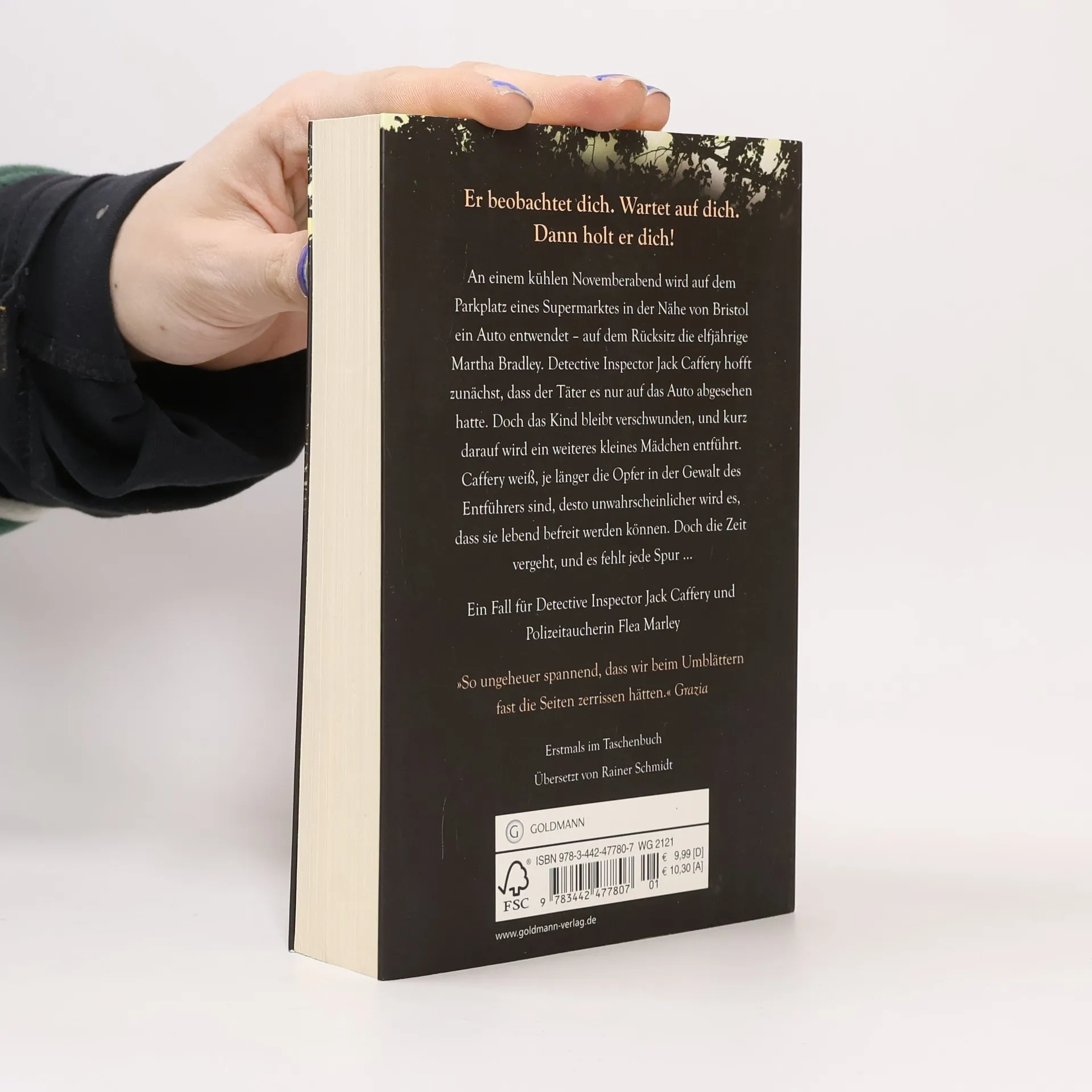 Er beobachtet dich. Wartet auf dich. Dann holt er dich! An einem kühlen Novemberabend wird auf dem Parkplatz eines Supermarktes in der Nähe von Bristol ein Auto entwendet – auf dem Rücksitz die elfjährige Martha Bradley. Detective Inspector Jack Caffery hofft zunächst, dass der Täter es nur auf das Auto abgesehen hatte. Doch das Kind bleibt verschwunden, und kurz darauf wird ein weiteres kleines Mädchen entführt. Caffery weiß, je länger die Opfer in der Gewalt des Entführers sind, desto unwahrscheinlicher wird es, dass sie lebend befreit werden können. Doch die Zeit vergeht, und es fehlt jede Spur ...