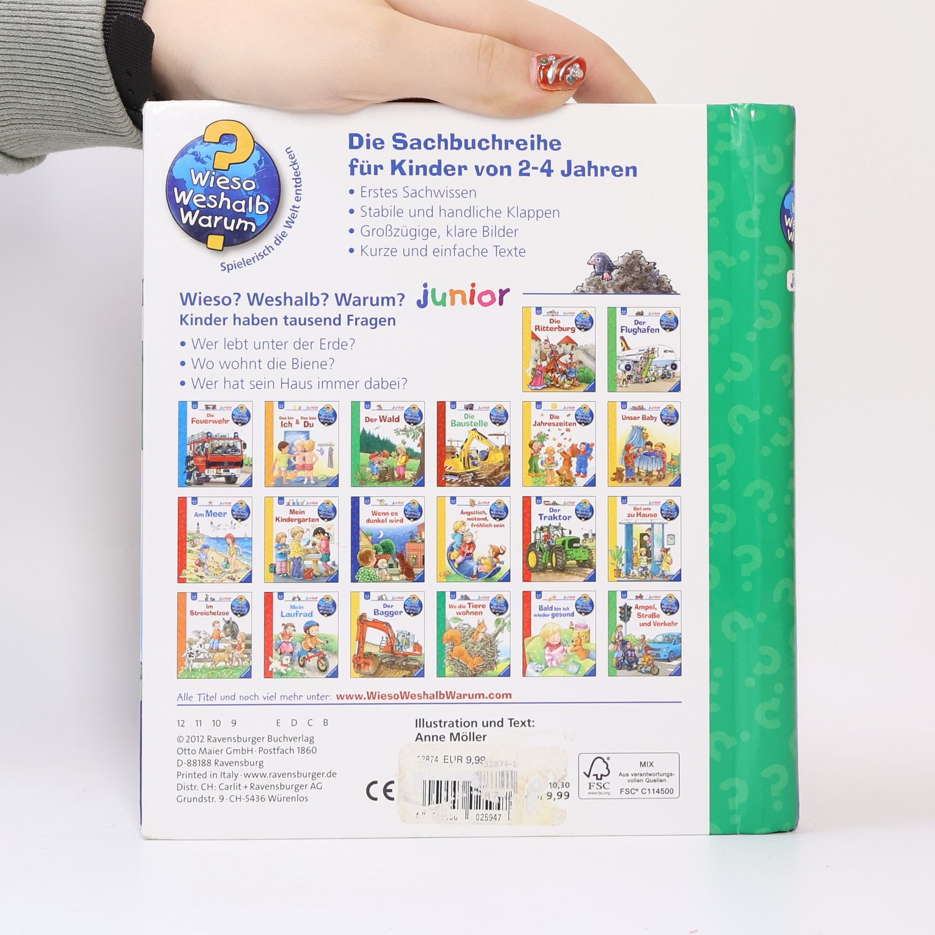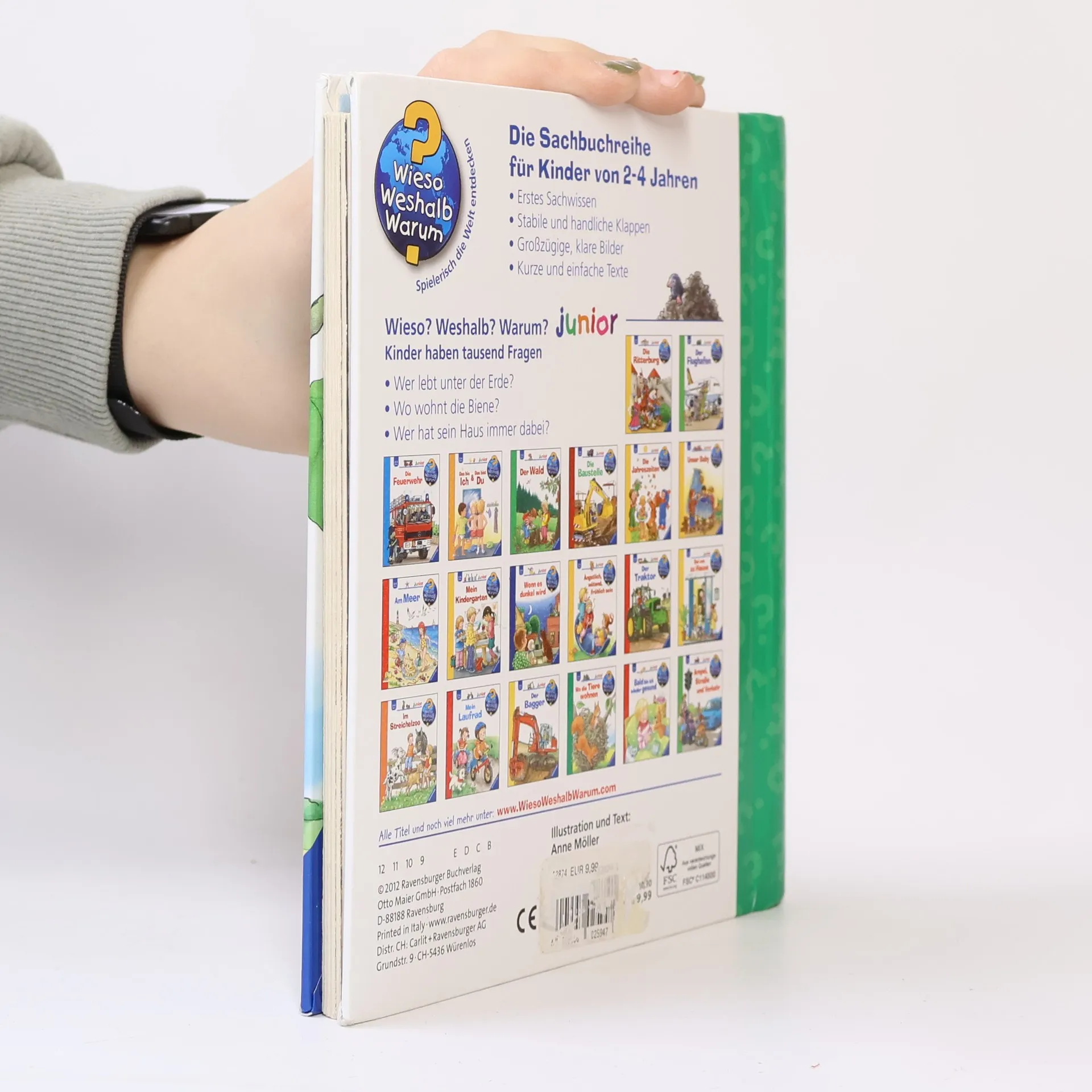 Menschen wohnen in Häusern, das weiß jedes Kind. Auch Hund und Katze fühlen sich hier sehr wohl. Aber wo wohnen die vielen anderen Tiere? Dieses Buch zeigt die Nester von Storch, Schwalbe und Gimpel, den unterirdischen Bau von Kaninchen und Maulwurf, die Burg des Bibers, den Bienenstock und sogar Fledermäuse gibt es zu entdecken! Die Weinbergschnecke hingegen hat ihr Haus immer dabei. Sie versteckt sich auf jeder Doppelseite im Buch und möchte gern gefunden werden. Wieso? Weshalb? Warum? junior Die Sachbuchreihe für Kinder von 2-4 Jahren Jeden Tag entdecken Kinder etwas Neues – und haben viele Fragen. Wann kommt die Feuerwehr? Was machen die Tiere im Winter? Warum muss ich Zähne putzen? Die beliebte Sachbuchreihe Wieso? Weshalb? Warum? junior beantwortet die Fragen der Kinder auf Augenhöhe. Sie beleuchtet unterschiedlichste Themen aus ihrer Alltags- und Interessenswelt altersgerecht und mit viel Liebe zum Detail. Die Reihe ist speziell auf kleine Hände und die Bedürfnisse der Kleinsten angepasst. Klare und liebevolle Bilder, kurze Sachtexte sowie handliche Klappen, die Bewegungen veranschaulichen und überraschende und lustige Einblicke gewähren, ermöglichen Kindern, sich ihre Themen selbst zu erschließen. Der Spaß am eigenhändigen Entdecken, die liebevolle Umsetzung und die hochwertige Ausstattung garantieren langanhaltende Freude an jedem Buch.