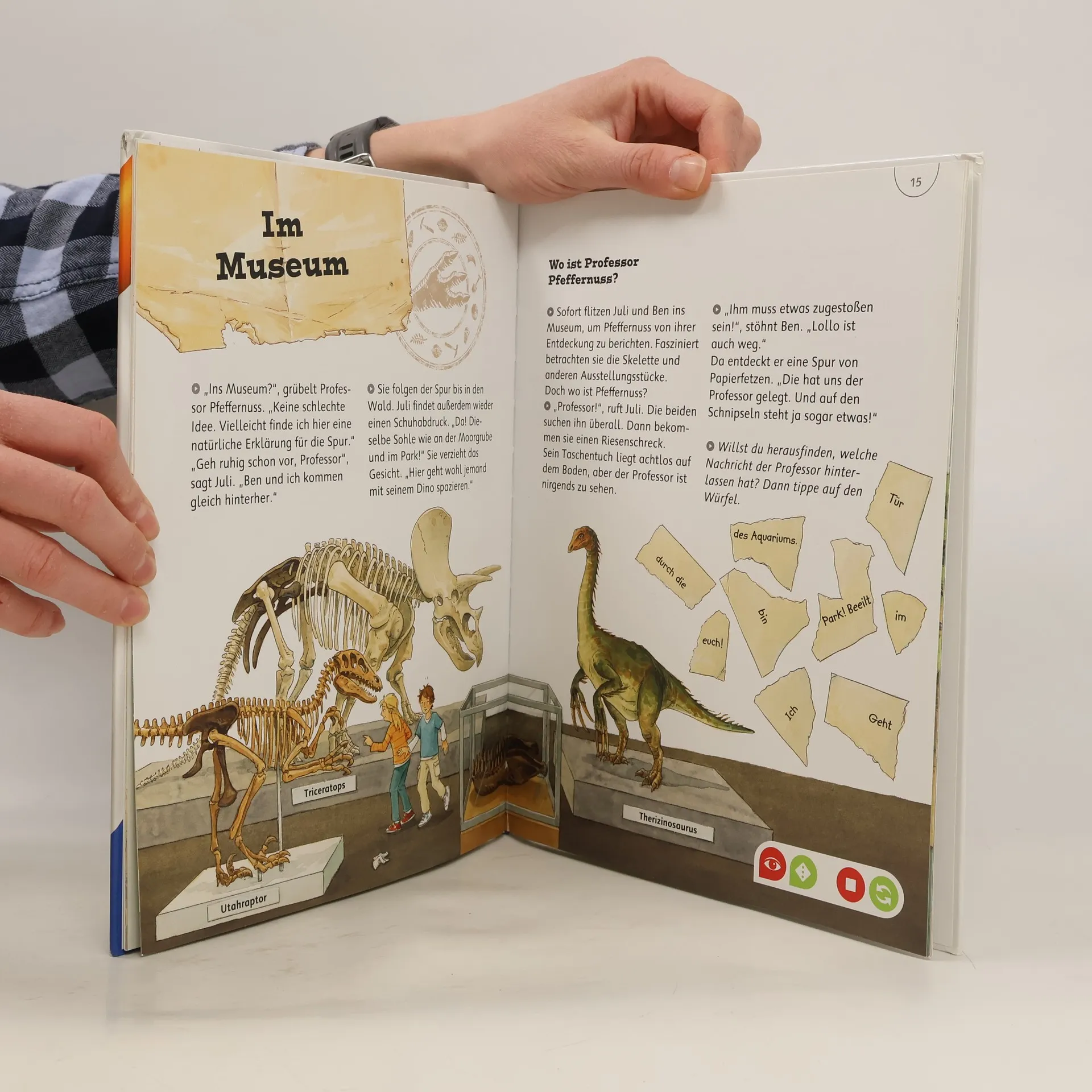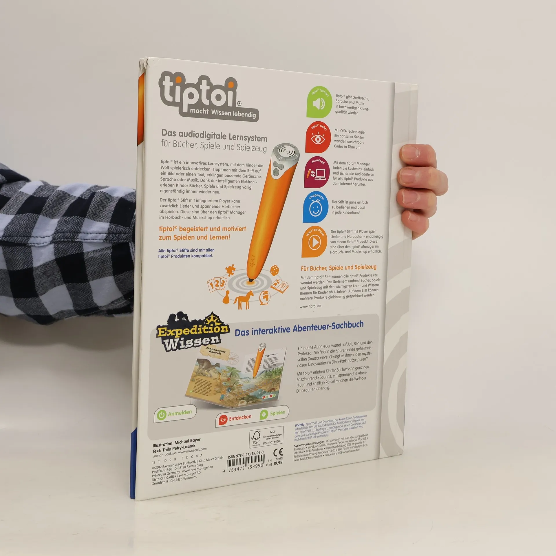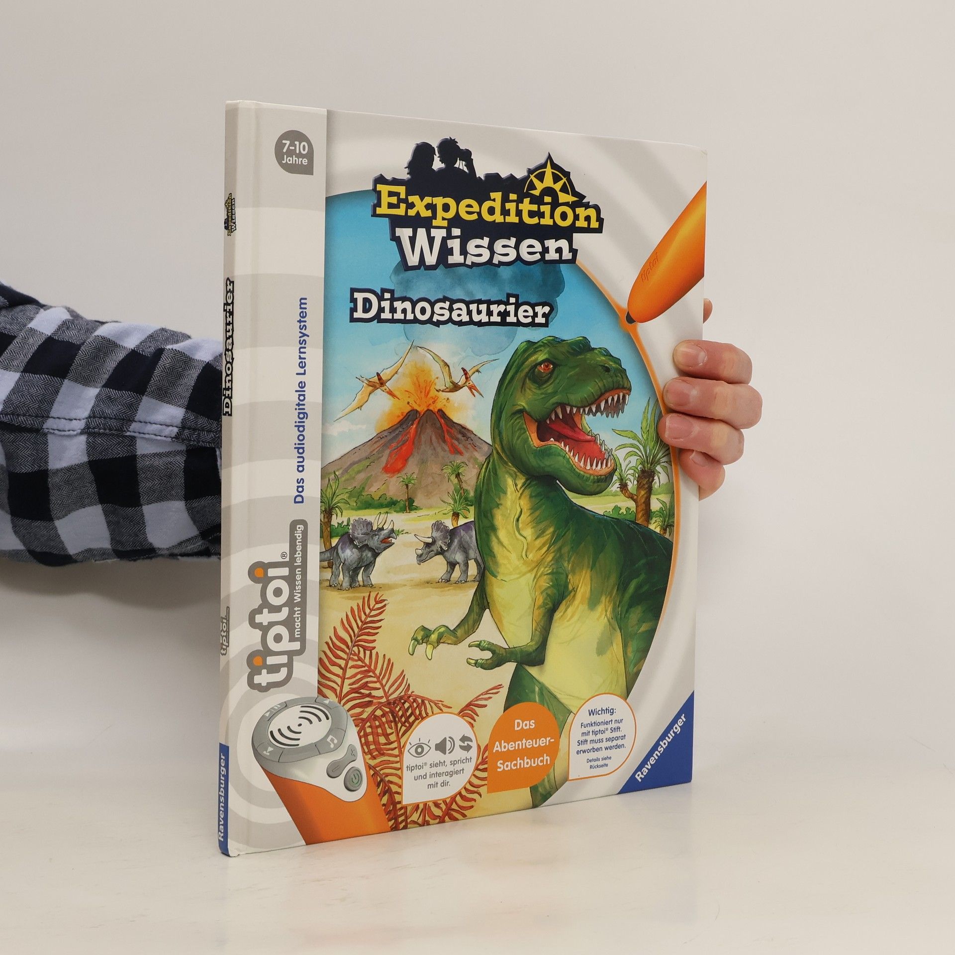 Komm mit in den Dinopark! Juli, Ben und Professor Pfeffernuss reisen nach Nordamerika. Hier soll ein neuer Dinopark eröffnet werden. Eine frische Dinosaurierspur deutet darauf hin, dass eine Dinoart überlebt haben könnte. Bei ihrer abenteuerlichen Suche durch den Park kommen die Kinder nach und nach mit Hilfe der Hinweise des tiptoi-Stiftes hinter das Geheimnis der Dinospur. Eingebettet in eine spannende Geschichte erfahren junge Leser Wissenswertes über die Welt der Dinosaurier. Juli, Ben, Professor Pfeffernuss und Papagei Lollo sind ein tolles Team. Sie interessieren sich für viele Sachthemen und egal wo sie auftauchen, passieren aufregende Dinge. Doch die Vier lösen jeden Fall. In der Reihe tiptoi Expedition Wissen erleben Kinder auf 32 Seiten Sachwissen, das in eine spannende Geschichte eingebunden ist. Die abgedruckte Geschichte kann selbst gelesen oder vom tiptoi-Stift vorgelesen werden. Beim Tipp auf die Bilder gibt es viel Wissenswertes zu Entdecken. Knifflige Rätsel und Spiele lassen die Kinder völlig in die Geschichte eintauchen und daran teilhaben.