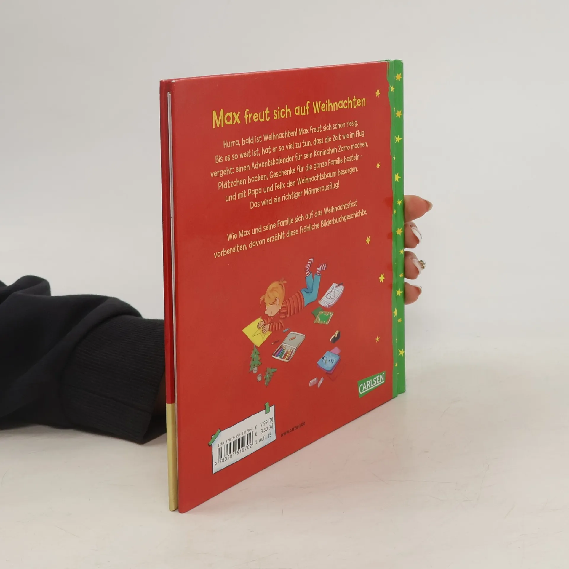 Ein Bilderbuch für die ganze Familie zum Vorlesen in der Advents- und Weihnachtszeit. Mit tollen Max-Leuchtstickern. Hurra, bald ist Weihnachten! Max freut sich schon riesig. Bis es soweit ist, hat er so viel zu tun, dass die Zeit wie im Flug vergeht: einen Adventskalender für sein Kaninchen Zorro machen, Plätzchen backen, Geschenke für die ganze Familie basteln – und mit Papa und Felix den Weihnachtsbaum besorgen. Das wird ein richtiger Männerausflug! Wie Max und seine Familie sich auf das Weihnachtsfest vorbereiten, davon erzählt diese fröhliche Geschichte. Sonderausgabe mit tollem EXTRA: Stickerbogen mit Glow-in-the-dark-Sternen! Mein Freund Max – starke Geschichten für Jungs! Max-Bilderbücher für Kinder ab 3 Jahren sind ideal zum gemeinsamen Anschauen und Vorlesen. Verständliche, witzige Texte und fröhliche Illustrationen vermitteln spielerisch Alltagswissen über Themen, die für Jungs im Kindergartenalter wichtig sind.