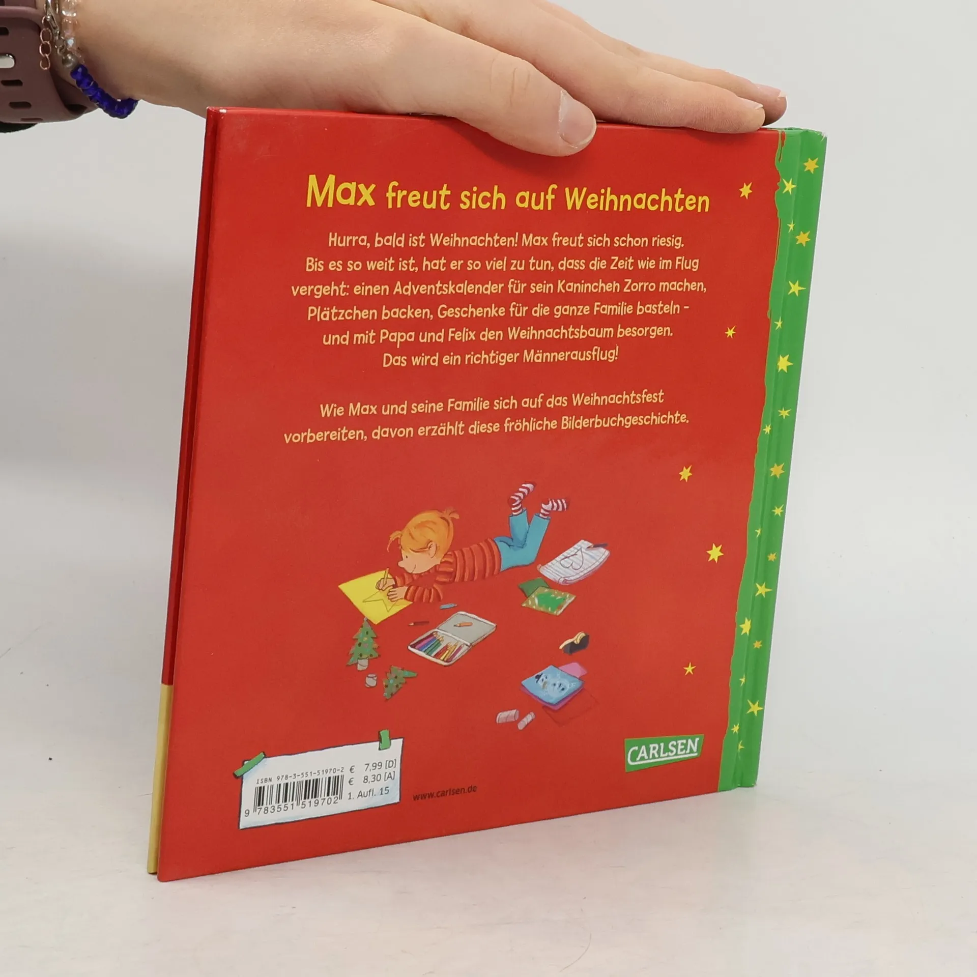 Ein Bilderbuch für die ganze Familie zum Vorlesen in der Advents- und Weihnachtszeit. Mit tollen Max-Leuchtstickern. Hurra, bald ist Weihnachten! Max freut sich schon riesig. Bis es soweit ist, hat er so viel zu tun, dass die Zeit wie im Flug vergeht: einen Adventskalender für sein Kaninchen Zorro machen, Plätzchen backen, Geschenke für die ganze Familie basteln – und mit Papa und Felix den Weihnachtsbaum besorgen. Das wird ein richtiger Männerausflug! Wie Max und seine Familie sich auf das Weihnachtsfest vorbereiten, davon erzählt diese fröhliche Geschichte. Sonderausgabe mit tollem EXTRA: Stickerbogen mit Glow-in-the-dark-Sternen! Mein Freund Max – starke Geschichten für Jungs! Max-Bilderbücher für Kinder ab 3 Jahren sind ideal zum gemeinsamen Anschauen und Vorlesen. Verständliche, witzige Texte und fröhliche Illustrationen vermitteln spielerisch Alltagswissen über Themen, die für Jungs im Kindergartenalter wichtig sind.