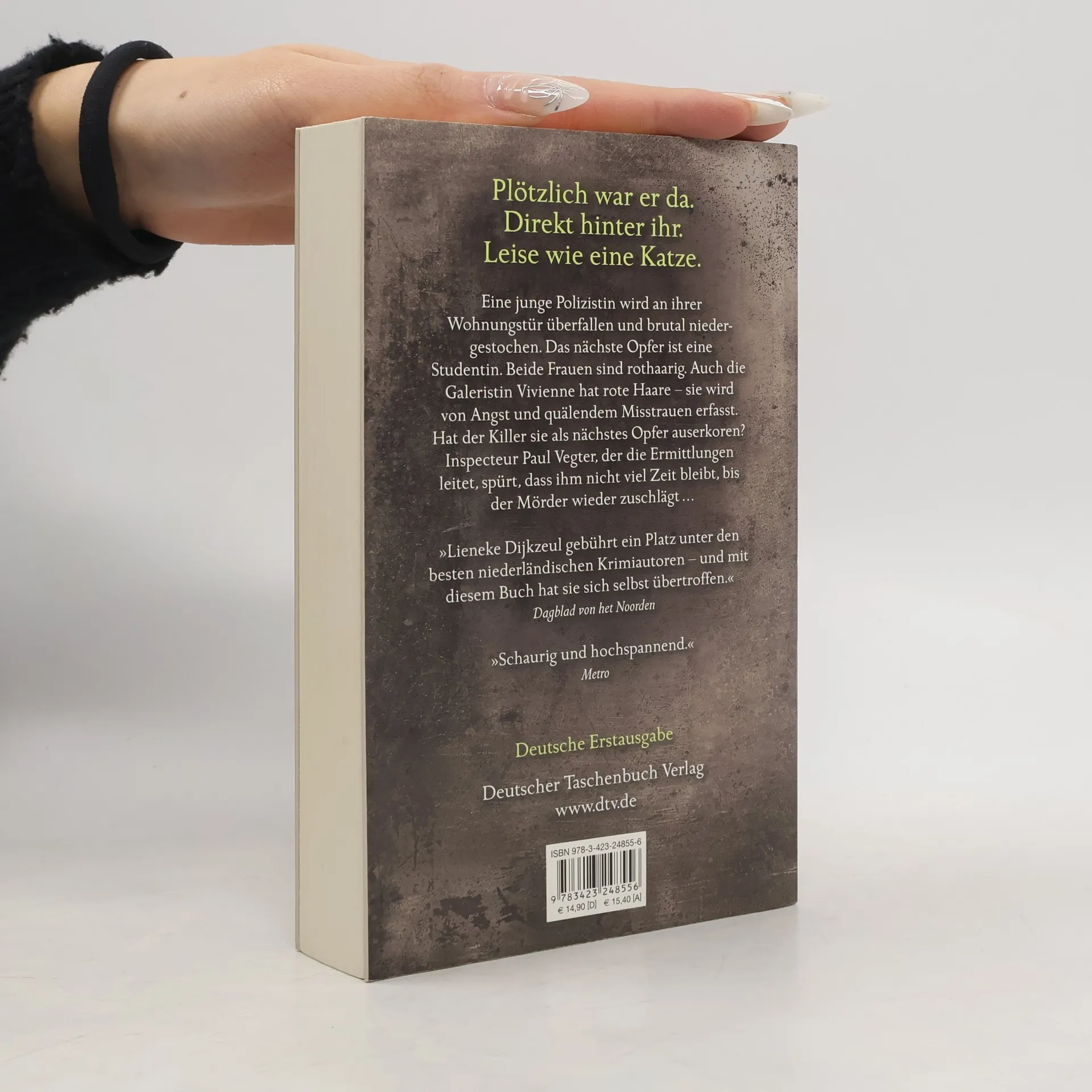 »Plötzlich war er da. Direkt hinter ihr. Leise wie eine Katze.« Ein schauriges Ende eines schwülheißen Sommertages: Die junge Polizistin Renée wird an ihrer Wohnungstür überfallen und brutal niedergestochen. Sie überlebt mit knapper Not. Ein paar Tage später findet man eine Studentin in einem Keller, ermordet. Die Frauen scheinen wenig gemeinsam zu haben – bis auf ihre roten Haare. Inspector Paul Vegter stürzt sich in diesen Fall, denn er hegt für Renée mehr als nur kollegiale Gefühle. Bald ahnt er, dass der Mörder erneut zuschlagen wird. Auch Galeristin Vivienne ist rothaarig. Als sie ihren Mann immer wieder beim Lügen ertappt, wird sie von quälendem Misstrauen erfasst: Ist er der Killer? Ist sie sein nächstes Opfer?