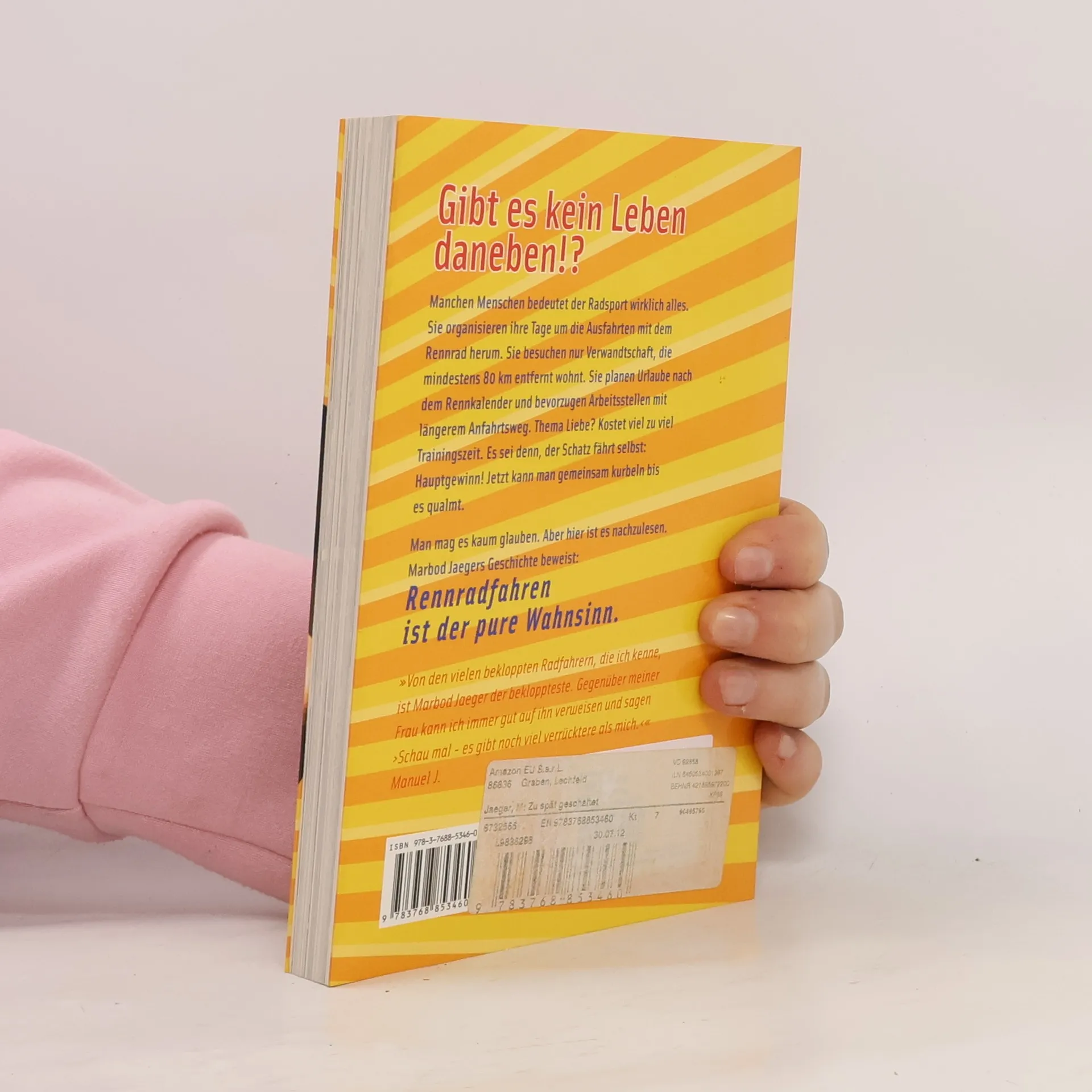 „Zu spät geschaltet“ ist die extrem witzige Geschichte eines Mannes, der das Rennradfahren entdeckt und darüber manch anderes aus dem Blickfeld verliert. Die Story dieses Rennrad-Romans kommt allen bekannt vor, die ihr Herz an dieses Sportgerät verloren haben und die Symptome des Rennradwahns an sich selbst diagnostizieren: Es beginnt mit Herzklopfen, schnell bricht offene Begeisterung aus. Unausweichlich folgen die Perspektivenverengung, der masochistische Wiederholungszwang, schließlich die Umkrempelung der Persönlichkeit. So ist das mit dem Rennradbazillus – wer ihn sich einfängt, ist früher oder später für den Rest der Welt verloren ... Marbod Jaeger ist einer von denen, die ihr Leben um die Ausfahrten mit und ohne Trainingsgruppe herum organisieren. Arbeitsstellen werden nach Anfahrtsweg bewertet (ab 30 km akzeptabel), Urlaube nach Rennkalendern organisiert, Liebesbeziehungen vorzugsweise über das Trainingsgerät geknüpft. Denn echte Hobbyisten wissen: Nichts auf der Welt ist von irgendeiner Bedeutung, außer den Stunden auf dem Rennrad.