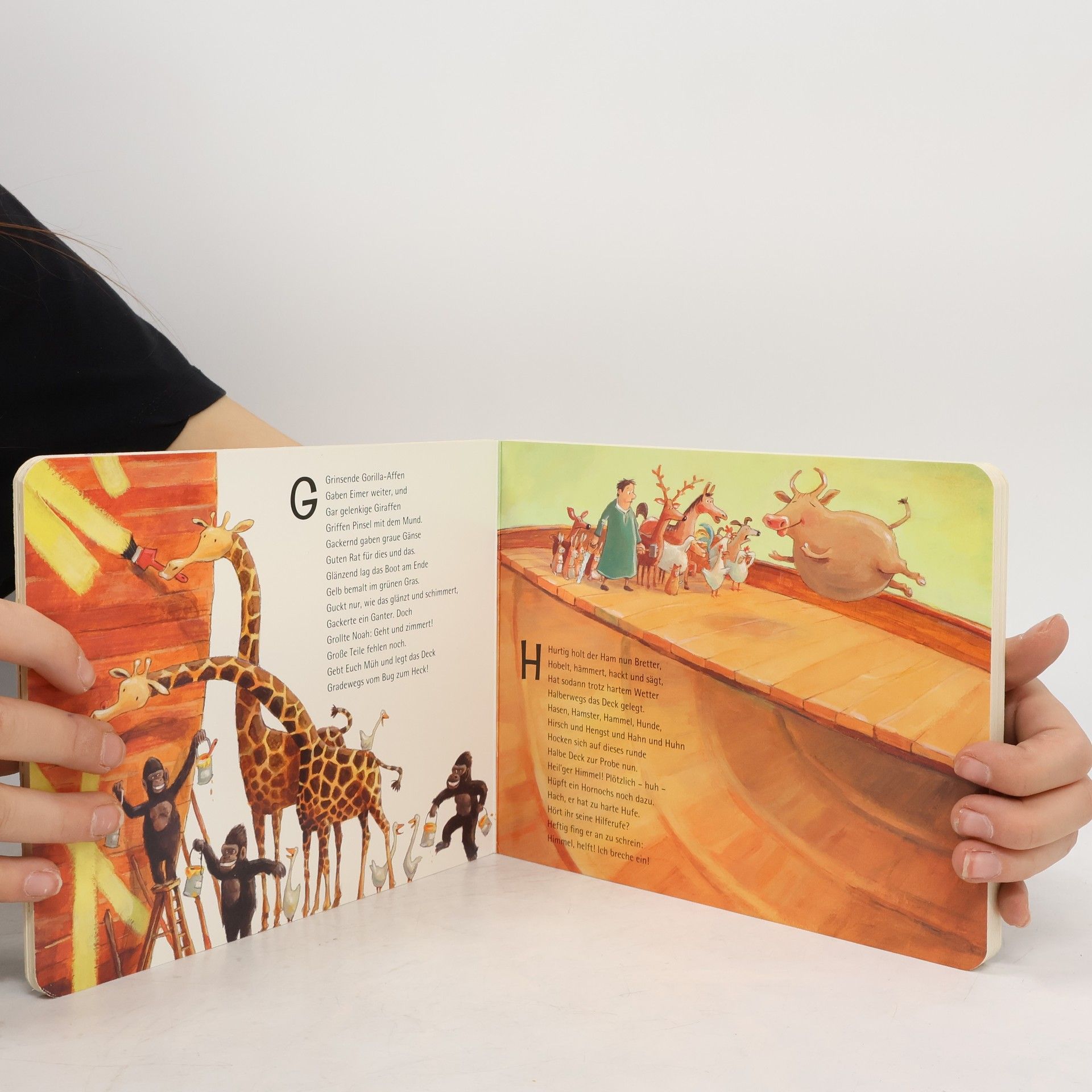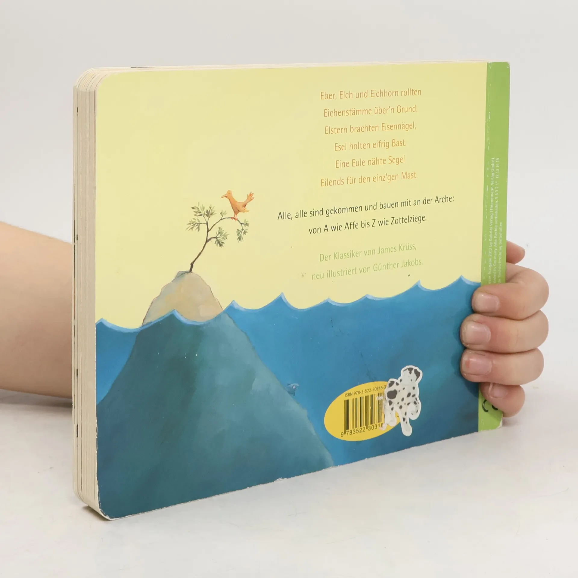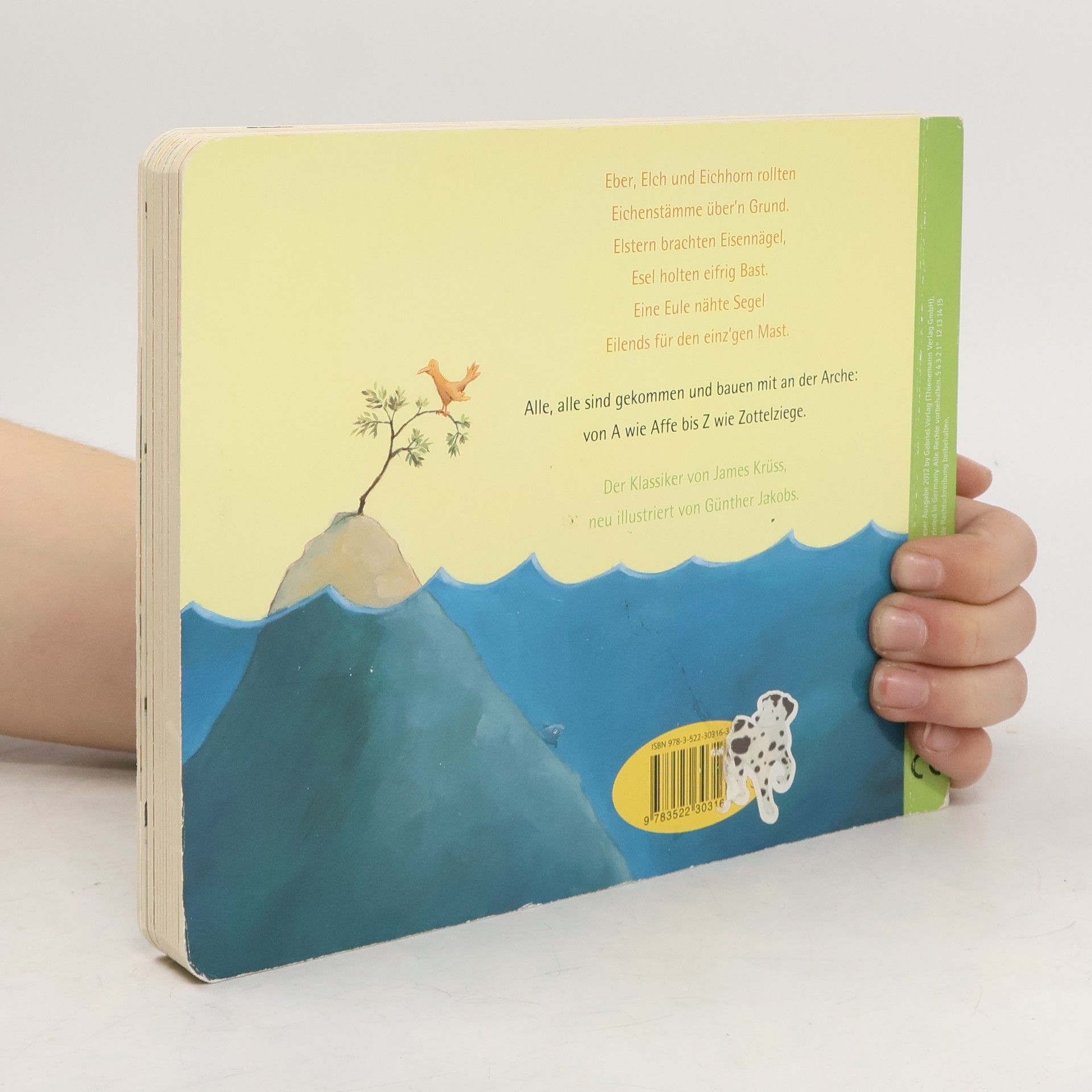 Eber, Elch und Eichhorn rollten Eichenstämme übern Grund. Elstern brachten Eisennägel, Esel holten eifrig Bast. Eine Eule nähte Segel Eilends für den einz´gen Mast. Alle, alle sind gekommen und bauen mit an der Arche: von A wie Affe bis Z wie Zottelziege. Der Klassiker von James Krüss, neu illustriert von Günther Jakobs jetzt als stabiles Pappbilderbuch. James Krüss, geboren 1926 auf Helgoland, ist einer der großen Kinderbuchautoren. Für sein Werk erhielt er zahlreiche Auszeichnungen, u. a. ist er Träger des deutschen Jugendbuchpreises und der Hans-Christian-Andersen-Medaille. Der Autor verstarb 1997 auf Gran Canaria. Günther Jakobs (Jahrgang 1978) studierte Illustration an der FH Münster. Er arbeitet seit seinem Abschluss erfolgreich als Illustrator für verschiedene Verlage im Bereich Kinderbuch, Sachbuch und Geschenkbuch.