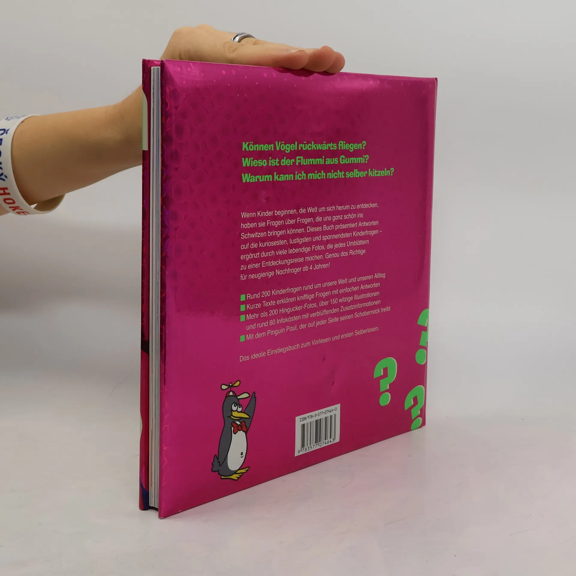 Wie kommt die Zahnpasta in die Tube? Wieso blubbert Wasser, wenn es kocht? Warum schwimmt eine Insel nicht weg? Wenn Kinder die Welt entdecken, dann stellen sie Fragen über Fragen: drollige, lustige, hellsichtige. Hier erhalten sie auf rund 200 kuriose Fragen kindgerechte Antworten. Ergänzt durch tolle Fotos und interessante Infoboxen. Neugierige Nachfrager ab 4 finden in diesem Band alles, was sie wissen wollen – und noch ein bisschen mehr. Zum Vorlesen und für Leseanfänger.
