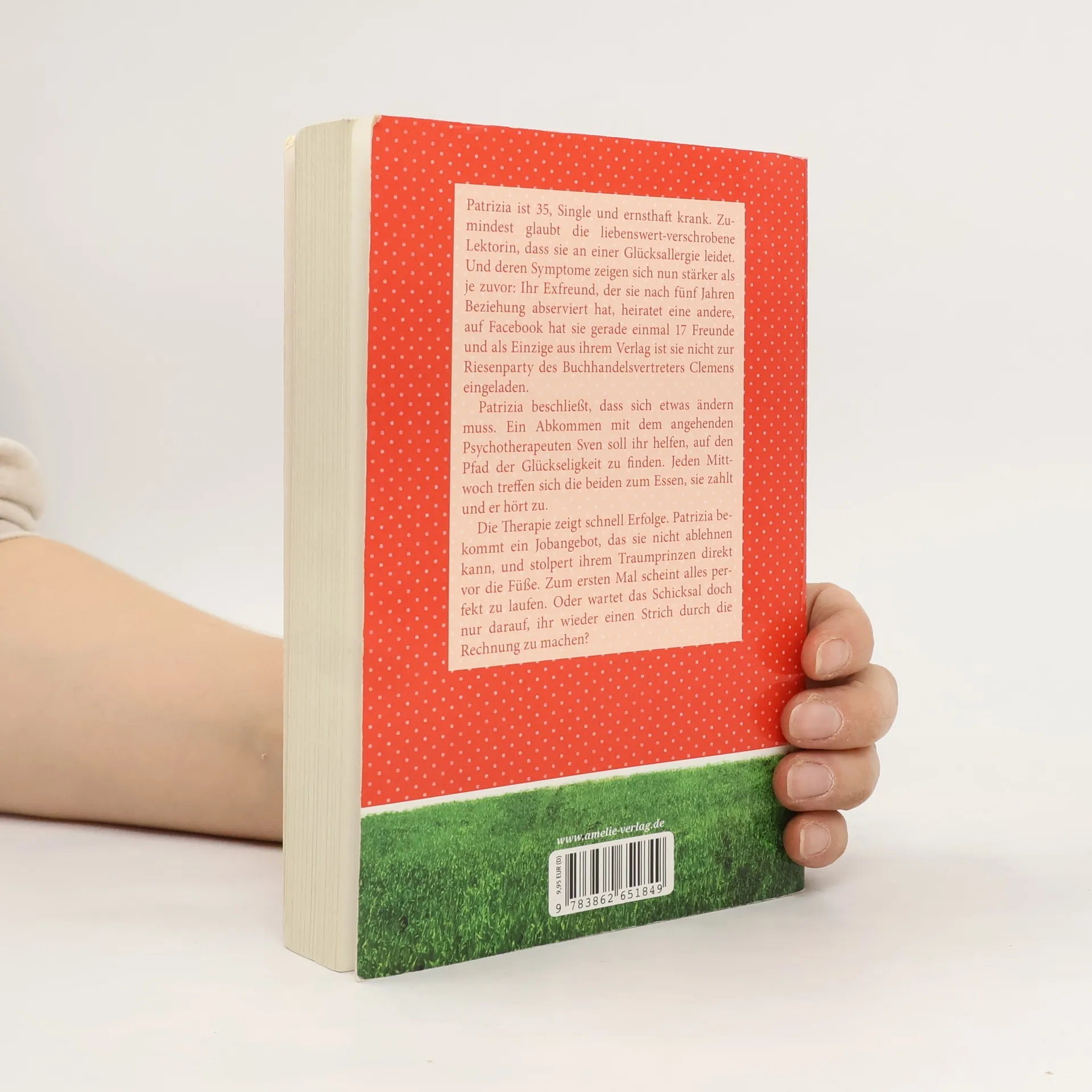 Patrizia ist 35, Single und ernsthaft krank – zumindest glaubt die liebenswert-verschrobene Lektorin das: Schon lange leidet sie an einer Glücksallergie. Und nun zeigen sich die Symptome stärker als je zuvor: Ihr Exfreund, der sie nach fünf Jahren Beziehung abserviert hat, heiratet eine andere, auf Facebook hat sie gerade einmal 17 Freunde und als Einzige aus ihrem Verlag ist sie nicht zur Riesenparty des Vertreters Clemens eingeladen. Patrizia beschließt, dass sich etwas ändern muss. Ein Selbstfindungsseminar soll ihr dabei helfen, endlich auf den Pfad der Glückseligkeit zu gelangen. Den findet sie zwar vorerst nicht, dafür aber den angehenden Psychotherapeuten Sven, mit dem sie ein Abkommen trifft: Jeden Mittwoch treffen sich die beiden zum Essen, sie zahlt und er hört zu. Die Therapie zeigt schnell Erfolge. Patrizia bekommt ein Jobangebot, das sie nicht ablehnen kann, und stolpert ihrem Traumprinzen direkt vor die Füße. Zum ersten Mal scheint alles nach Plan zu verlaufen. Oder wartet das Schicksal doch nur darauf, ihr wieder einen Strich durch die Rechnung zu machen?