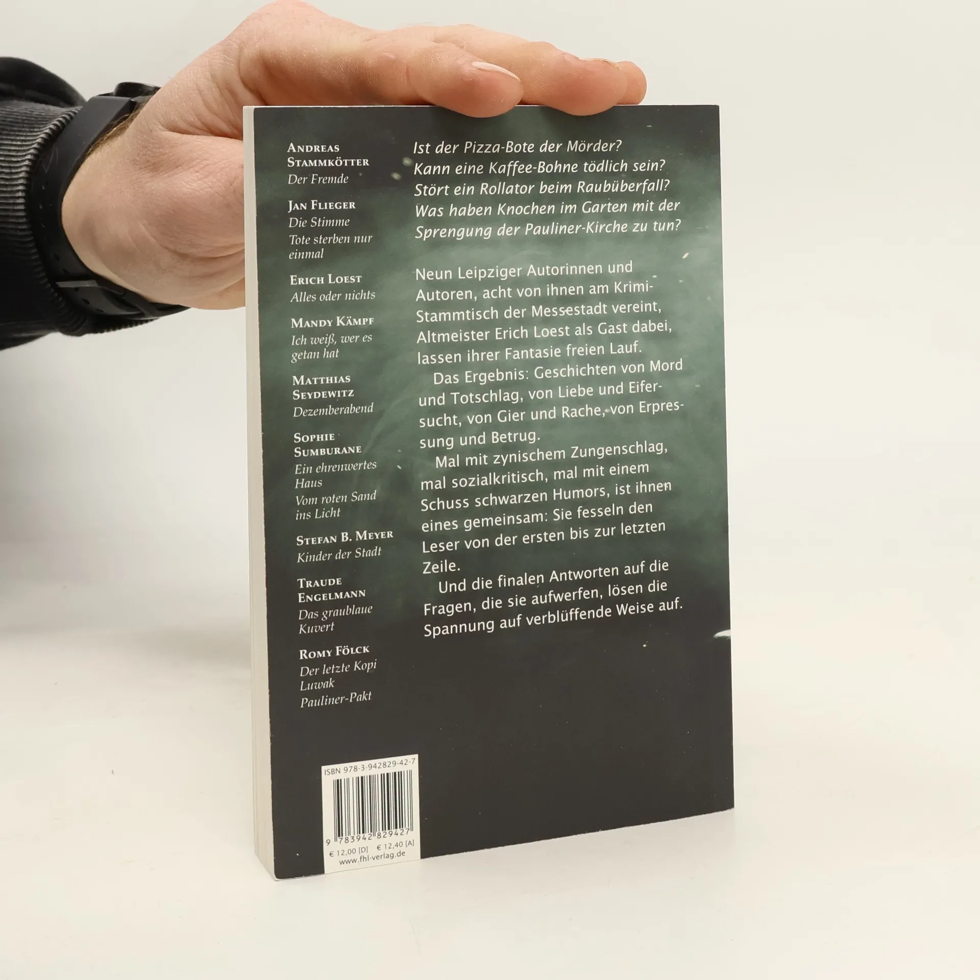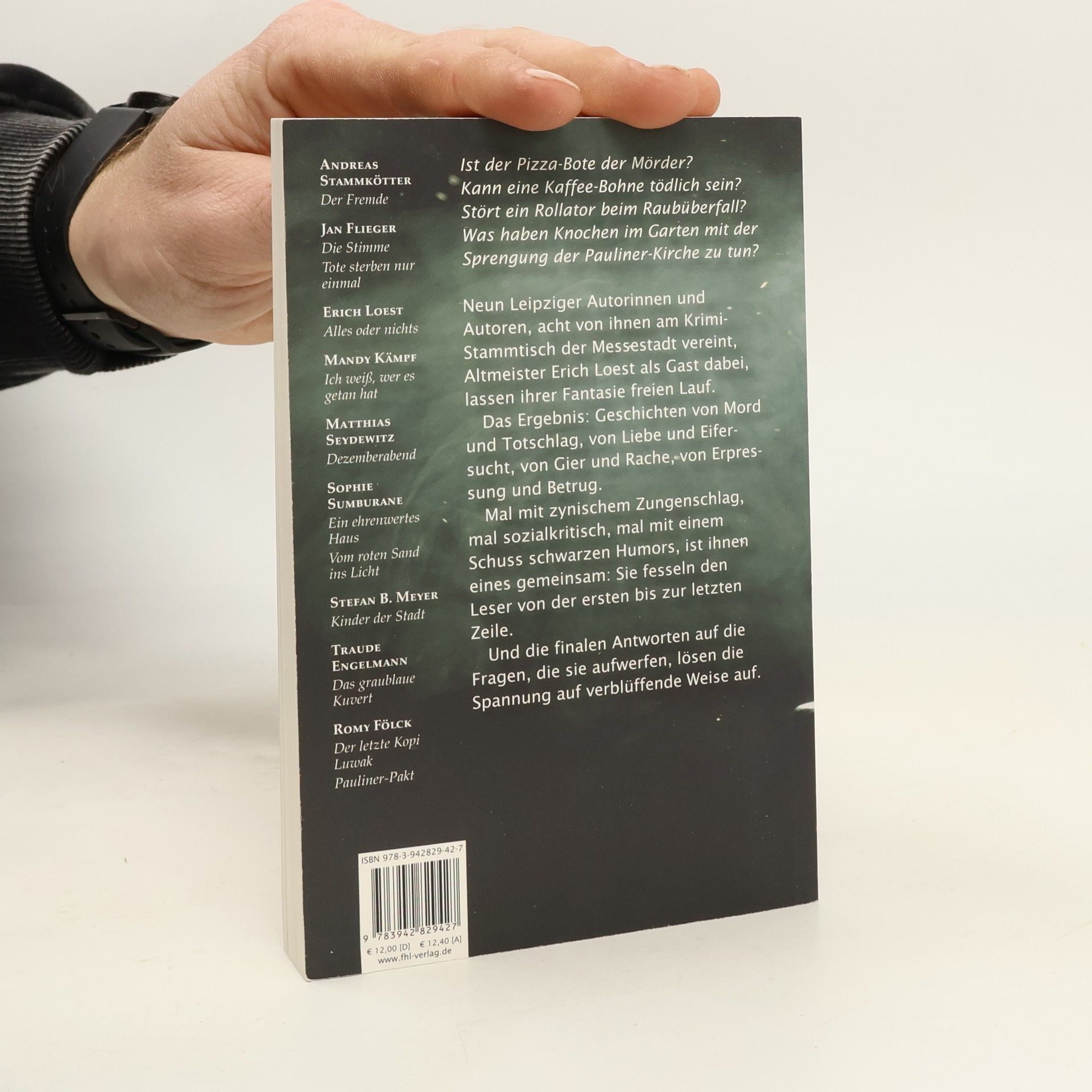 Ist der Pizza-Bote der Mörder? Kann eine Kaffee-Bohne tödlich sein? Stört ein Rollator beim Raubüberfall? Was haben Knochen im Garten mit der Sprengung der Pauliner-Kirche zu tun? Neun Leipziger Autorinnen und Autoren, acht von ihnen am Krimi-Stammtisch der Messestadt vereint, Altmeister Erich Loest als Gast dabei, lassen ihrer Fantasie freien Lauf. Das Ergebnis: Geschichten von Mord und Totschlag, von Liebe und Eifersucht, von Gier und Rache, von Erpressung und Betrug. Mal mit zynischem Zungenschlag, mal sozialkritisch, mal mit einem Schuss schwarzen Humors, ist ihnen eines gemeinsam: Sie fesseln den Leser von der ersten bis zur letzten Zeile. Und die finalen Antworten auf die Fragen, die sie aufwerfen, lösen die Spannung auf verblüffende Weise auf. Hartwig Hochstein war von 1991 bis 2003 Chefredakteur der Leipziger Volkszeitung, seitdem lebt und arbeitet er als freier Publizist und Moderator in Leipzig. Für seine alte Zeitung schreibt er regelmässig Krimi-Rezensionen.
