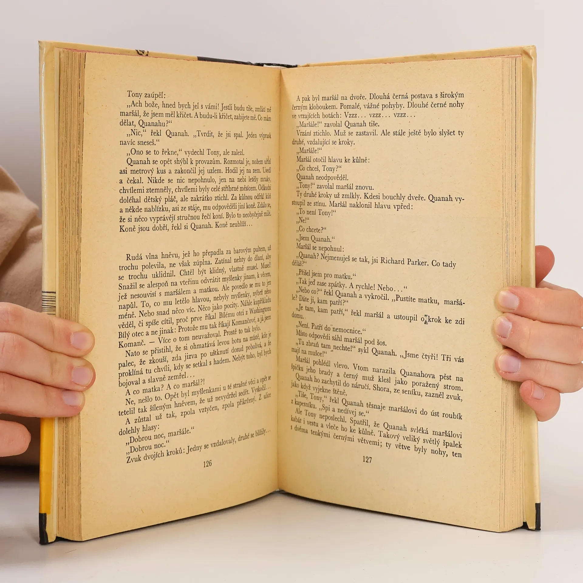 Děj dobrodružného románu se odehrává asi před sto lety na jihozápadě Spojených států, kdy se do zdejšího kraje hrnuli kolonisté v naději na lepší život. Hrdinou je příslušník tragicky vypuzovaného indiánského kmene Komančů Quanaha, Velký medvěd. Statečně bojuje za spravedlivou věcsvého kmene proti civilizovanému světu. Kniha upoutá líčením odvážných činů, které svědčí o lidské neohroženosti a cti. KOD 127