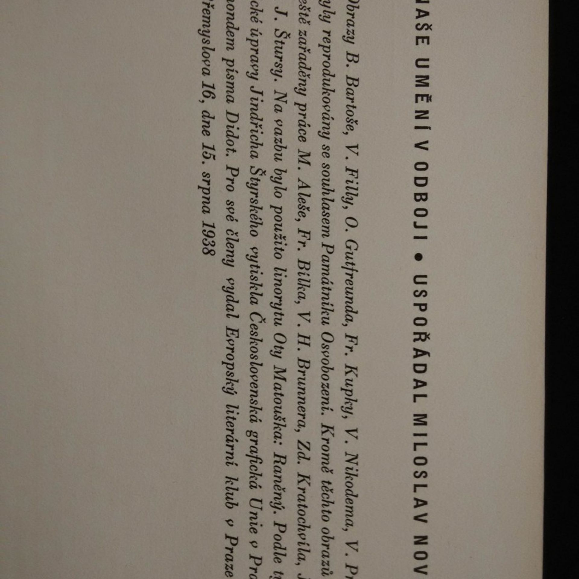Kniha obsahuje texty velkého množství českých básníků, literátů a obrazy B. Bartoše, E. Filly, O. Gutfreunda, F. Kupky, V. Nikodema, V. Preissiga, M. Aleše, F. Bílka, V. H. Brunnera, Z. Kratochvíla, J. Lady a J. Štursy. Na vazbu bylo použito linorytu Oty Matouška: Raněný. Typo Jindřich Štýrský.