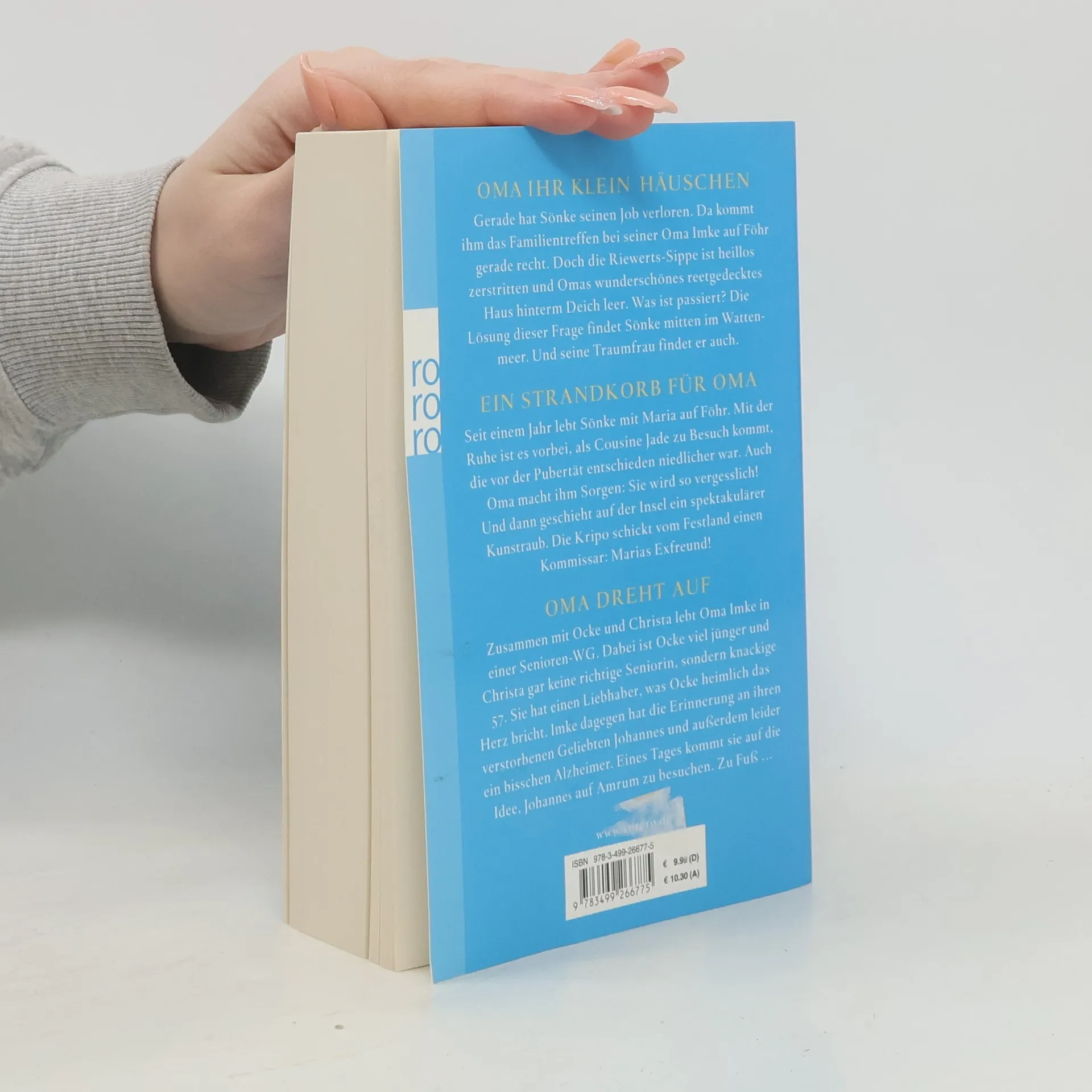 Oma ihr klein Häuschen Gerade hat Sönke seinen Job verloren. Da kommt ihm das Familientreffen bei seiner Oma Imke auf Föhr gerade recht. Doch die Riewerts-Sippe ist heillos zerstritten und Omas wunderschönes reetgedecktes Haus hinterm Deich leer. Was ist passiert? Die Lösung dieser Frage findet Sönke mitten im Wattenmeer. Und seine Traumfrau findet er auch. Ein Strandkorb für Oma Seit einem Jahr lebt Sönke mit Maria auf Föhr. Mit der Ruhe ist es vorbei, als Cousine Jade zu Besuch kommt, die vor der Pubertät entschieden niedlicher war. Auch Oma macht ihm Sorgen: Sie wird so vergesslich! Und dann geschieht auf der Insel ein spektakulärer Kunstraub, und die Kripo schickt vom Festland einen Kommissar: Marias Exfreund! Oma dreht auf Zusammen mit Ocke und Christa lebt Oma Imke in einer Senioren-WG. Dabei ist Ocke viel jünger und Christa gar keine richtige Seniorin, sondern knackige 57. Sie hat einen Liebhaber, was Ocke heimlich das Herz bricht. Imke dagegen hat die Erinnerung an ihren verstorbenen Geliebten Johannes und außerdem leider ein bisschen Alzheimer. Eines Tages kommt sie auf die Idee, Johannes auf Amrum besuchen. Zu Fuß…