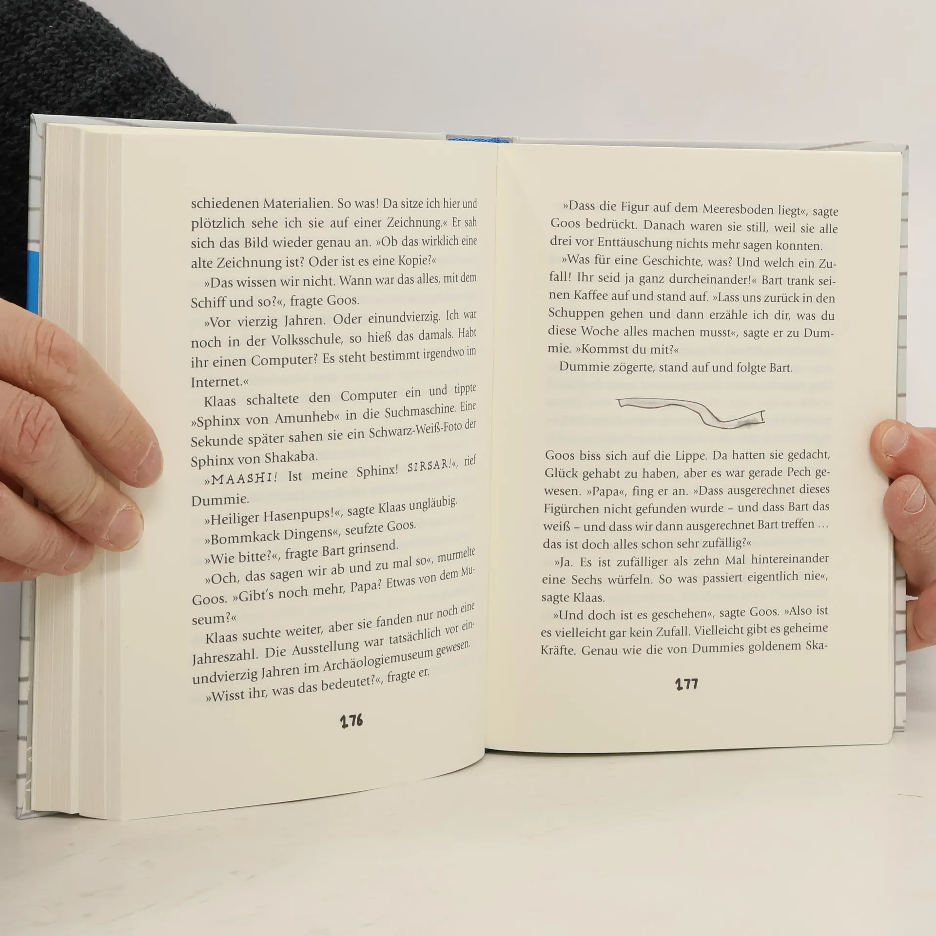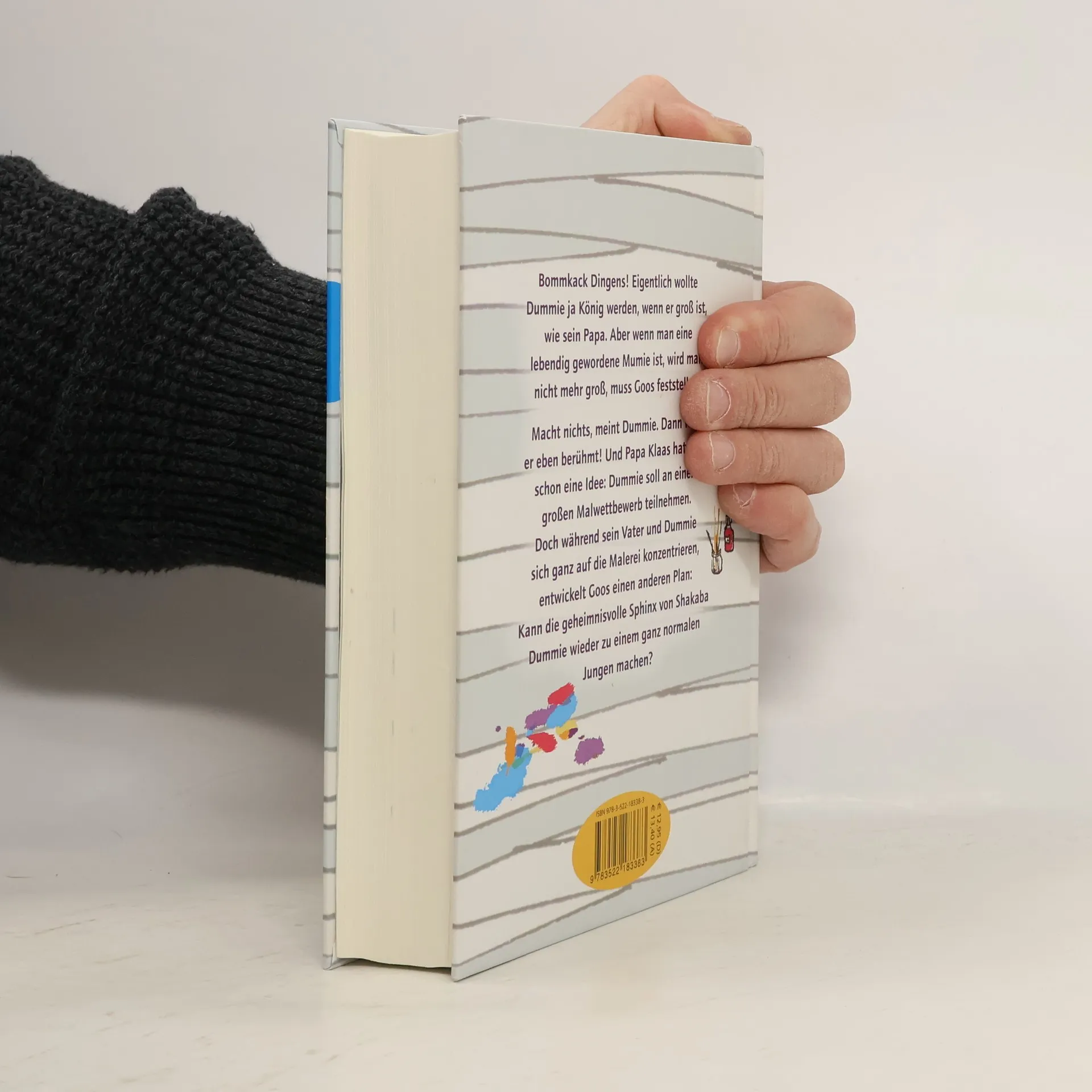 Bommkack Dingens! Eigentlich wollte Dummie ja König werden, wenn er groß ist, wie sein Papa. Aber wenn man eine lebendig gewordene Mumie ist, wird man nicht mehr groß, muss Goos feststellen. Macht nichts, meint Dummie. Dann wird er eben berühmt! Und Papa Klaas hat auch schon eine Idee: Dummie soll an einem großen Malwettbewerb teilnehmen. Doch während sein Vater und Dummie sich ganz auf die Malerei konzentrieren, entwickelt Goos einen anderen Plan: Kann die geheimnisvolle Sphinx von Shakaba Dummie wieder zu einem ganz normalen Jungen machen?