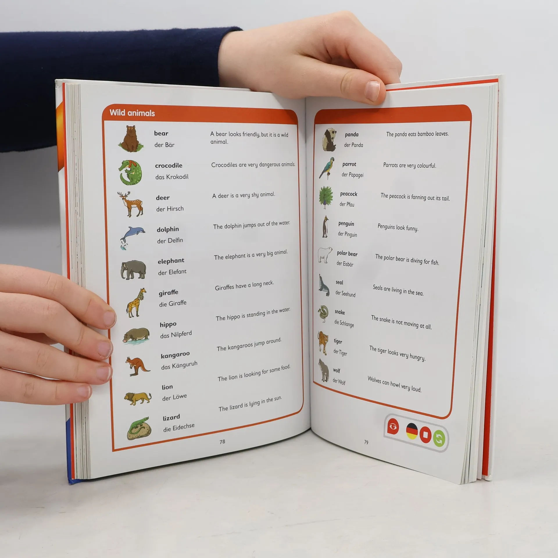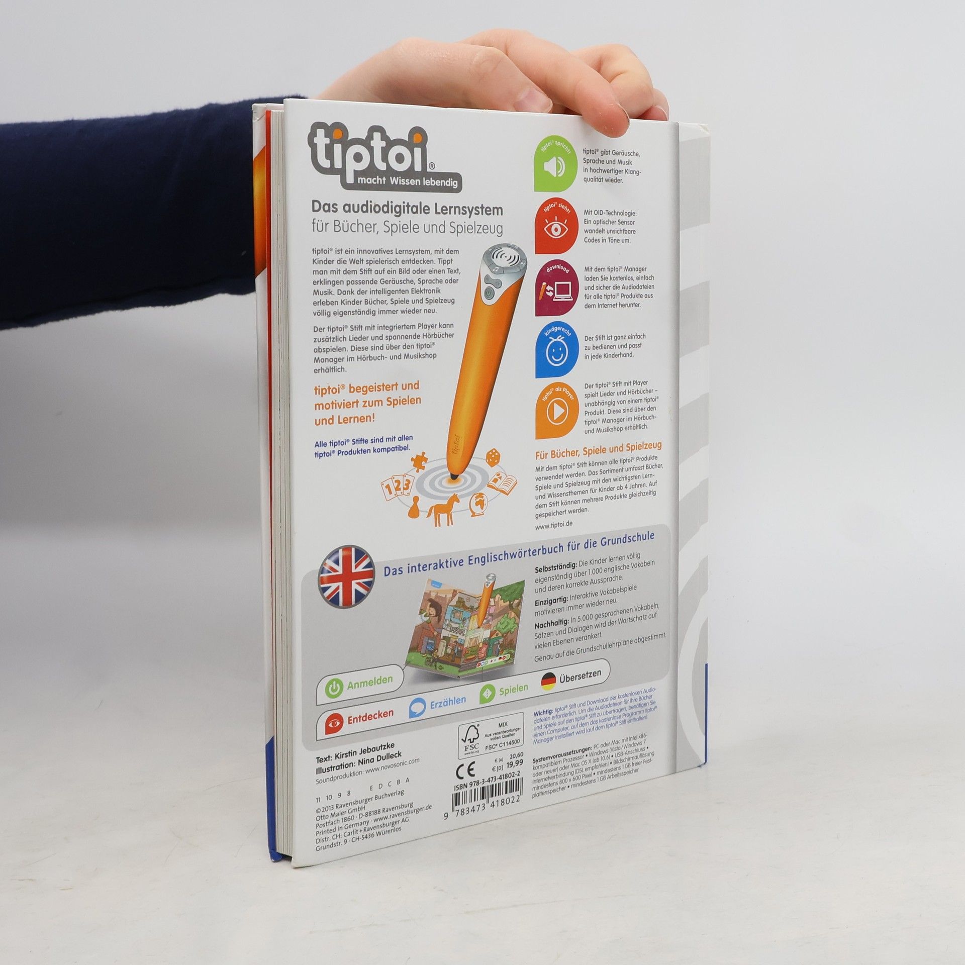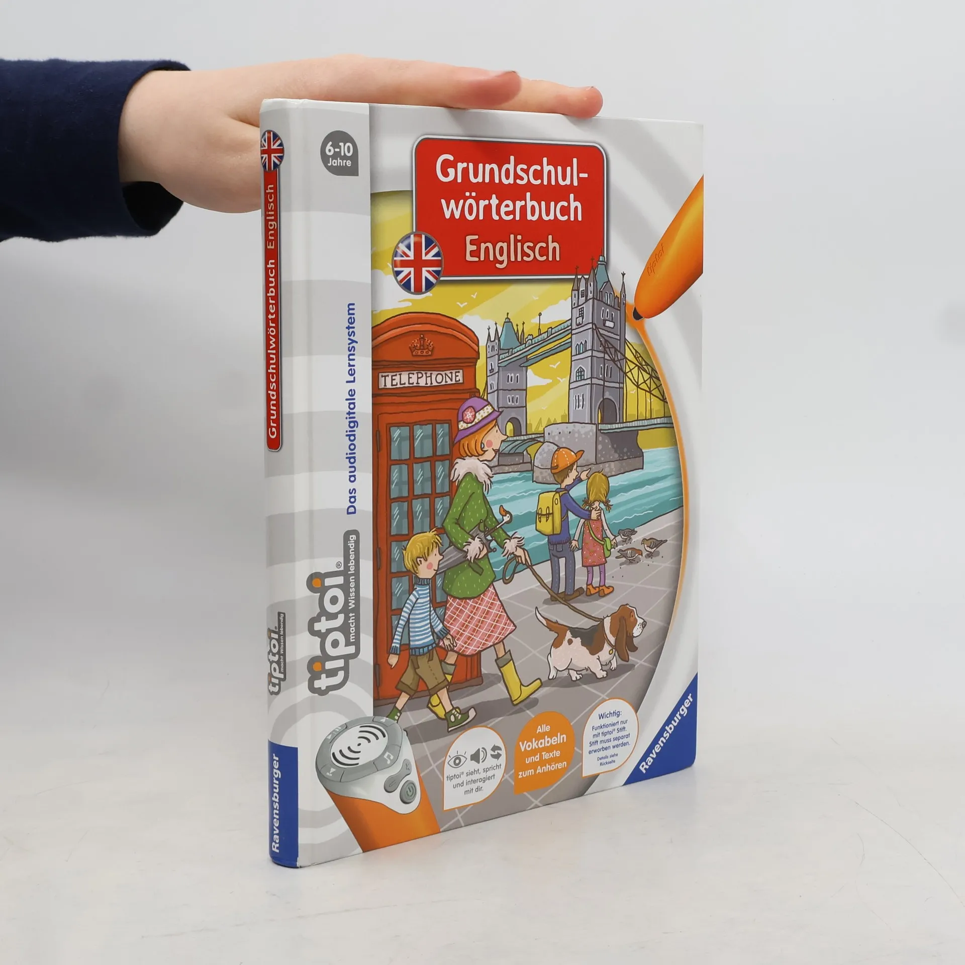 So macht Englisch lernen Spaß! Mit tiptoi spielerisch englische Wörter lernen: Der umfangreiche Wortschatz in diesem Buch deckt die wichtigsten Lebensbereiche der Kinder ab: Zuhause, In der Schule, Beim Einkaufen, Sport und Hobbies, Rund ums Jahr und einiges mehr. Mit zusätzlichen Abbildungen und Beispielsätzen eignen sich die Kinder über 1.000 englische Wörter und deren korrekte Aussprache an. Zusätzlich motivieren viele Vokabel-Spiele zum Üben dabei immer wieder neu. Das interaktive Englisch-Wörterbuch für die Grundschule. Mit über 1.000 Einträgen aus dem Alltagswortschatz der Schulkinder. Das Wörterbuch ist thematisch gegliedert: At home, At school, At the clothes shop, At the supermarket, At the doctors, Sports and hobbies, At the zoo, Down on the farm, In town, Around the year. Nach einer Einstiegs-Doppelseite in jedes Thema folgen Wörterbuch-Seiten, auf denen der tiptoi-Stift als Vorleser fungiert. So wird auch die korrekte Aussprache verinnerlicht. Zu jeder englischen Vokabel gibt es eine Abbildung, eine Übersetzung und einen Beispielsatz. Der Wortschatz wird zusätzlich durch kleine Dialoge vertieft. In interaktiven Spielen können die Kinder das Gelernte üben, was einen nachhaltigen Lernerfolg garantiert. tiptoi-Stift nicht enthalten. Muss separat erworben werden.