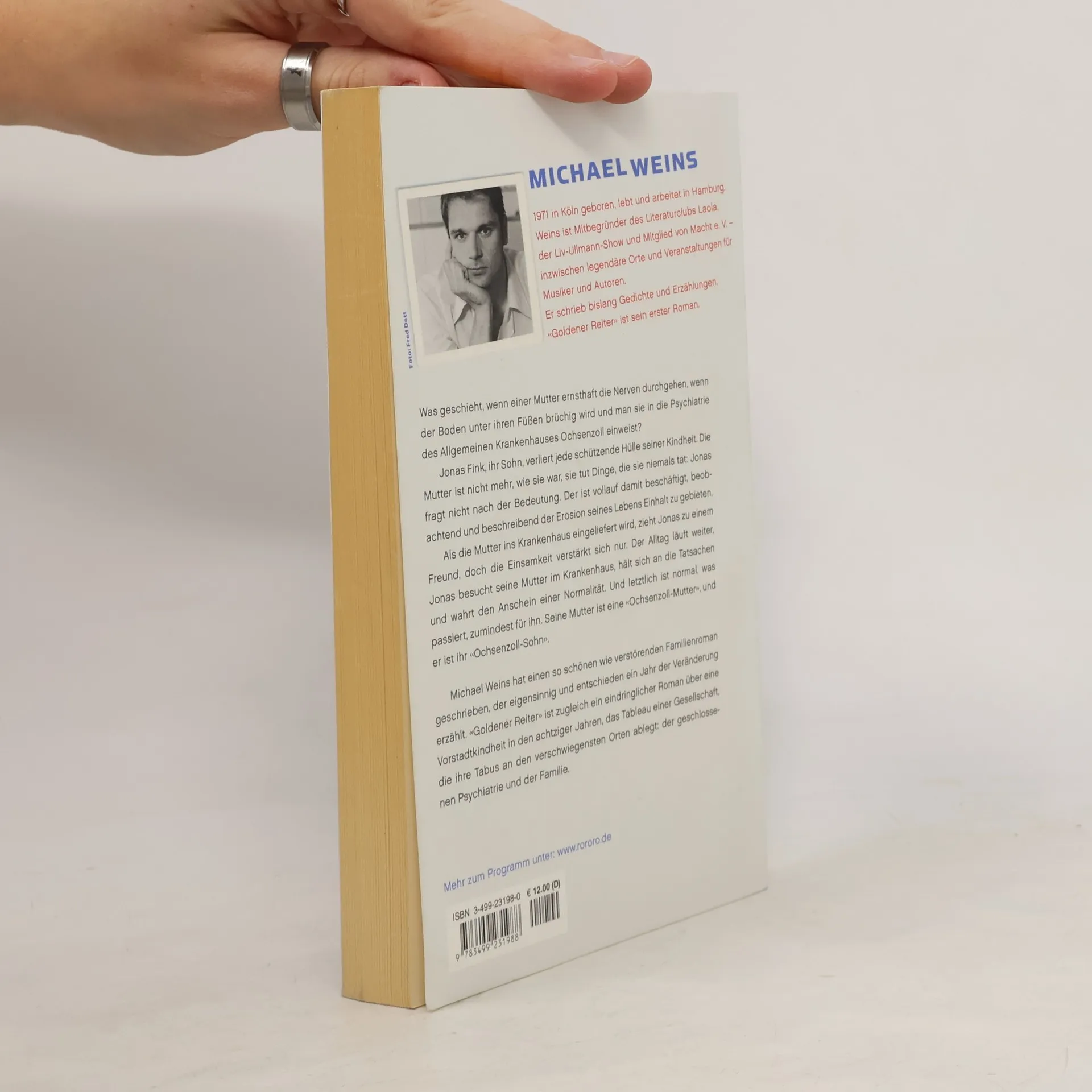 Was geschieht, wenn einer Mutter ernsthaft die Nerven durchgehen, wenn der Boden unter ihren Füßen brüchig wird und man sie in die Psychiatrie einweist, nach Ochsenzoll? Jonas Fink verliert jede schützende Hülle seiner Kindheit. Die Mutter ist nicht mehr, wie sie war, sie tut Dinge, die sie niemals tat, und Jonas ist vollauf damit beschäftigt, beobachtend und beschreibend der Erosion seines Lebens Einhalt zu gebieten. Er hält sich an die Tatsachen. Er wahrt den Anschein von Normalität. Denn letztlich ist normal, was passiert, zumindest für ihn: Seine Mutter ist eine Ochsenzoll -Mutter und er ist ihr Ochsenzoll -Sohn. Man kann nicht anders: Man ist sofort auf Jonas Finks Seite, erlebt das Entgleiten der Mutter durch seine Augen und Ohren. Diese Perspektive ist bestechend – und das unzerreißbare Band zwischen einem Kind und seiner Mutter wurde selten so schön beschrieben. Michael Weins gelingt es eindrucksvoll, mit starken Bildern und stilistischer Entschiedenheit von einem Jahr der Veränderung zu erzählen.