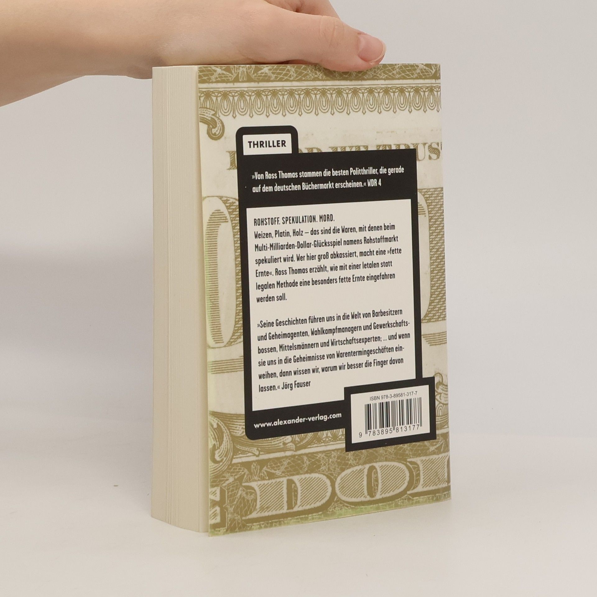 ROHSTOFF. SPEKULATION. MORD. Weizen, Platin, Holz – das sind die Waren, mit denen bei dem Multi-Milliarden-Dollar-Glücksspiel namens Rohstoffmarkt spekuliert wird. Wer hier groß abkassiert, macht eine „fette Ernte“. Ross Thomas, meisterhafter Berichterstatter dunkler Machenschaften aus den Hinterzimmern der Mächtigen, erzählt, wie mit einer letalen statt legalen Methode eine besonders fette Ernte eingefahren werden soll.