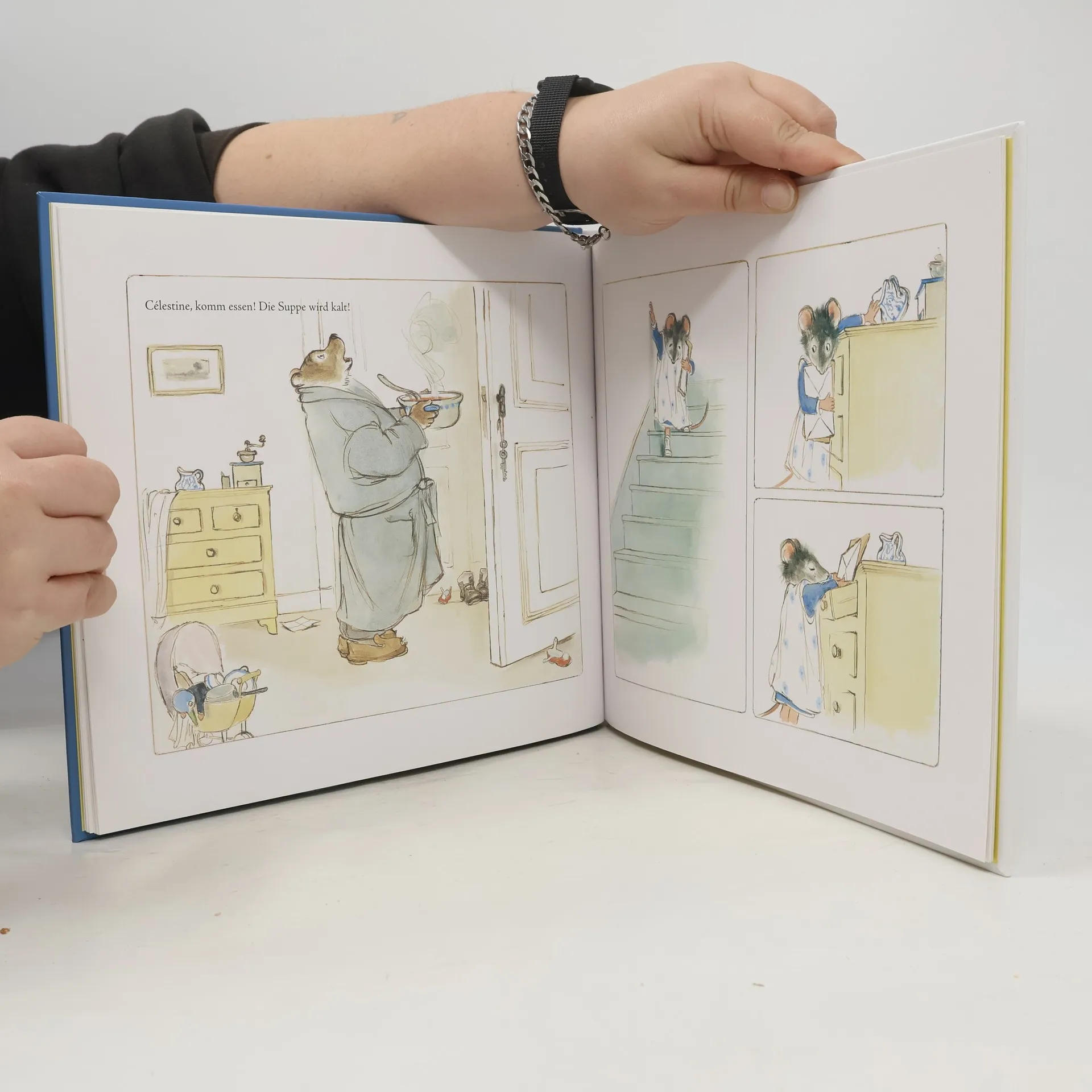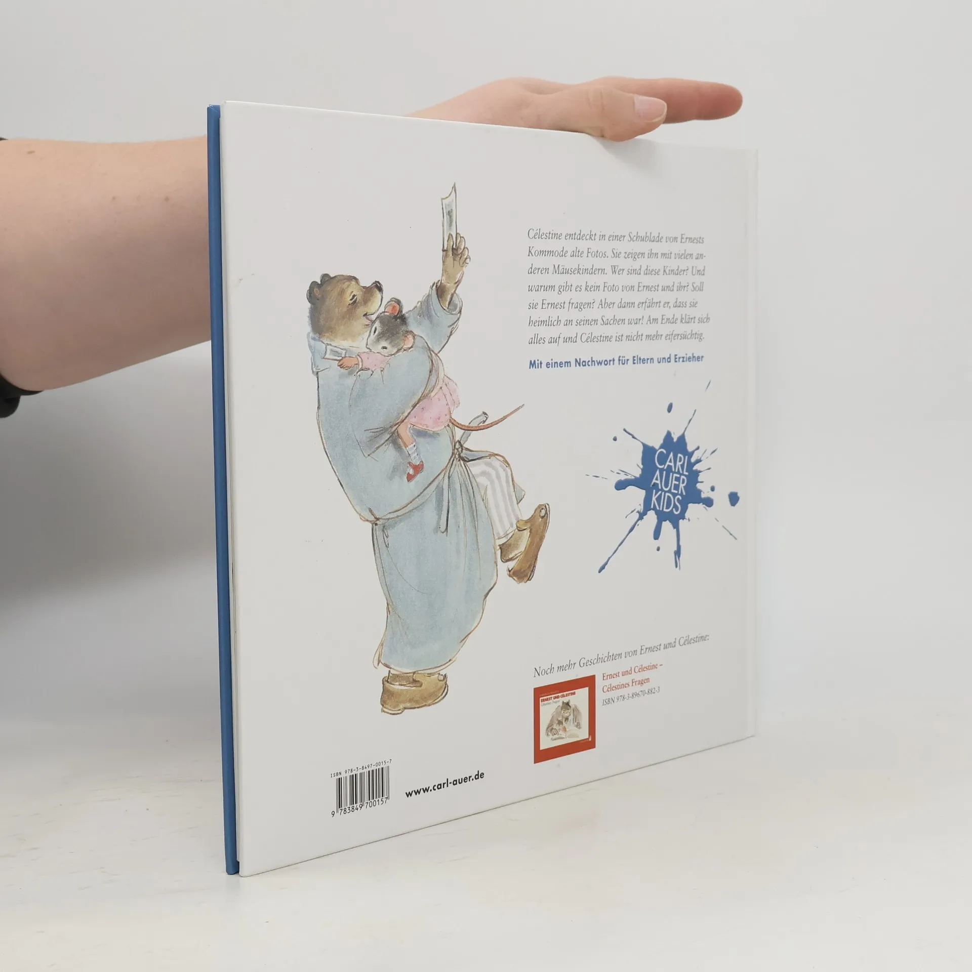 Ernest, der große Bär, und Célestine, die kleine Maus, passen auf den ersten Blick überhaupt nicht zusammen; aber die beiden sind ein Herz und eine Seele. Doch eines Tages macht Célestine eine Entdeckung, die ihr Vertrauen wanken lässt. Als sie während seiner Abwesenheit heimlich in Ernests Schubladen schnüffelt, entdeckt sie alte Bilder. Sie zeigen Ernest mit vielen Mäusekindern, die ihn fröhlich umringen; und keines davon zeigt sie! Célestine ist eifersüchtig. Bei Ernests Rückkehr traut sich Célestine nicht, ihre Gefühle zu offenbaren; schließlich hat sie Ernest nicht um Erlaubnis gefragt, die Kommode öffnen zu dürfen. Ernest gelingt es schließlich, das Geheimnis von Célestines Kummer behutsam zu lüften – und beide finden eine Lösung, die nicht nur die kleine Maus zum Strahlen bringt.
