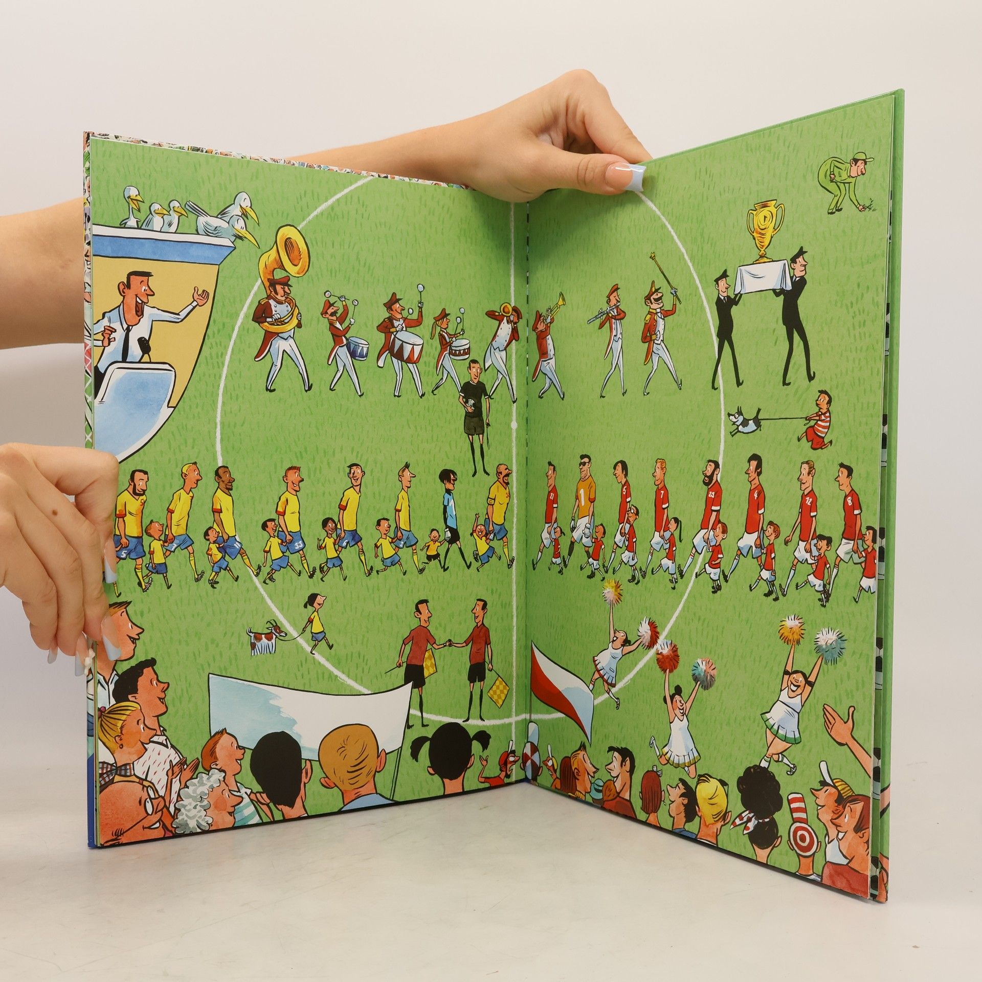 Was für ein Trubel auf dem Fußballplatz! Ob die Minis trainieren oder die Profis im Endspiel stehen, es geht ordentlich rund. Aufgeregt ist die Stimmung im Stadion, ausgelassen beim Public Viewing und der großen Finalfeier. Auf den doppelseitigen Bildern entdeckt der Nachwuchs-Fußballfan viele, viele lustige Details und lernt das wichtigste Know-How: Schuss- und Foularten, Fußballutensilien und Schiedsrichterzeichen. Anpfiff für WM und Fußballverein!