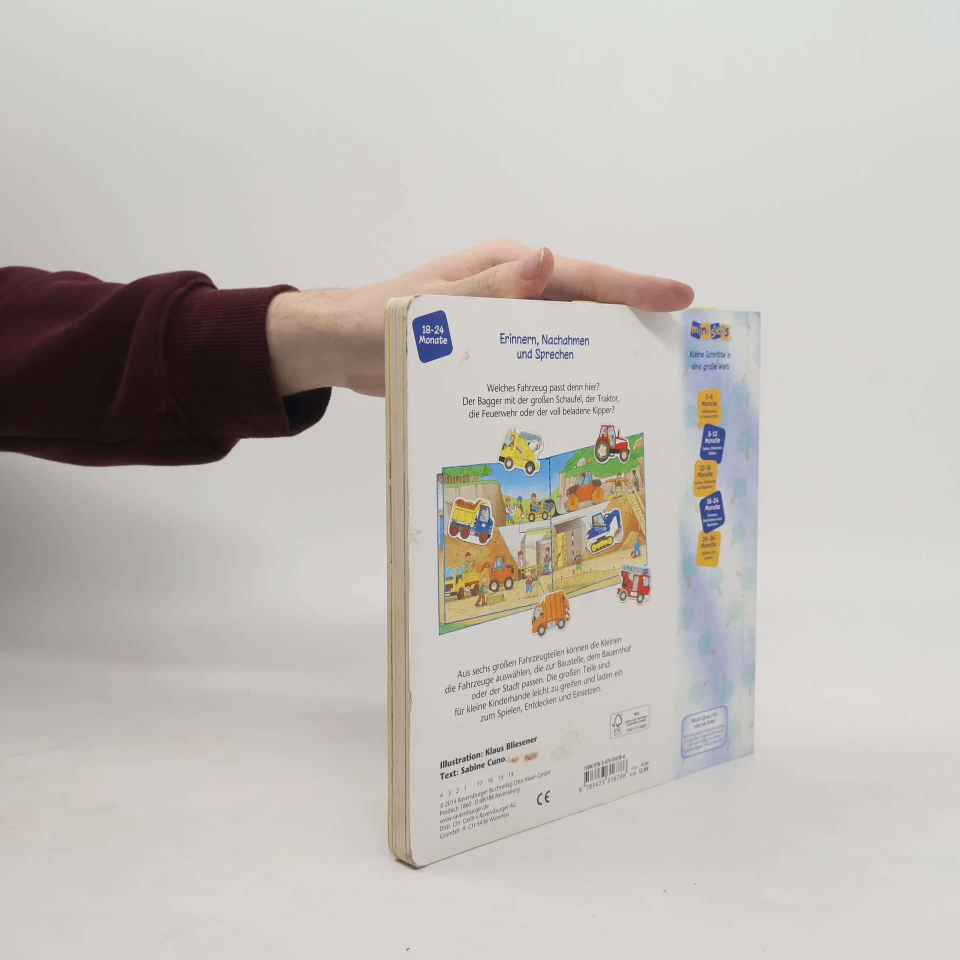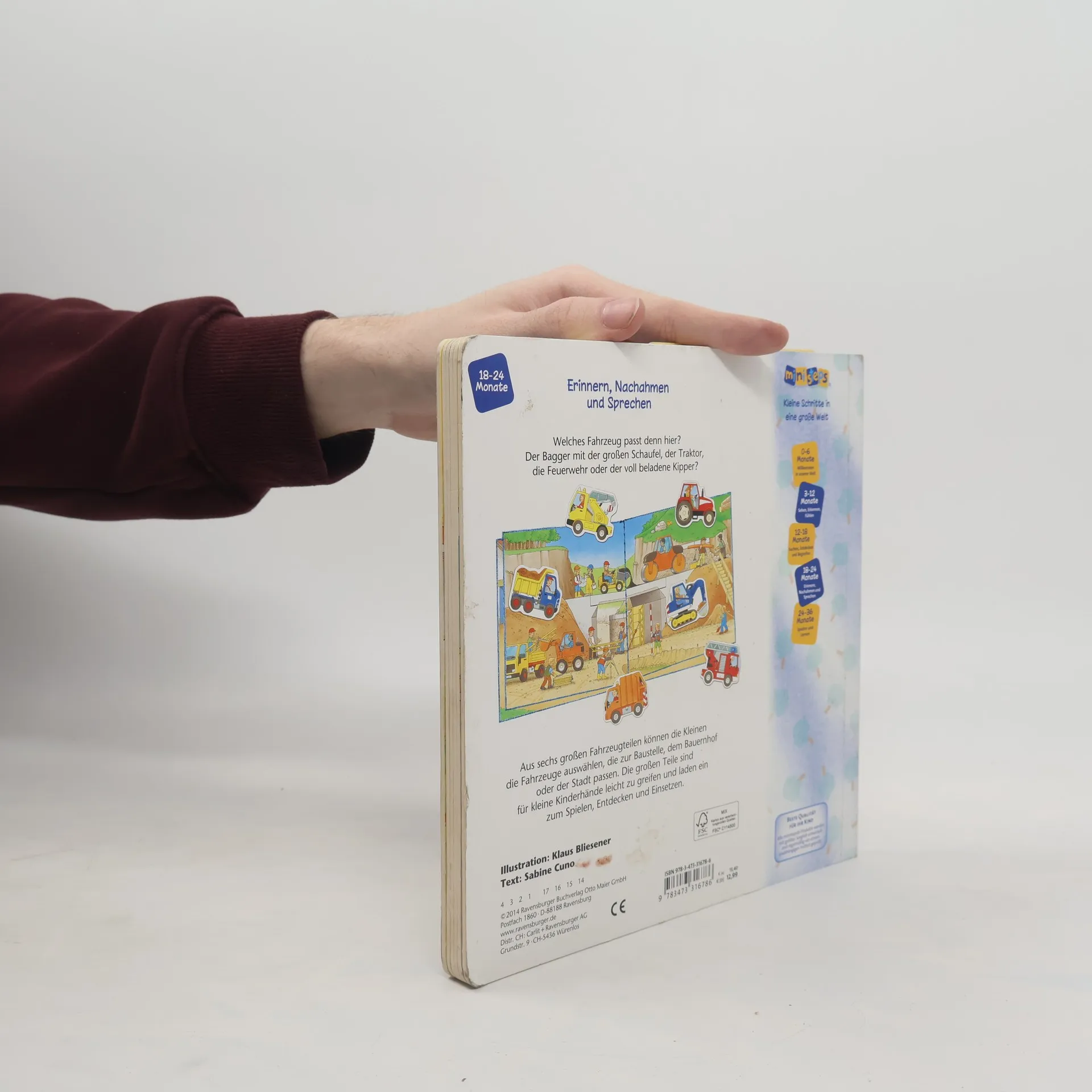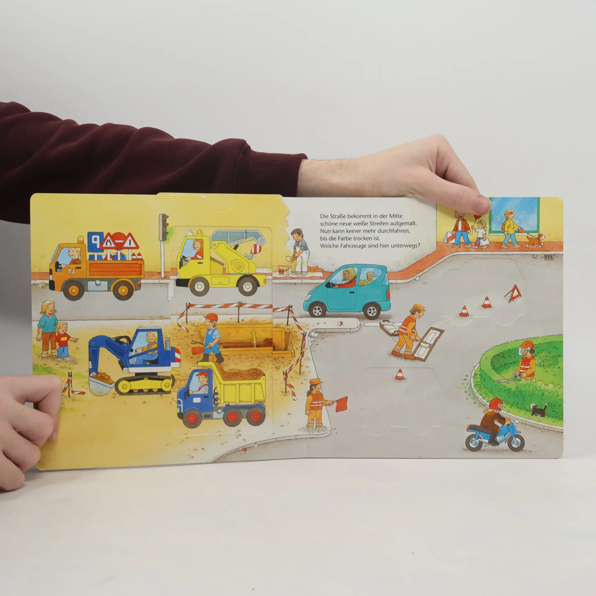 Sechs stabile Fahrzeug-Puzzleteile bringen großen Spielspaß in die detailreichen Bilderbuchszenen. Ob Bagger, Traktor oder Müllabfuhr - alle Fahrzeuge haben ihren vorgesehenen Platz und können von Kindern ab 18 Monaten kinderleicht auf verschiedenen Seiten eingesetzt werden. Das fördert spielerisch Kreativität und Geschicklichkeit der Kinder. Gleichzeitig regt es die Kleinen zum Geschichtenerzählen an. Wo ist der Traktor, um den Heuwagen zum Bauernhof zu ziehen? Und wer bringt die Feuerwehr zum brennenden Haus? Kinder ab 18 Monaten können aus 6 stabilen Puzzleteilen passende Fahrzeuge auswählen und sie in die passende Szene einsetzen. Dank der Spielfahrzeuge werden die Geschichten lebendig und laden mit Mitspielen und Erzählen ein. Wo gehört der Bagger hin und wo wird das Müllauto gebraucht? Im interaktiven Spiel mit den Fahrzeugen schulen Kleinkinder spielerisch ihre Geschicklichkeit und Feinmotorik. Gleichzeitig regt es ihre Fantasie an und fördert ganz nebenbei den Spracherwerb der Kleinen. So liegen bei diesem Fahrzeugbuch Spielen und Lernen ganz eng zusammen. Dieses Spielbuch ist genau auf die Entwicklung von Kleinkindern abgestimmt. Es wurde von Pädagogen entwickelt und fördert Kinder altersgerecht und mit viel Spaß!