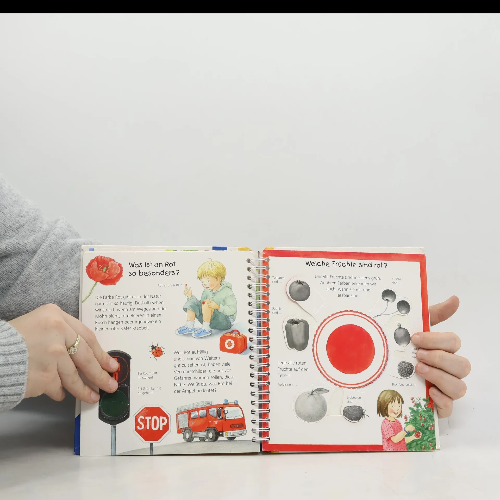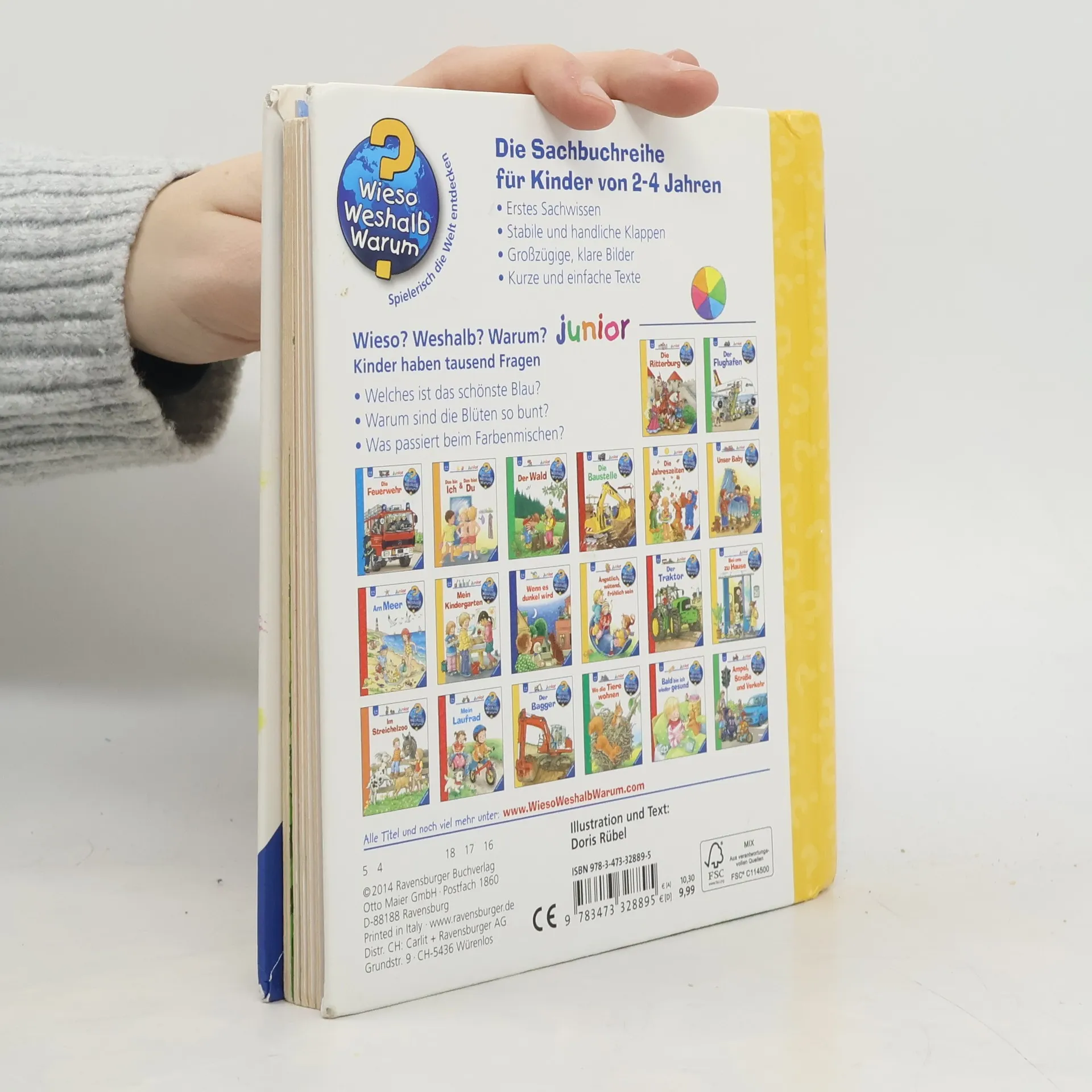 Welche Farbe hat der Himmel? Welche Früchte sind rot? In diesem Buch lernen Kinder die Farben kennen und werden dazu ermuntert, sie in ihrem Alltag wiederzufinden. Auch hinter Klappen gibt es Spannendes zu entdecken: Der Himmel ist nicht immer blau, rote Früchte sind anfangs oft grün, und wenn Blumen ihre Kelche öffnen, wird die grüne Wiese bunt. Für interaktiven Spielspaß sorgen zahlreiche Zuordnungs- und Ratespiele sowie eine Drehscheibe, mit der Farben gemischt werden können. Wieso? Weshalb? Warum? junior Die Sachbuchreihe für Kinder von 2-4 Jahren Jeden Tag entdecken Kinder etwas Neues – und haben viele Fragen. Wann kommt die Feuerwehr? Was machen die Tiere im Winter? Warum muss ich Zähne putzen? Die beliebte Sachbuchreihe Wieso? Weshalb? Warum? junior beantwortet die Fragen der Kinder auf Augenhöhe. Sie beleuchtet unterschiedlichste Themen aus ihrer Alltags- und Interessenswelt altersgerecht und mit viel Liebe zum Detail. Die Reihe ist speziell auf kleine Hände und die Bedürfnisse der Kleinsten angepasst. Klare und liebevolle Bilder, kurze Sachtexte sowie handliche Klappen, die Bewegungen veranschaulichen und überraschende und lustige Einblicke gewähren, ermöglichen Kindern, sich ihre Themen selbst zu erschließen. Der Spaß am eigenhändigen Entdecken, die liebevolle Umsetzung und die hochwertige Ausstattung garantieren langanhaltende Freude an jedem Buch.