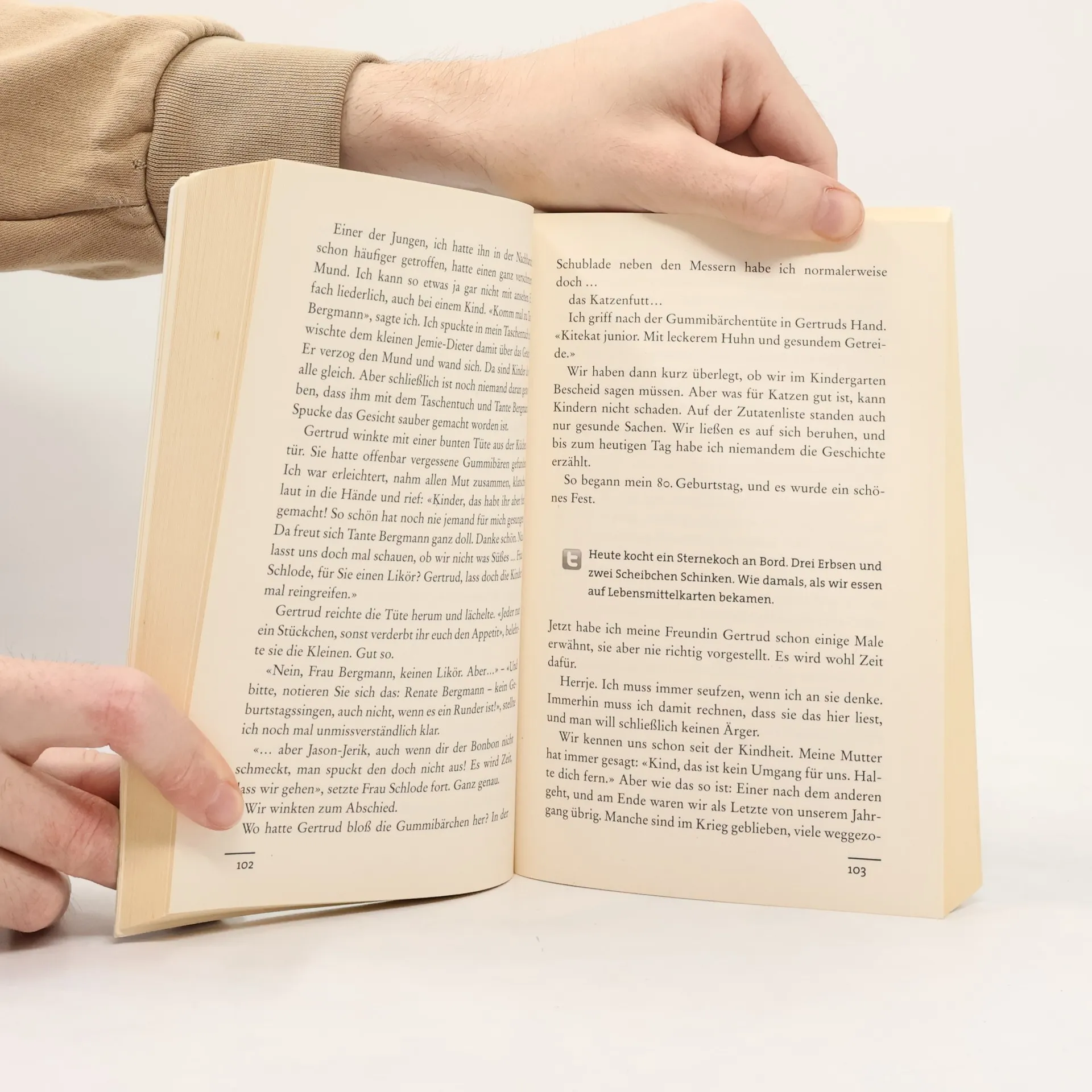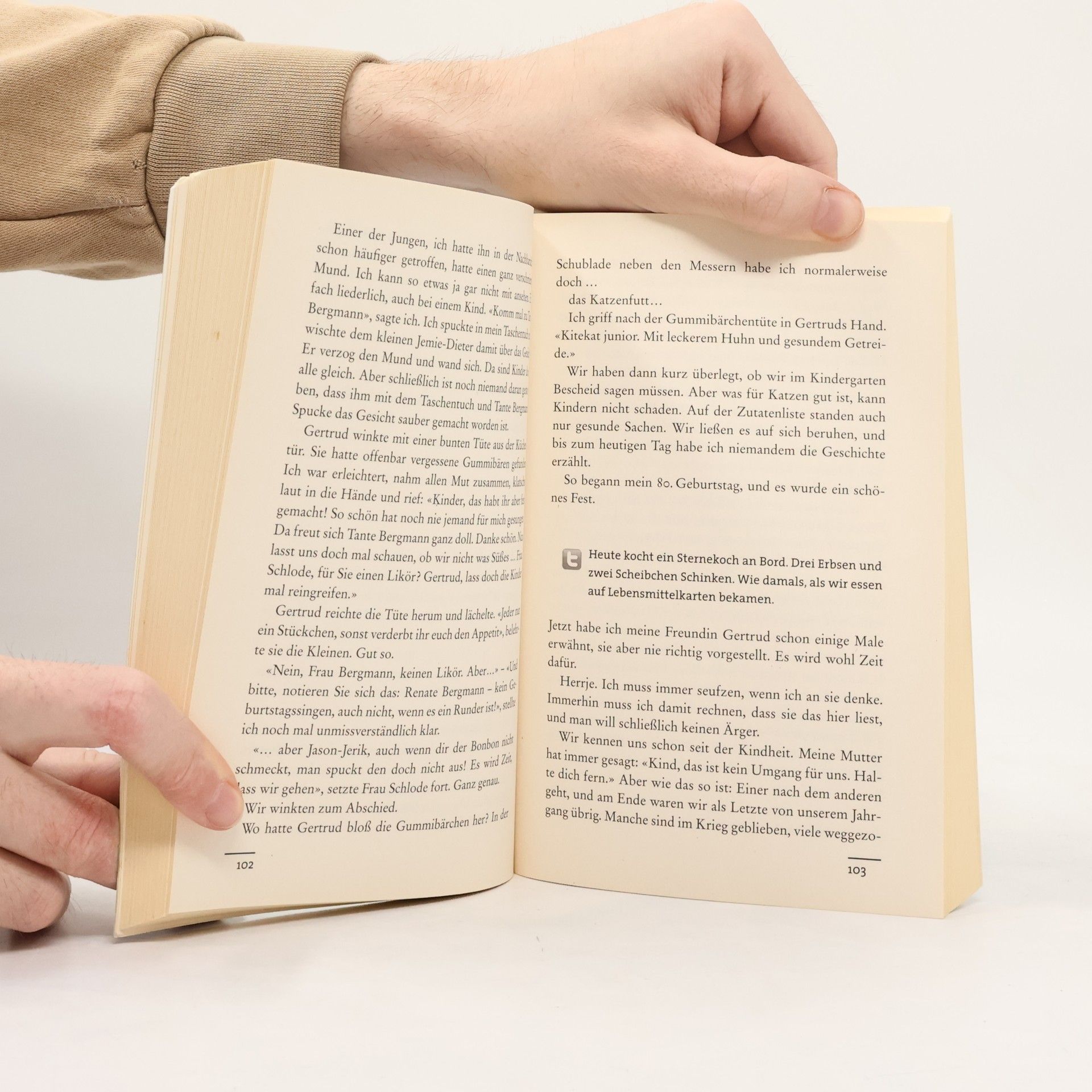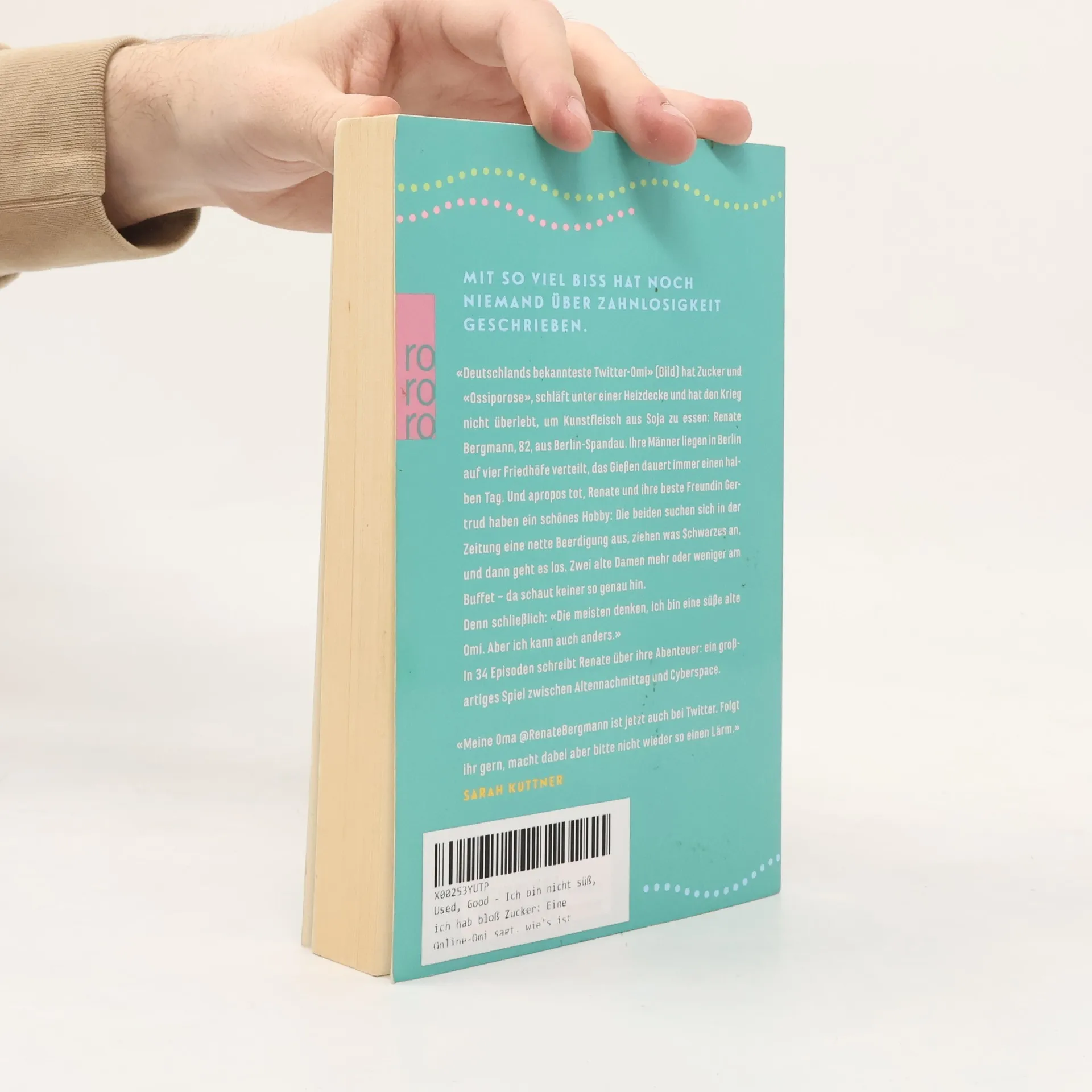Mit so viel Biss hat noch niemand über Zahnlosigkeit geschrieben. «Deutschlands bekannteste Twitter-Omi.» (Bild) hat Zucker und «Ossiporose», schläft unter einer Heizdecke und hat den Krieg nicht überlebt, um Kunstfleisch aus Soja zu essen.: Renate Bergmann 82, aus Berlin-Spandau. Ihre Männer liegen in Berlin auf vier Friedhöfe verteilt, das Gießen dauert immer einen halben Tag. Und à propos tot, Renate und ihre beste Freundin Gertrud haben ein schönes Hobby: Die beiden suchen sich in der Zeitung eine nette Beerdigung aus, ziehen was Schwarzes an, und dann geht es los. Zwei alte Damen mehr oder weniger am Buffet – da schaut keiner so genau hin. Denn schließlich: «Die meisten denken ich bin eine süße alte Omi. Aber ich kann auch anders. » In 34 Episoden schreibt Renate über ihre Abenteuer: Ein großartiges Spiel Altennachmittag und Cyberspace.